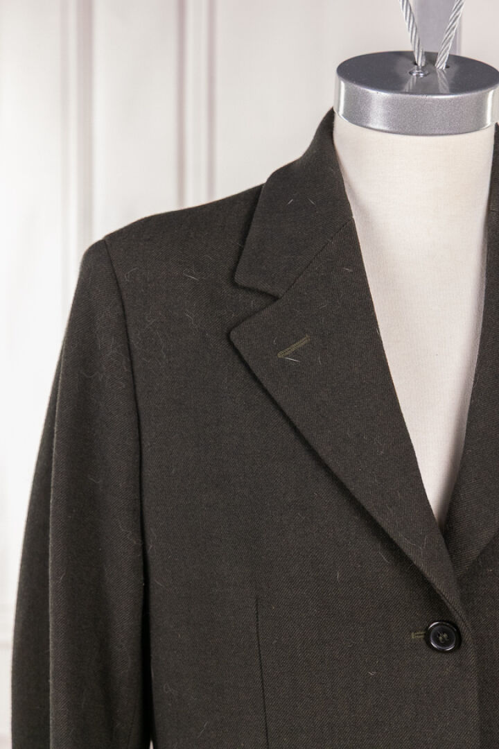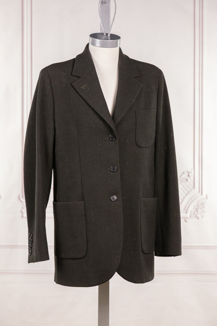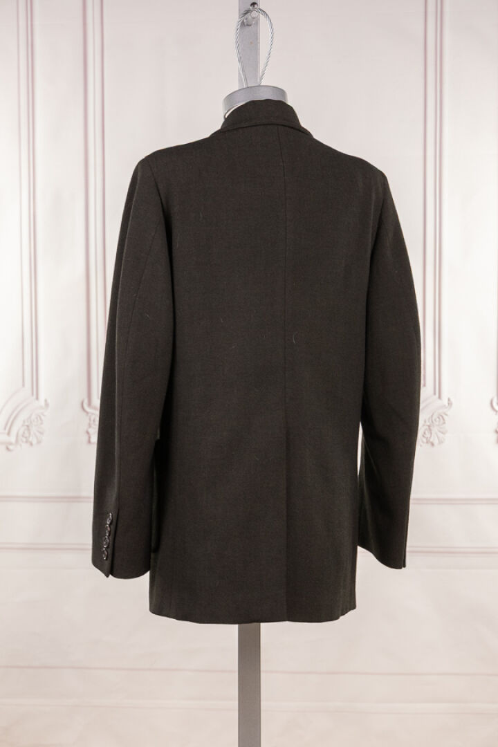 PRADA - Veste en lainage kaki foncé chiné noir, col cranté, simple boutonnage, trois poches plaquées, manches longues, fente au dos. Taille indiquée 42 soit 38 Trous, bouloches, traces de poils