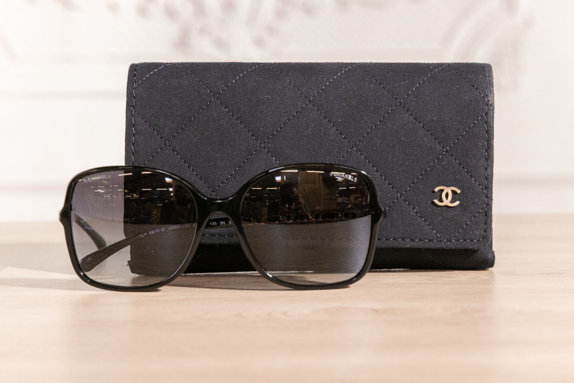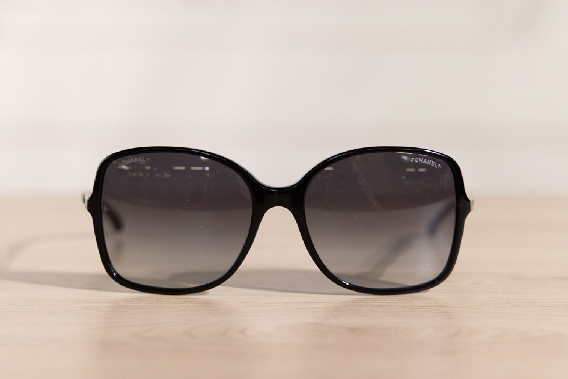 CHANEL - Paire de lunettes de soleil, acétate noir, branche chaine métal doré entrelacé de cuir. Dans leur étui. Très bon état