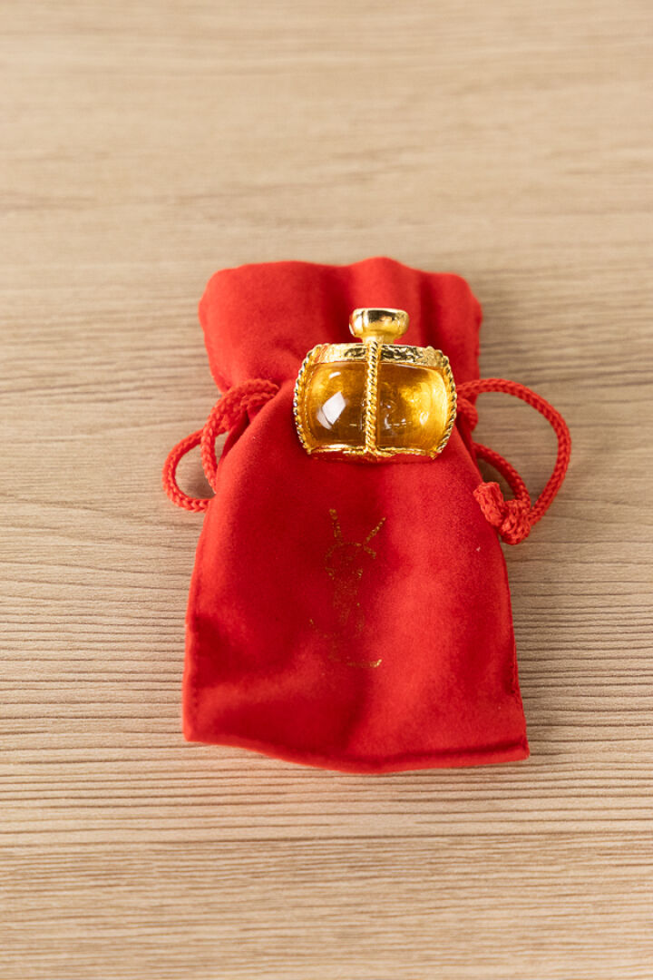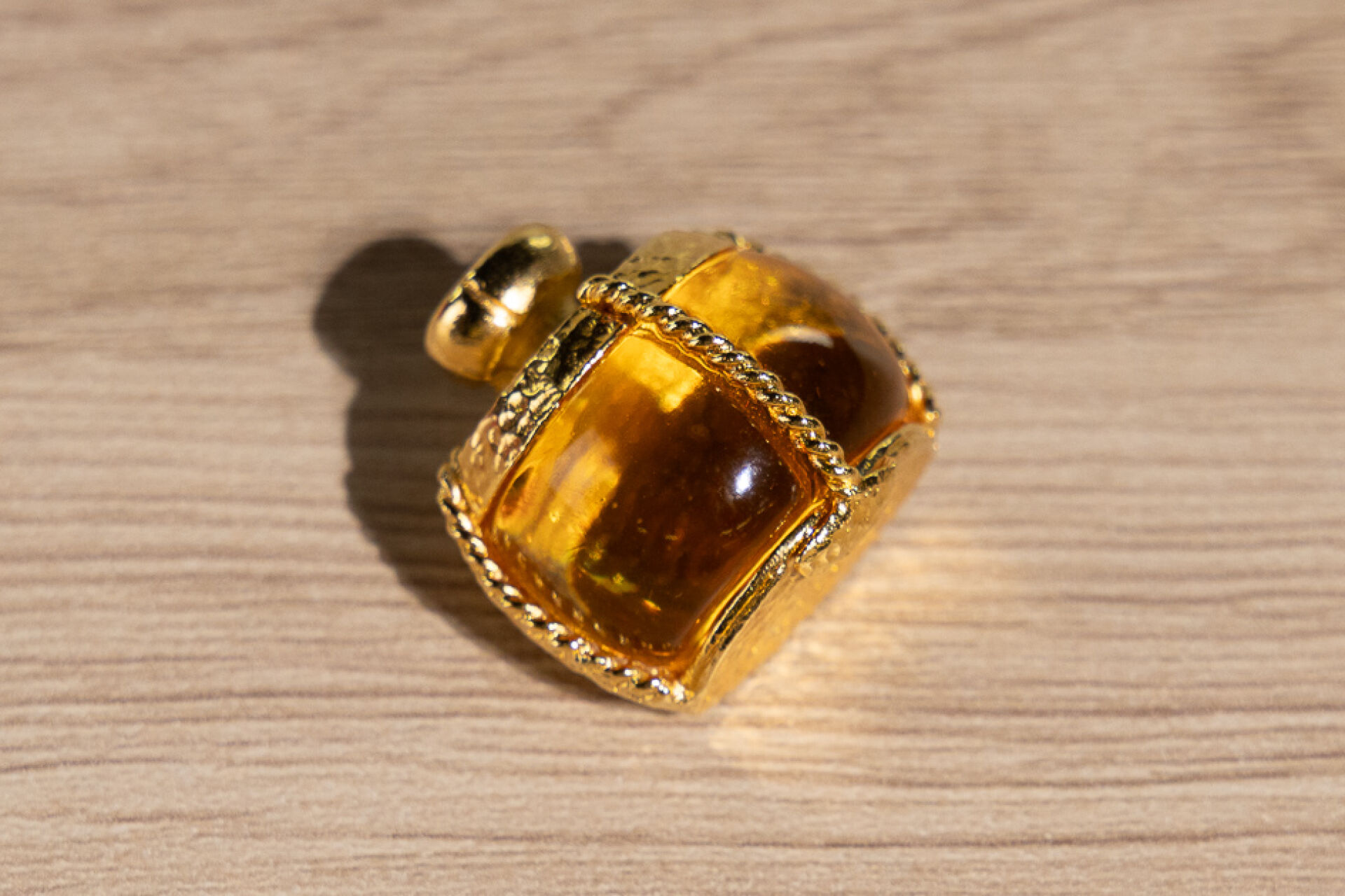 YVES SAINT LAURENT - Broche dite "Champagne" en métal doré et verre teinté orange pour le lancement du parfum du même nom. Signée du monogramme "YSL" entrelacé au dos. Modèle conçu dans les années 1980 Dimensions : 2,5 x 2,8 x 2,4 cm (environ)