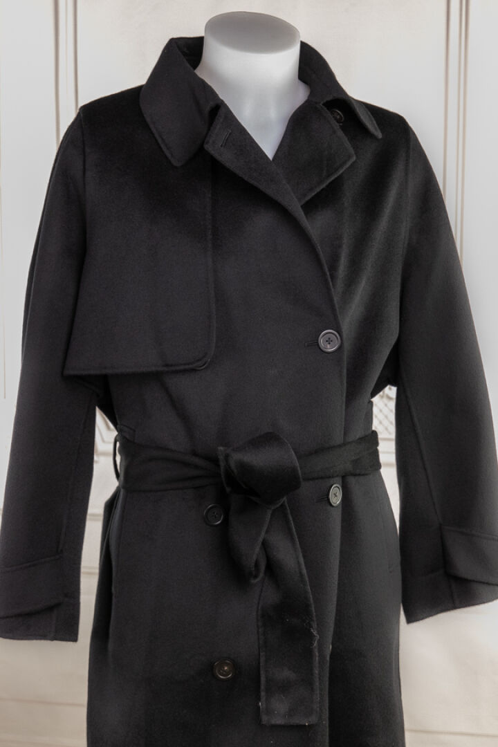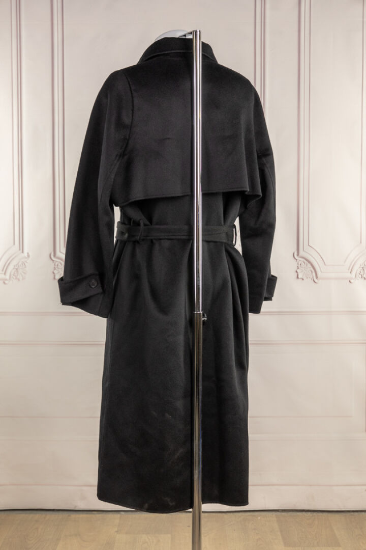 ERIC BOMPARD - Manteau en cachemire noir, col, bavolet devant gauche et dos, manches longues, simple boutonnage, deux poches verticales, ceinture, fente dos. Housse. Taille L-XL Non porté, étiquette d'origine