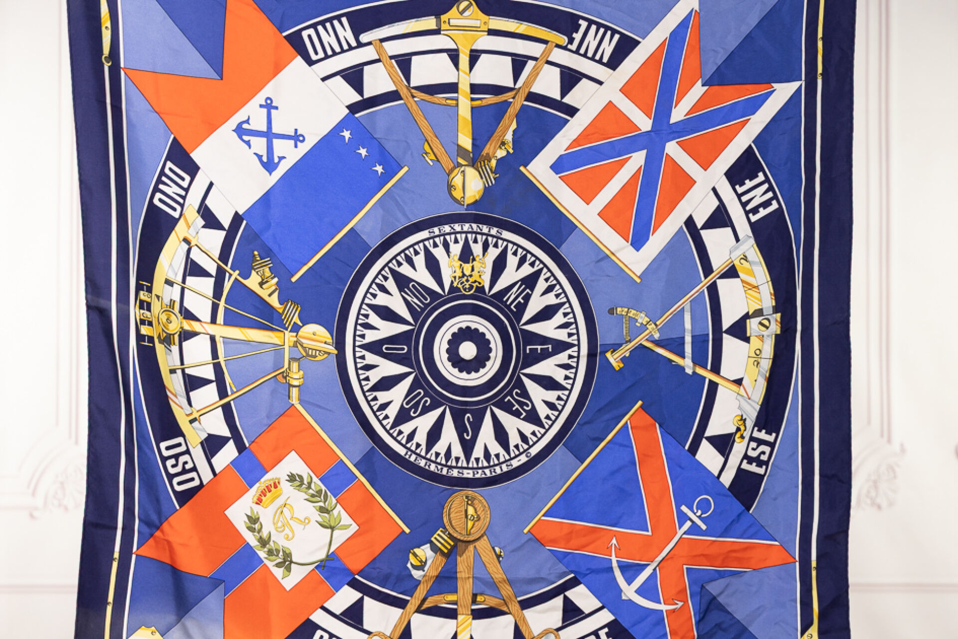 HERMES Paris - Carré en twill de soie imprimé titré "Sextants", à dominantes bleu, rouge, doré, marine, blanc. 90 x 90 cm Quelques traces, fils tirés et décolorations