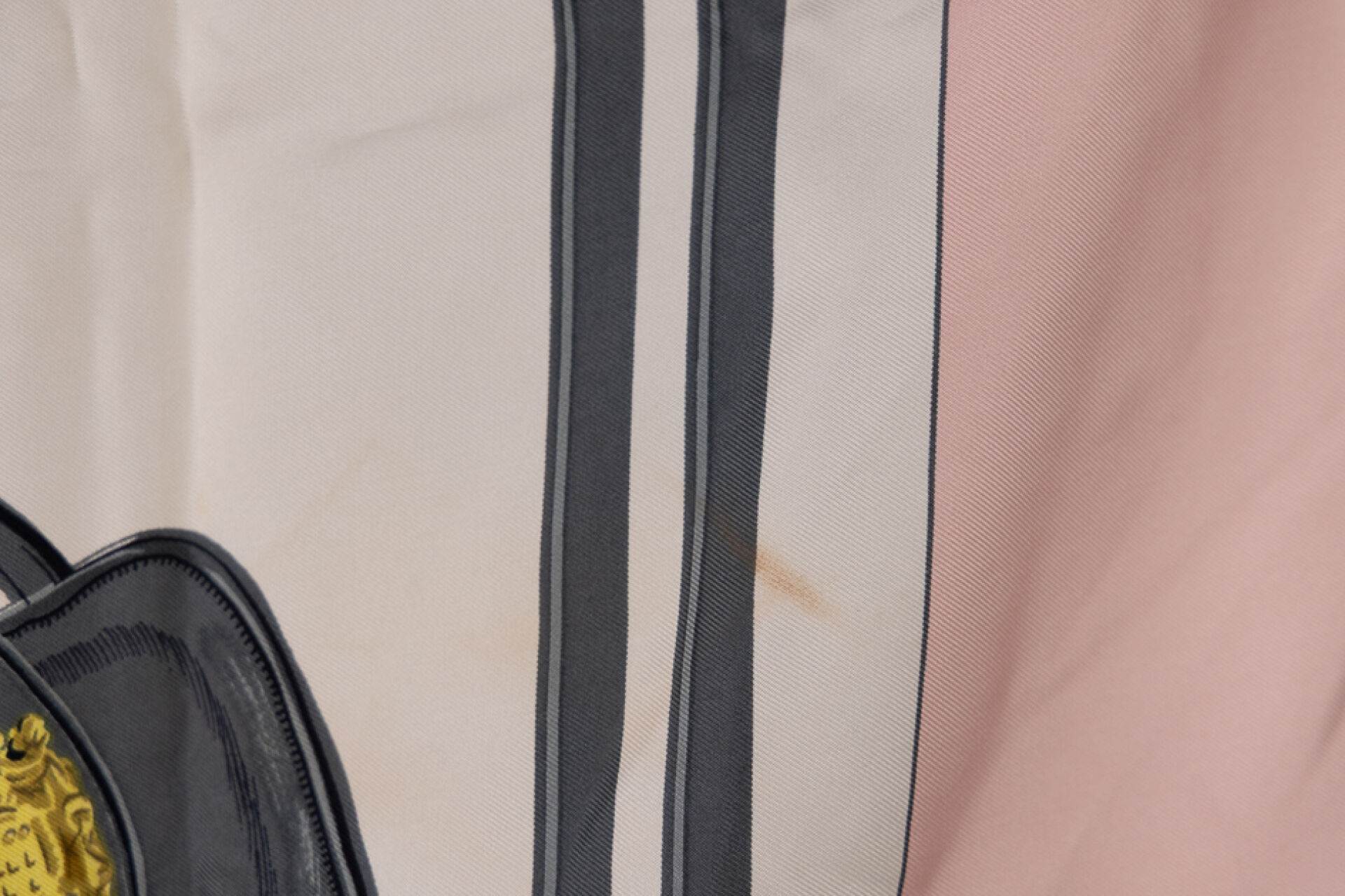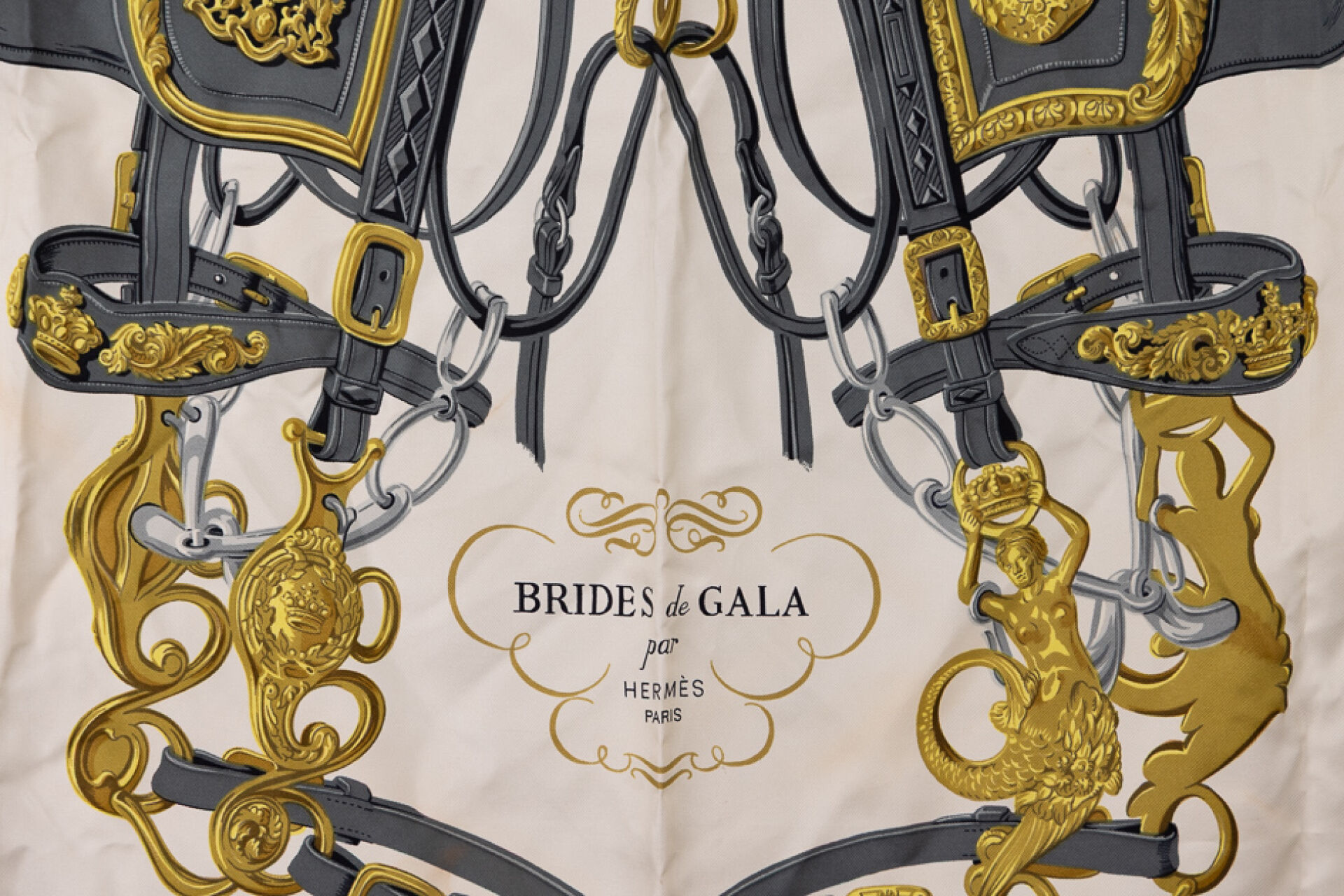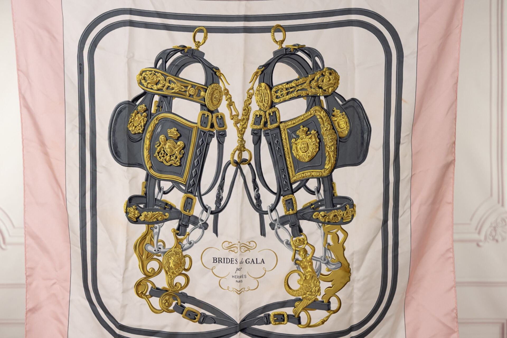 HERMES Paris - Carré en twill de soie imprimé titré "Brides de Gala", à dominante gris, or sur fond blanc et bord rose. 90 x 90 cm Quelques fils tirés et petites taches
