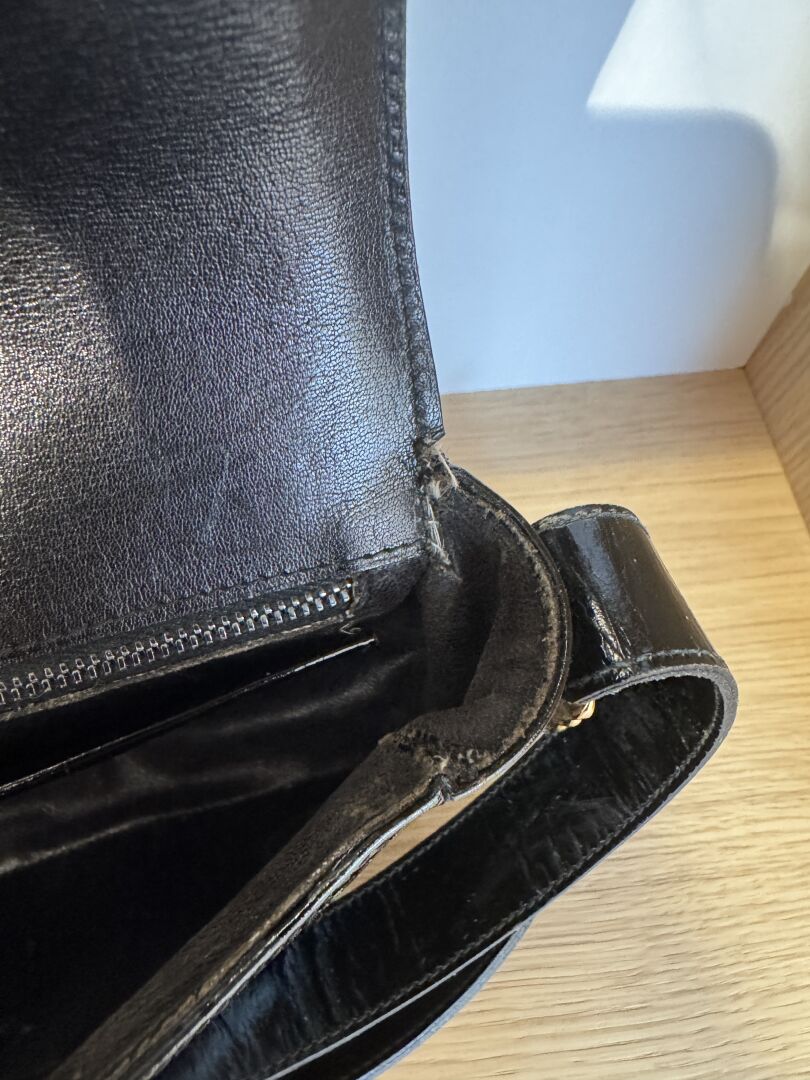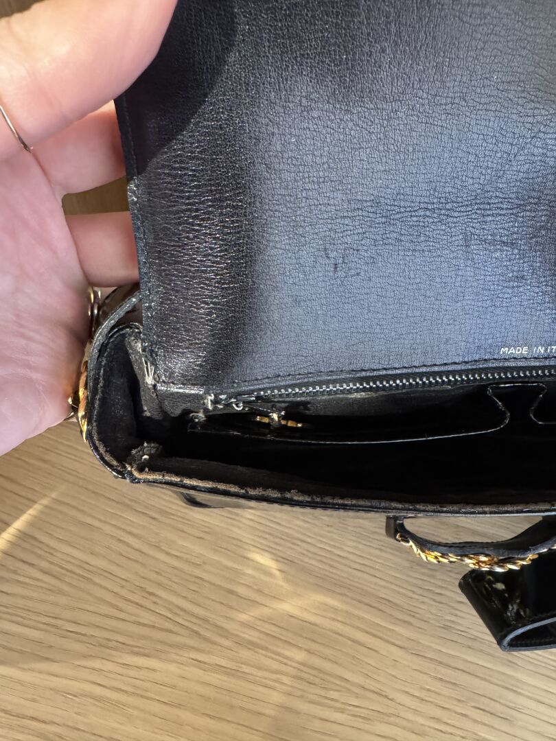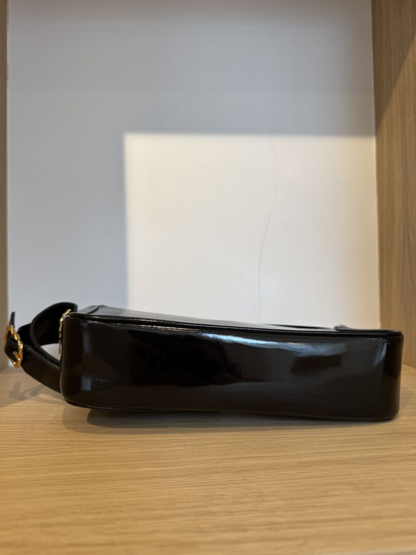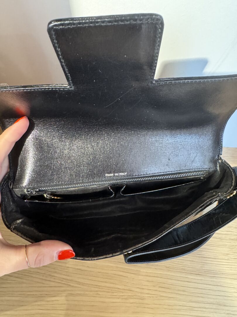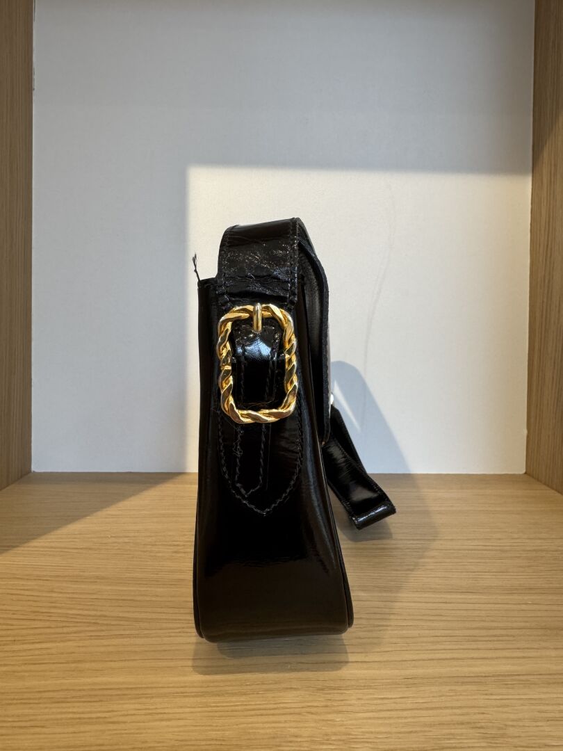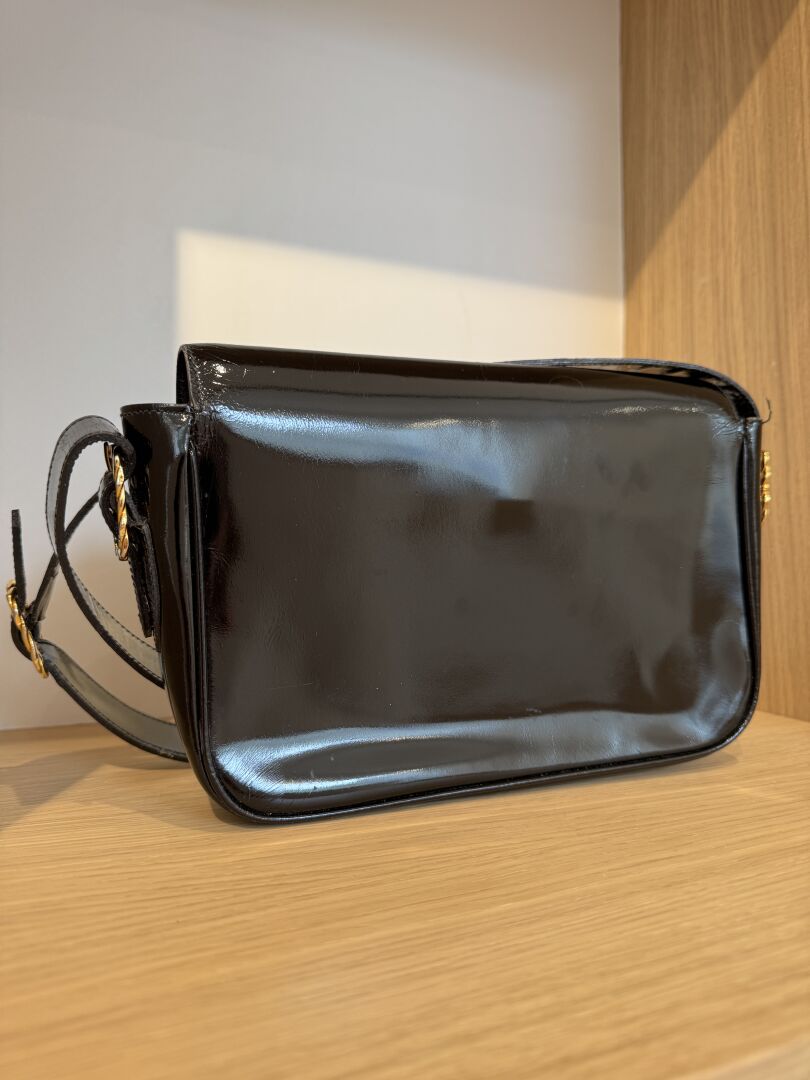 CELINE, circa 1970 - Sac à rabat, cuir vernis noir, anse épaule, accastillage métal doré, motifs tressés, poche zippée intérieure. Haut. : 16 cm - Long. : 22,5 cm Etat d'usage, traces et petites craquelures, usures aux coutures