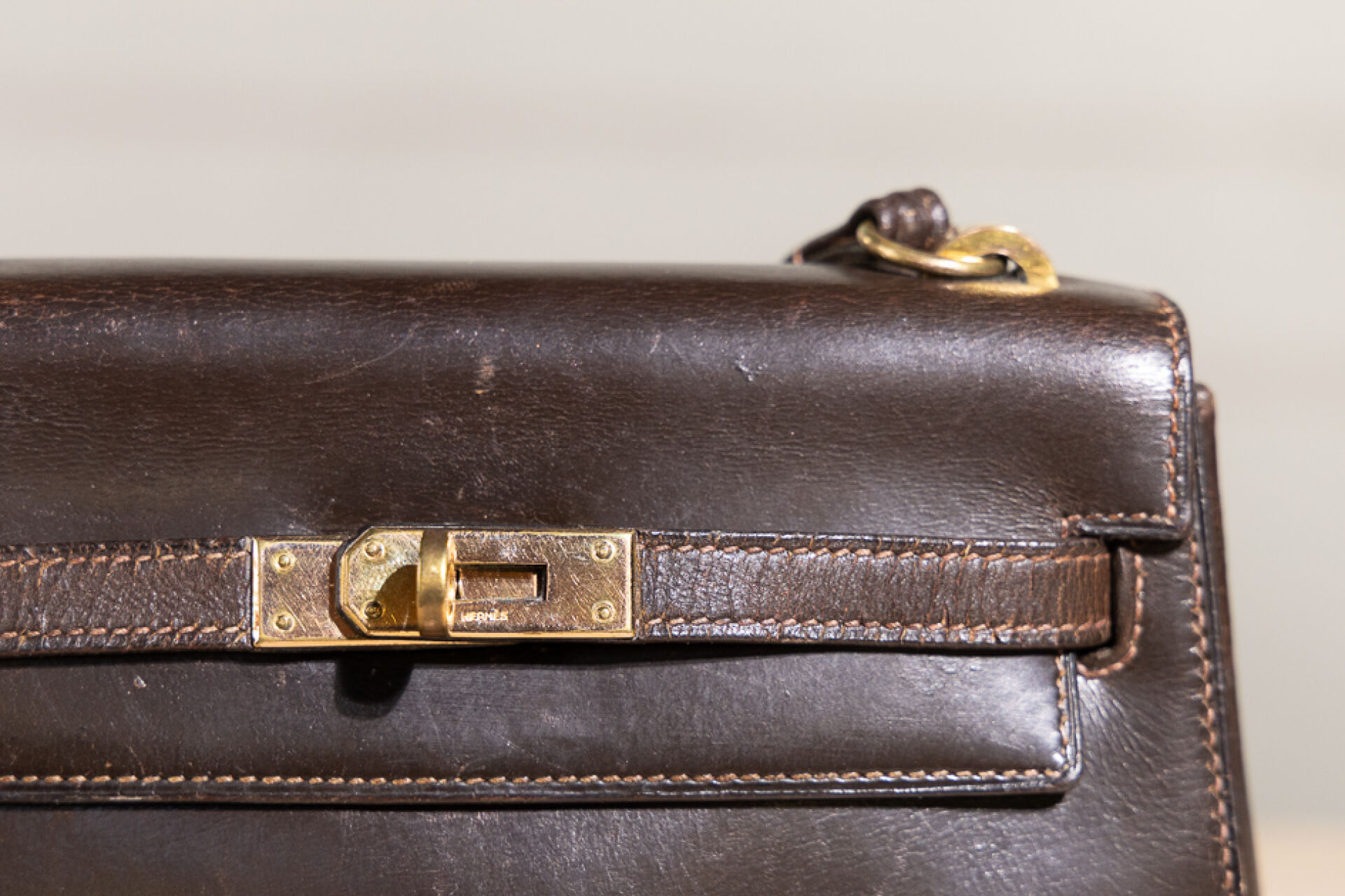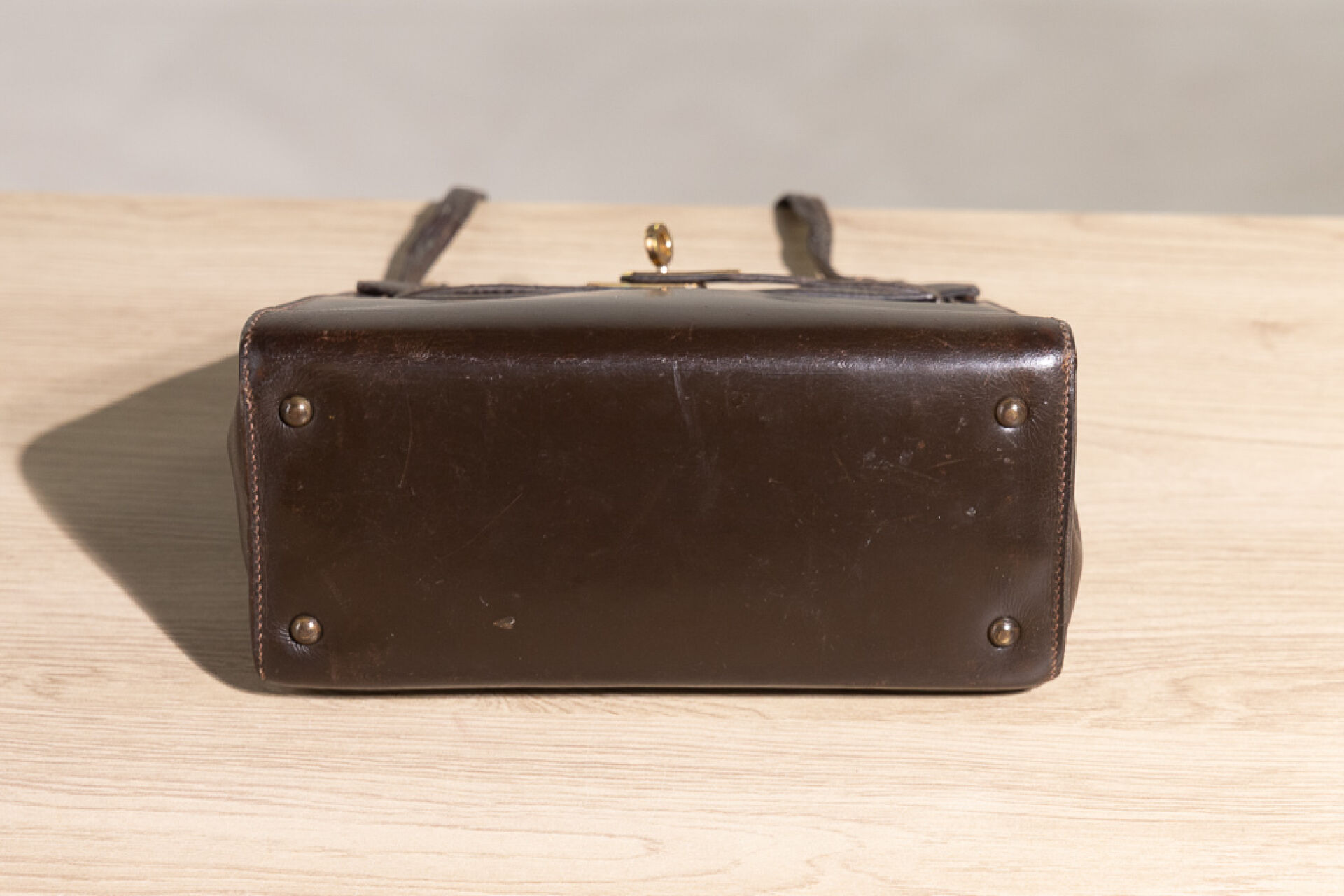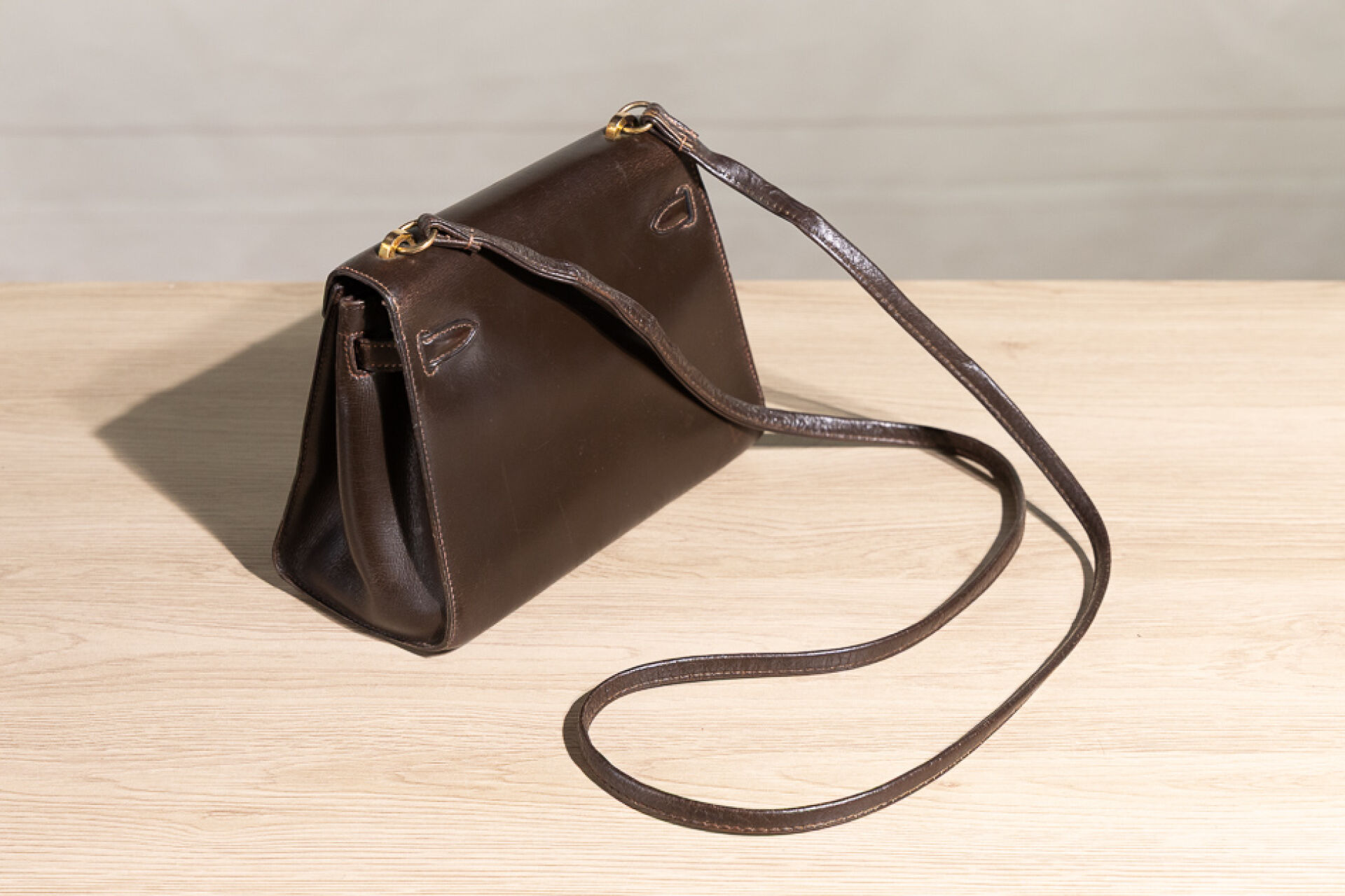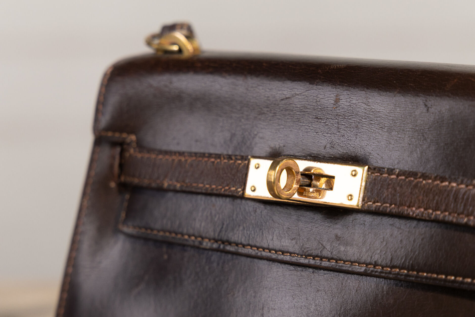 HERMES Paris circa 1958 - Sac "Mini Kelly" sellier en cuir chocolat, accastillage métal doré, anse bandoulière (non d'origine). Haut. : 15 cm - Long. : 20 cm Bon état général, usures, sac restauré en dehors des ateliers de la Maison