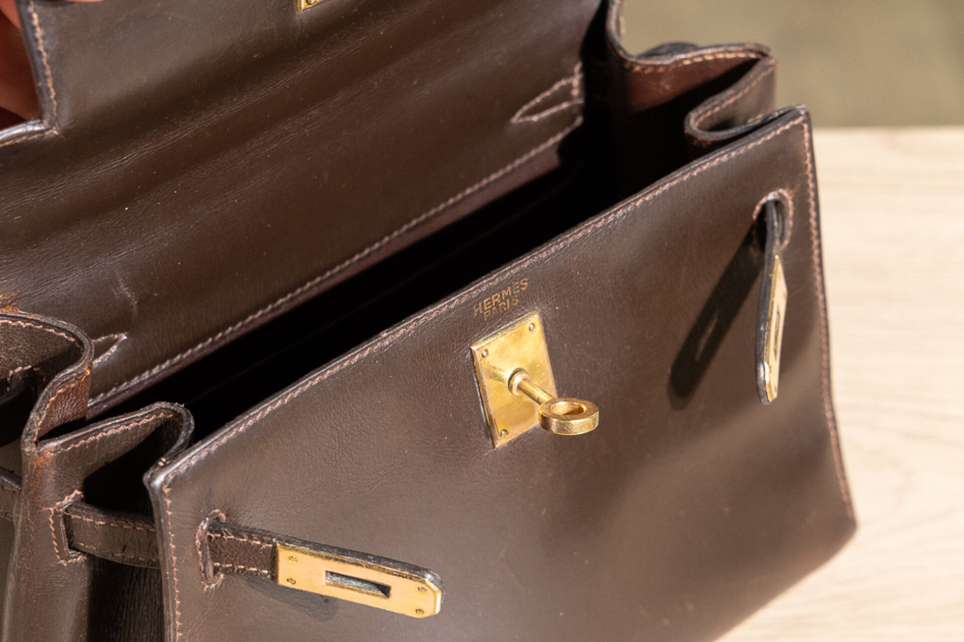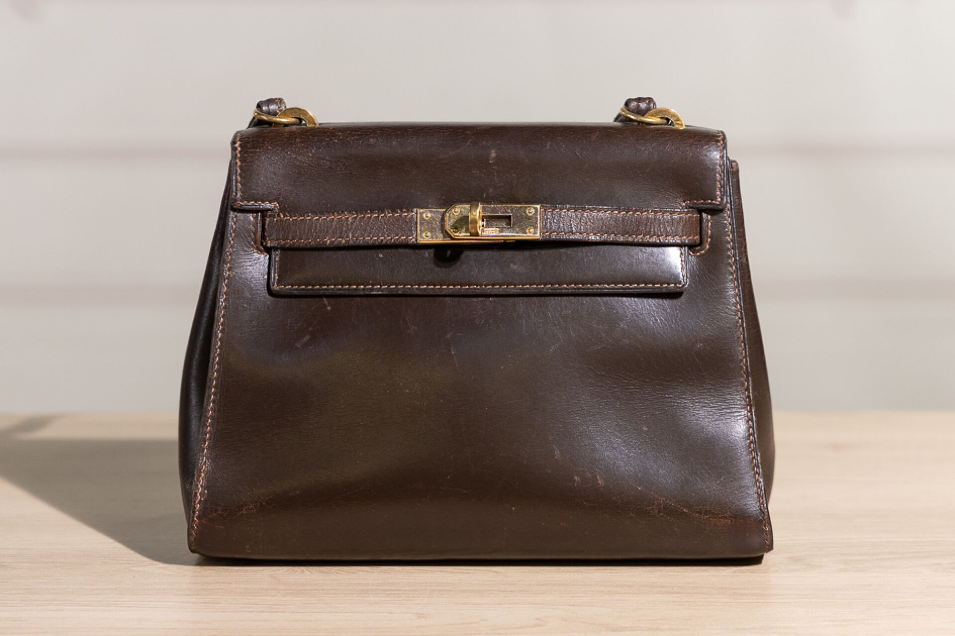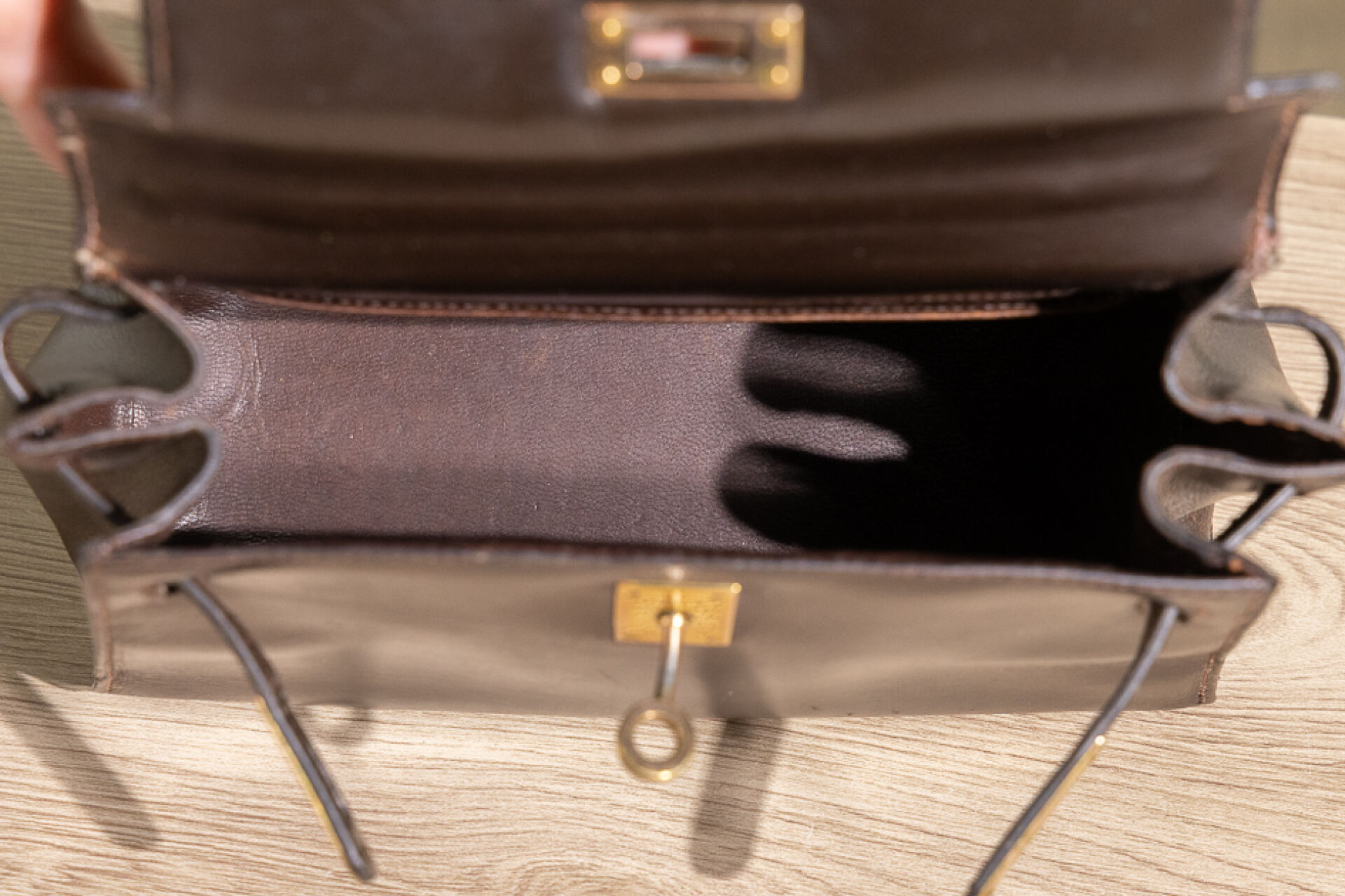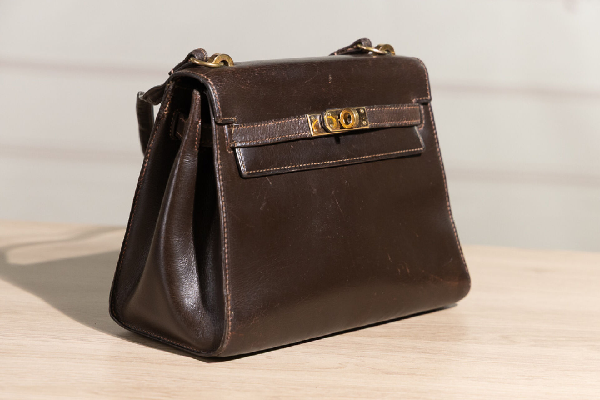 HERMES Paris circa 1958 - Sac "Mini Kelly" sellier en cuir chocolat, accastillage métal doré, anse bandoulière (non d'origine). Haut. : 15 cm - Long. : 20 cm Bon état général, usures, sac restauré en dehors des ateliers de la Maison
