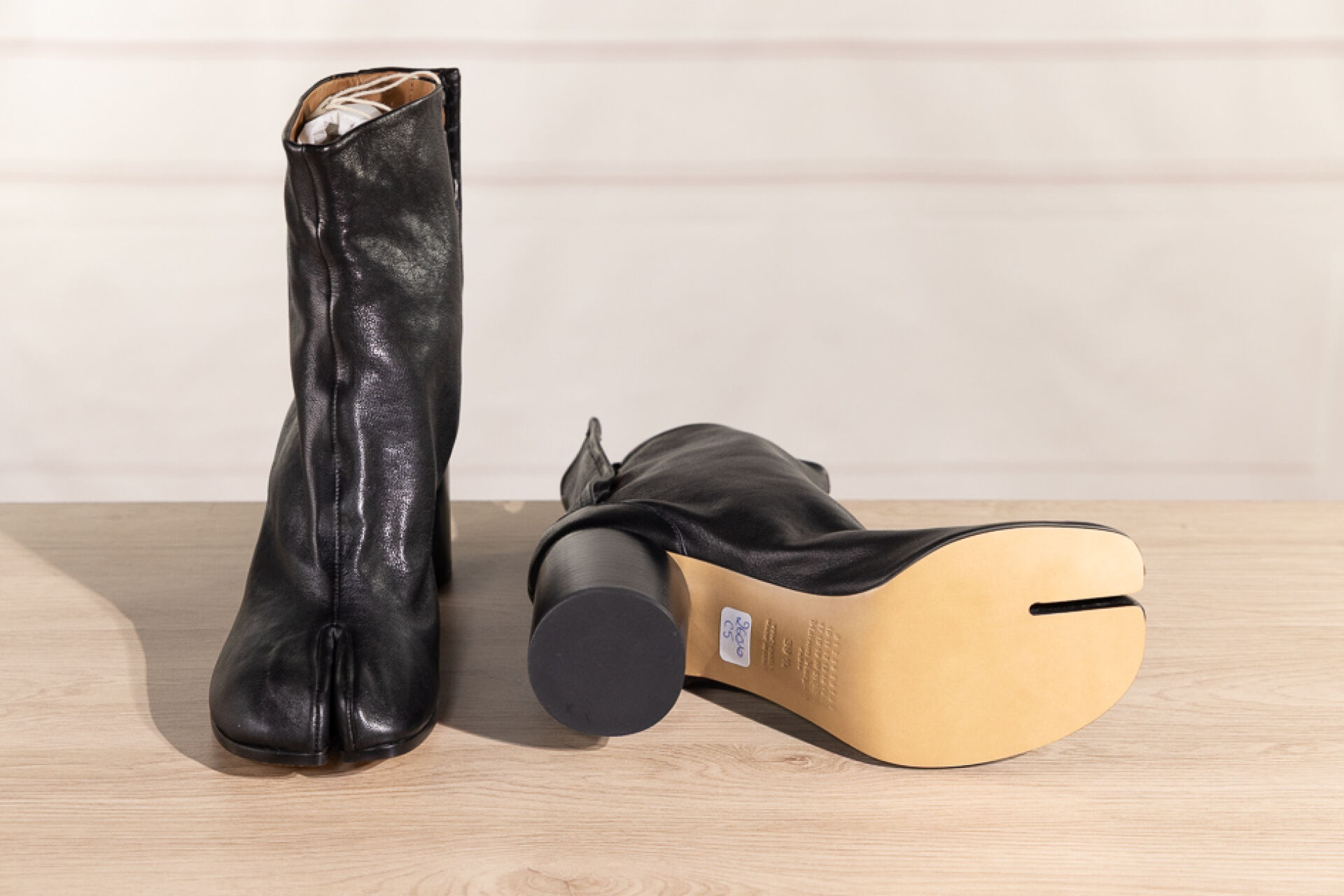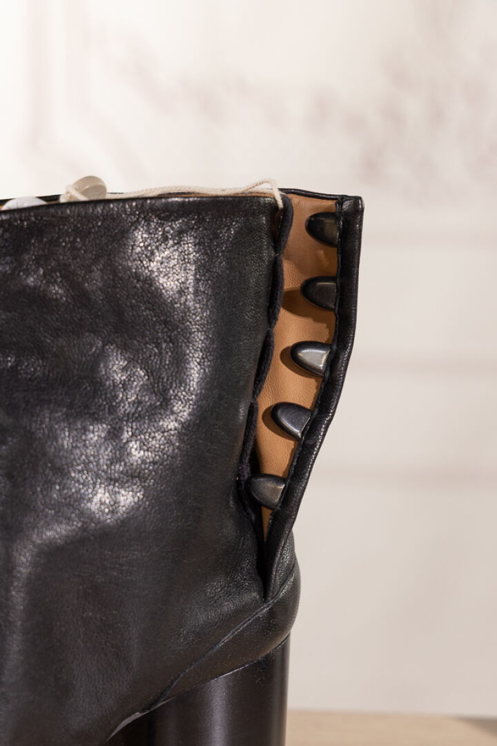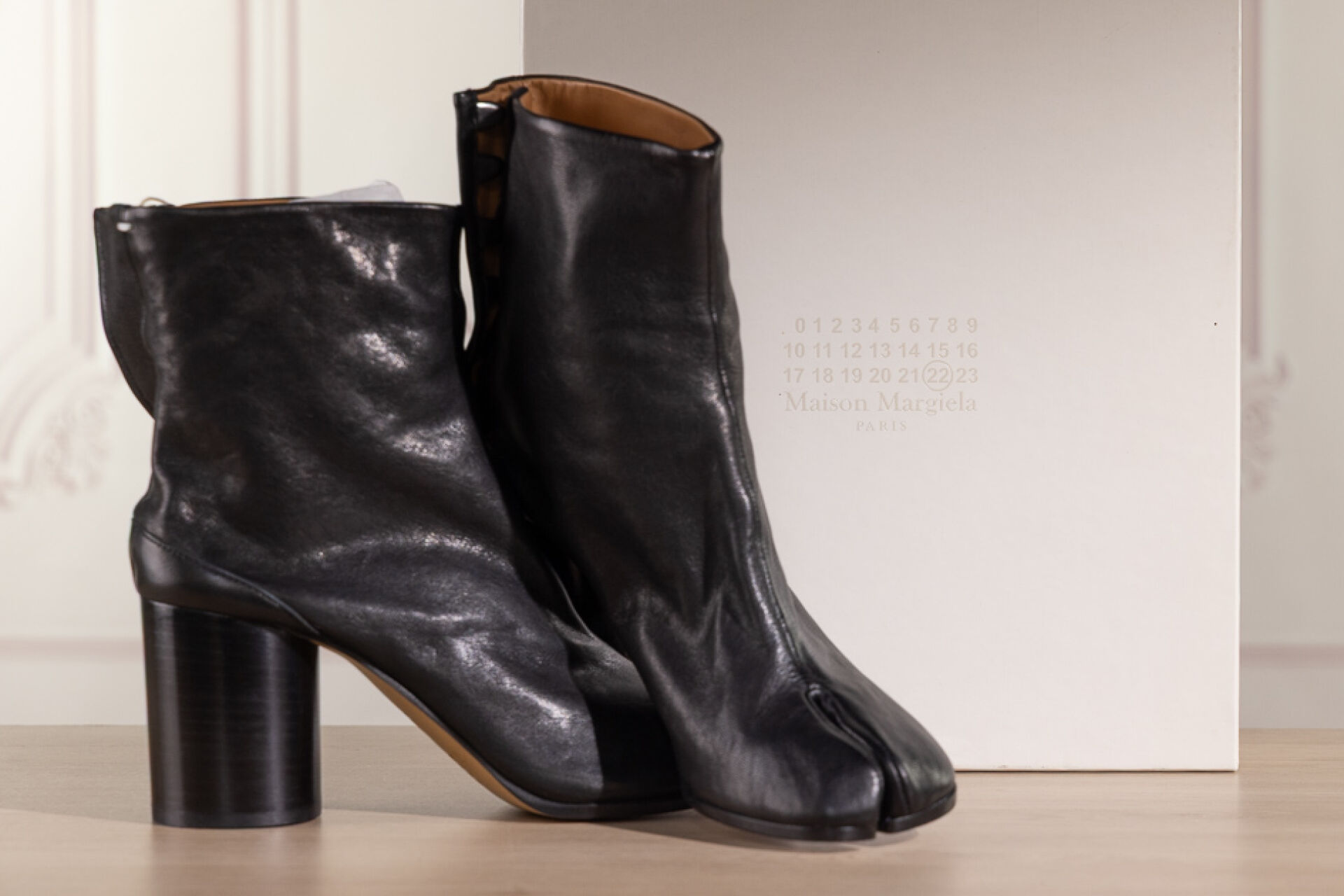 MAISON MARGIELA Ligne 22 - Paire de bottines "Tabi" en cuir noir, talon, fermeture crochets sous patte. Boite. Pointure 39,5 - Haut. du talon : 8 cm Non portées