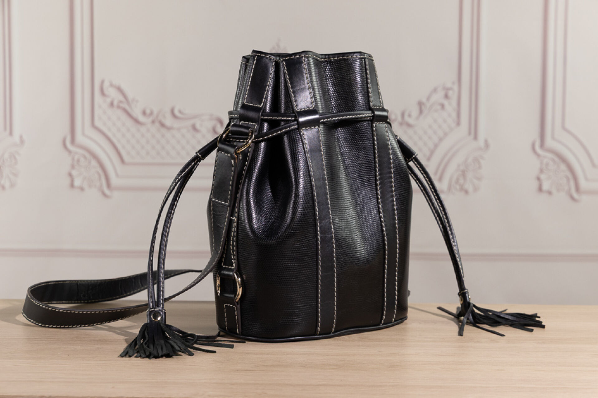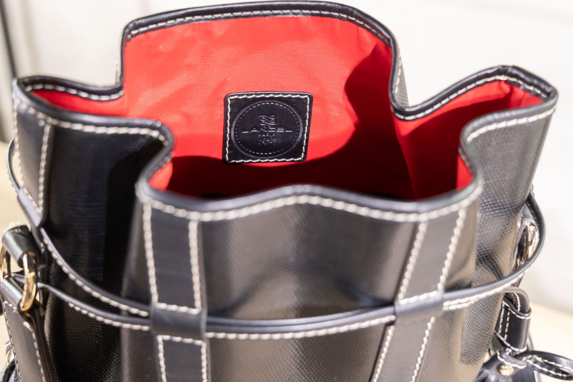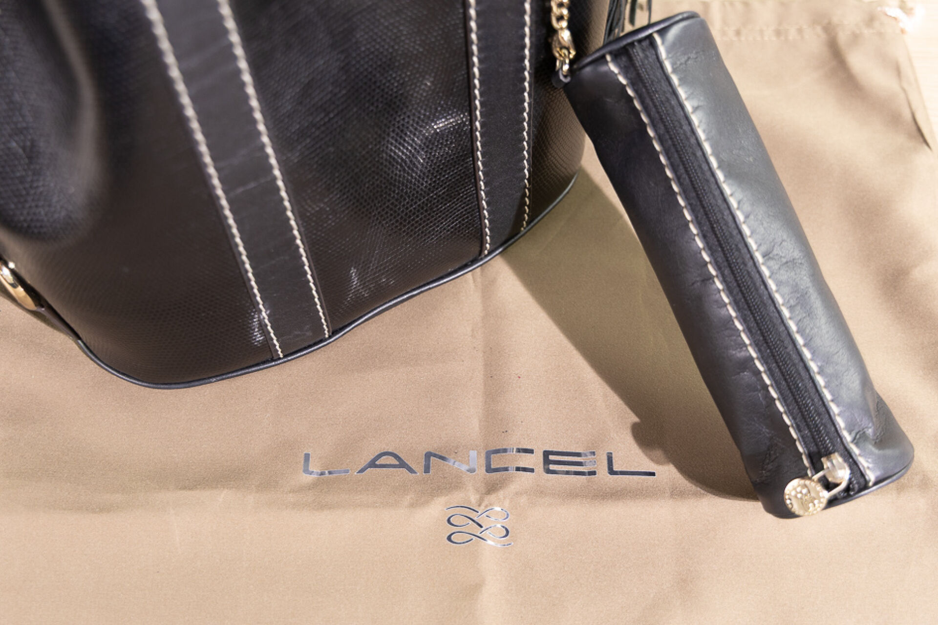 LANCEL - Sac seau en cuir noir, surpiqures blanches, intérieur doublé de tissu rouge. Dust bag. Haut : 32 cm - Long. : 24 cm. Très bon état, légères griffures