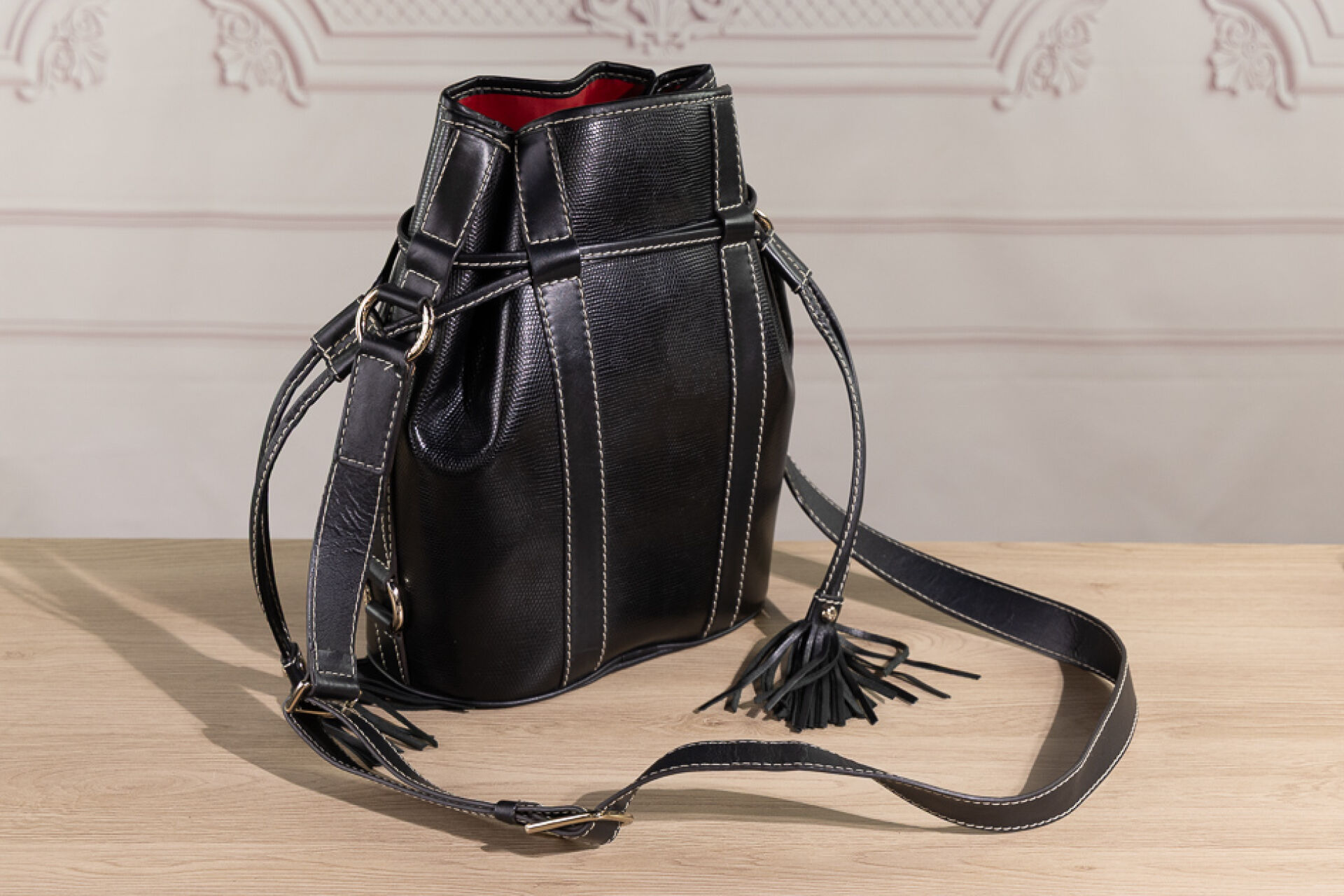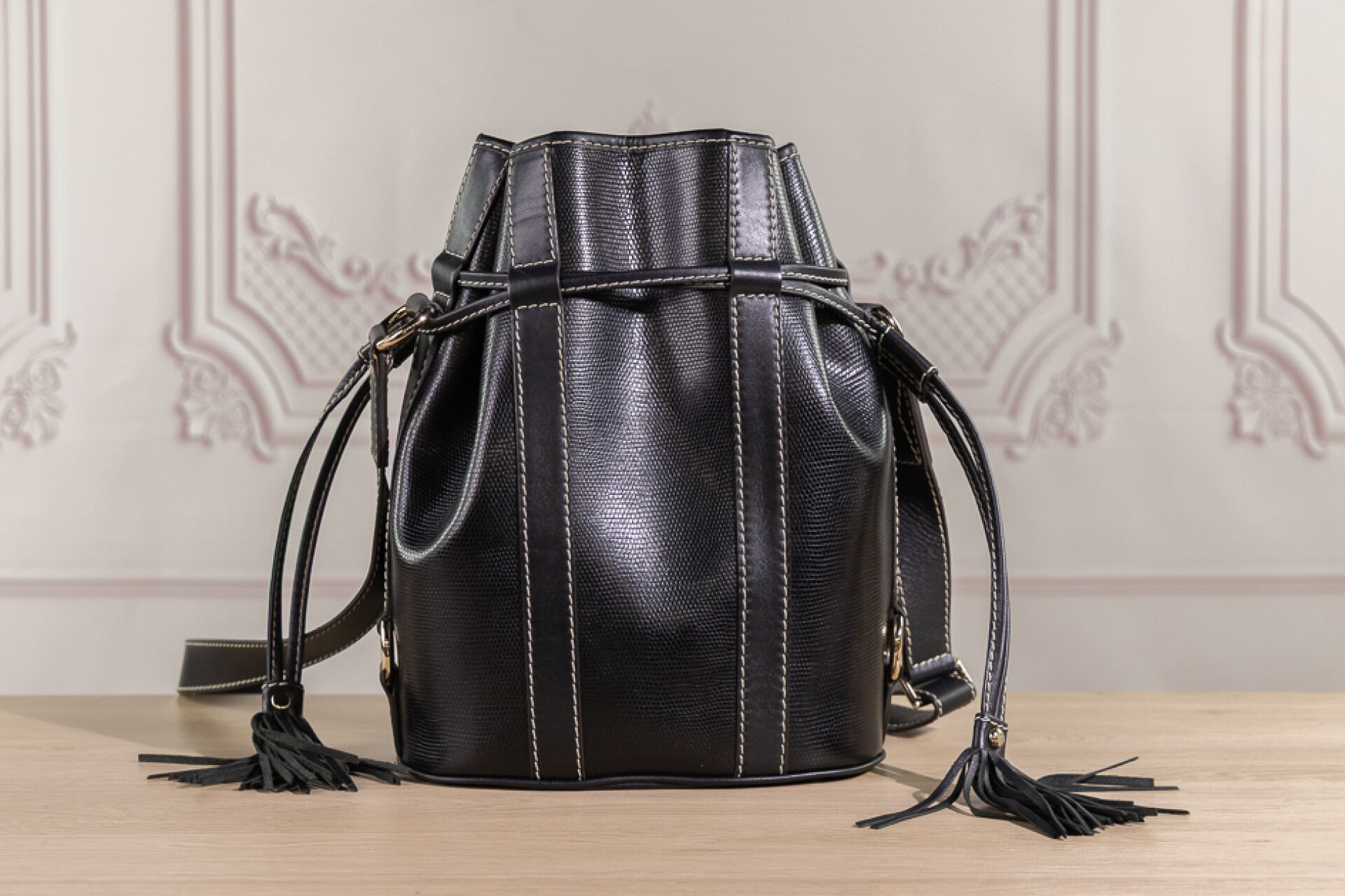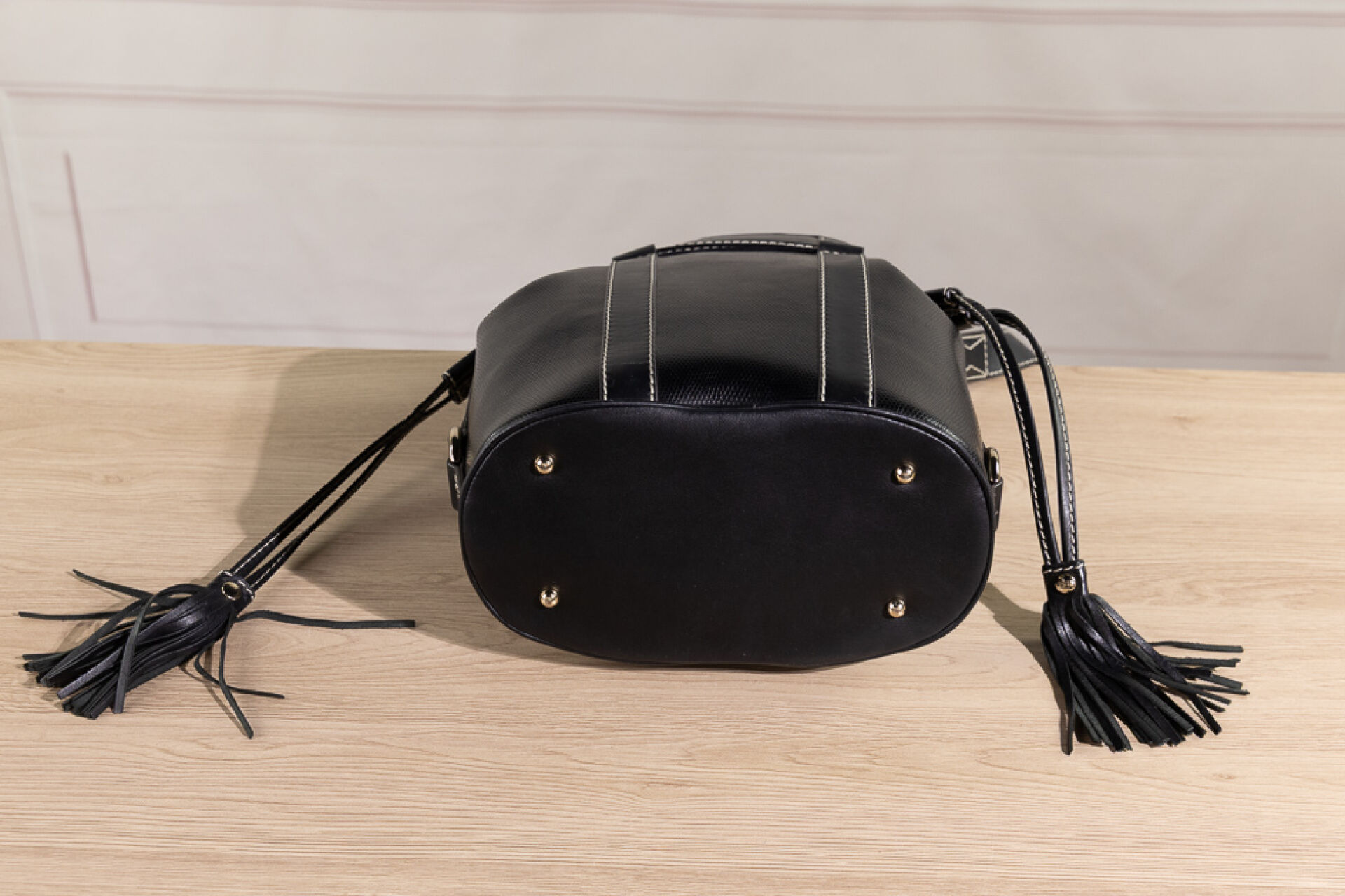 LANCEL - Sac seau en cuir noir, surpiqures blanches, intérieur doublé de tissu rouge. Dust bag. Haut : 32 cm - Long. : 24 cm. Très bon état, légères griffures