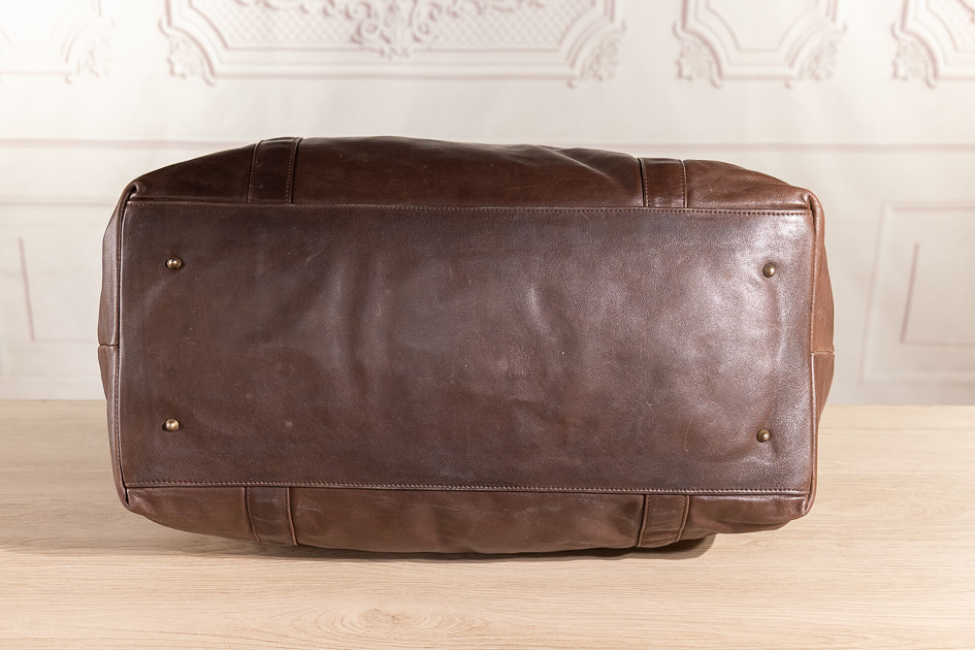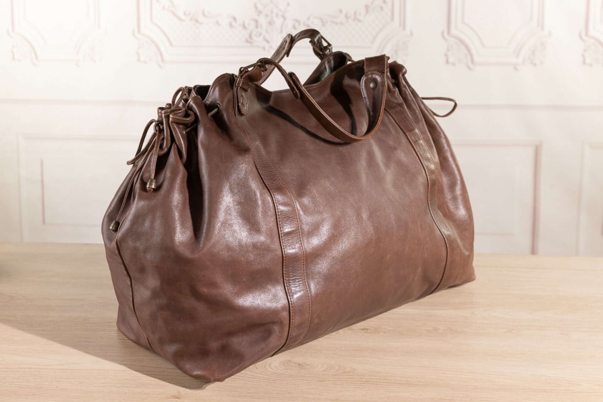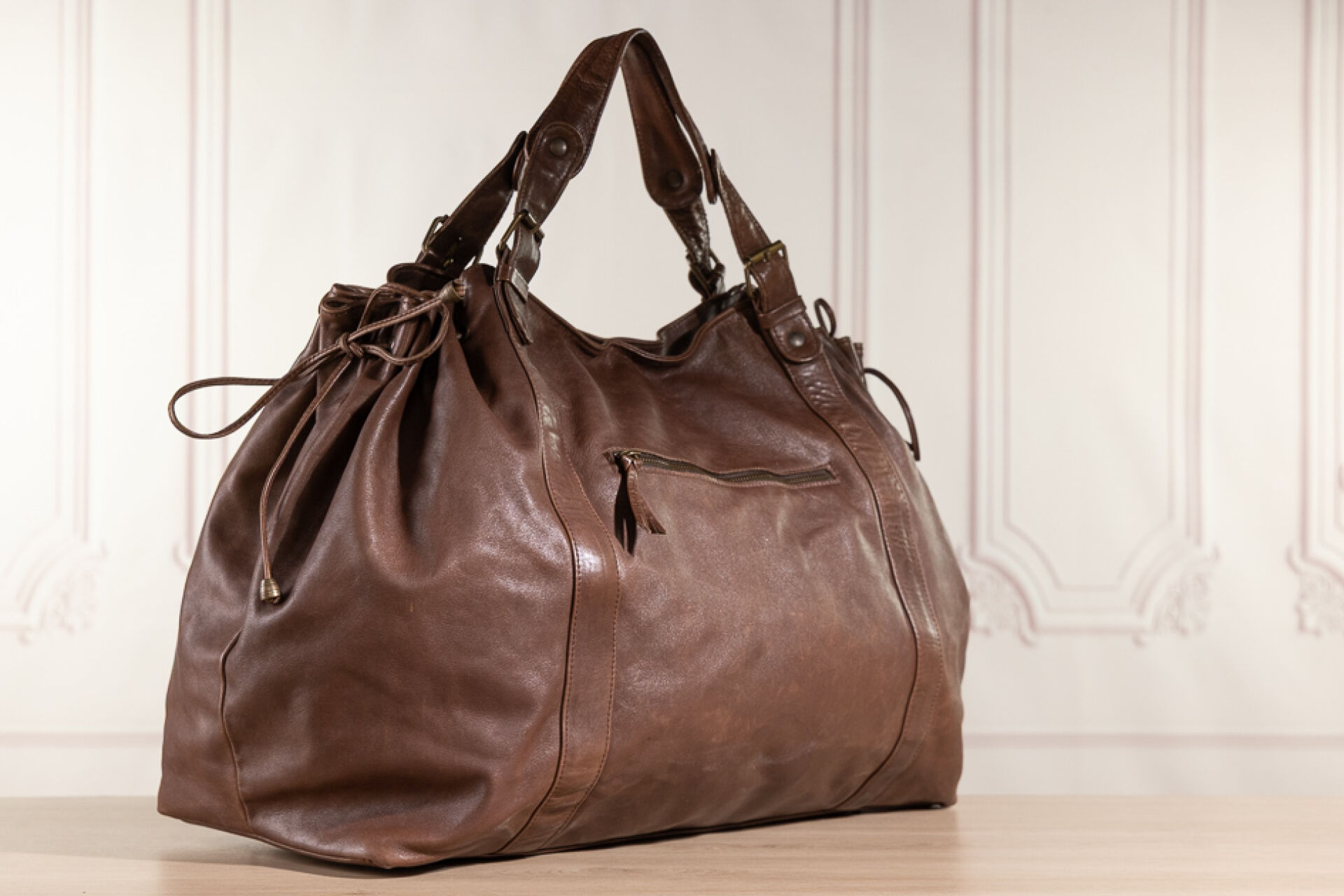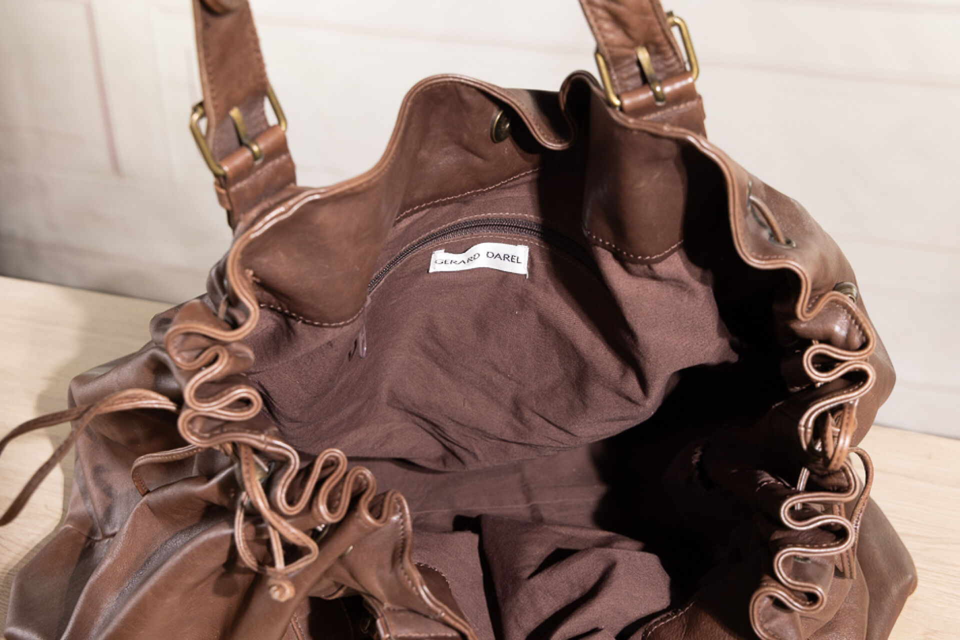 GERARD DAREL - Sac "72 heures" en cuir marron, double poignées, lien coulissé de part et d'autre donnant un effet froncé, fermeture pression. Haut. : 36 cm - Long. : 49 cm Très bon état général, très légères traces et griffures