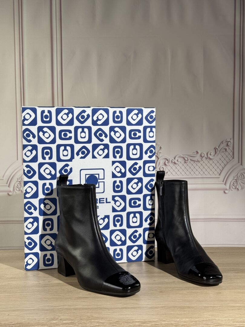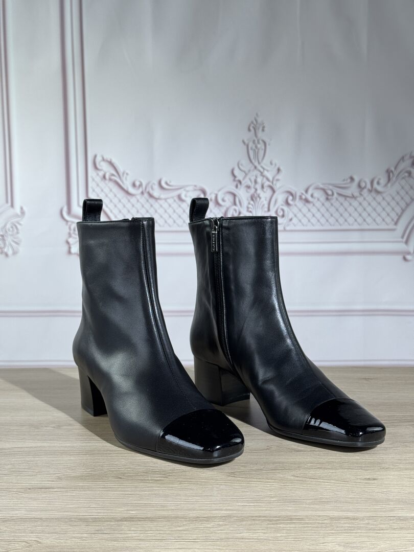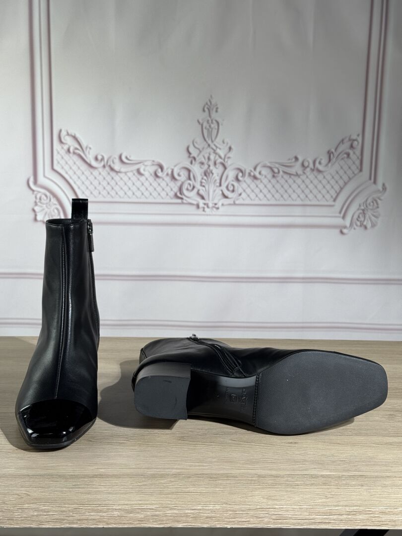 CAREL - Paire de bottines modèle "Estime Bis", cuir agneau noir et bout vernis à la couleur, petit talon. Pointure 37 - Haut du talon : 5 cm Etat neuf