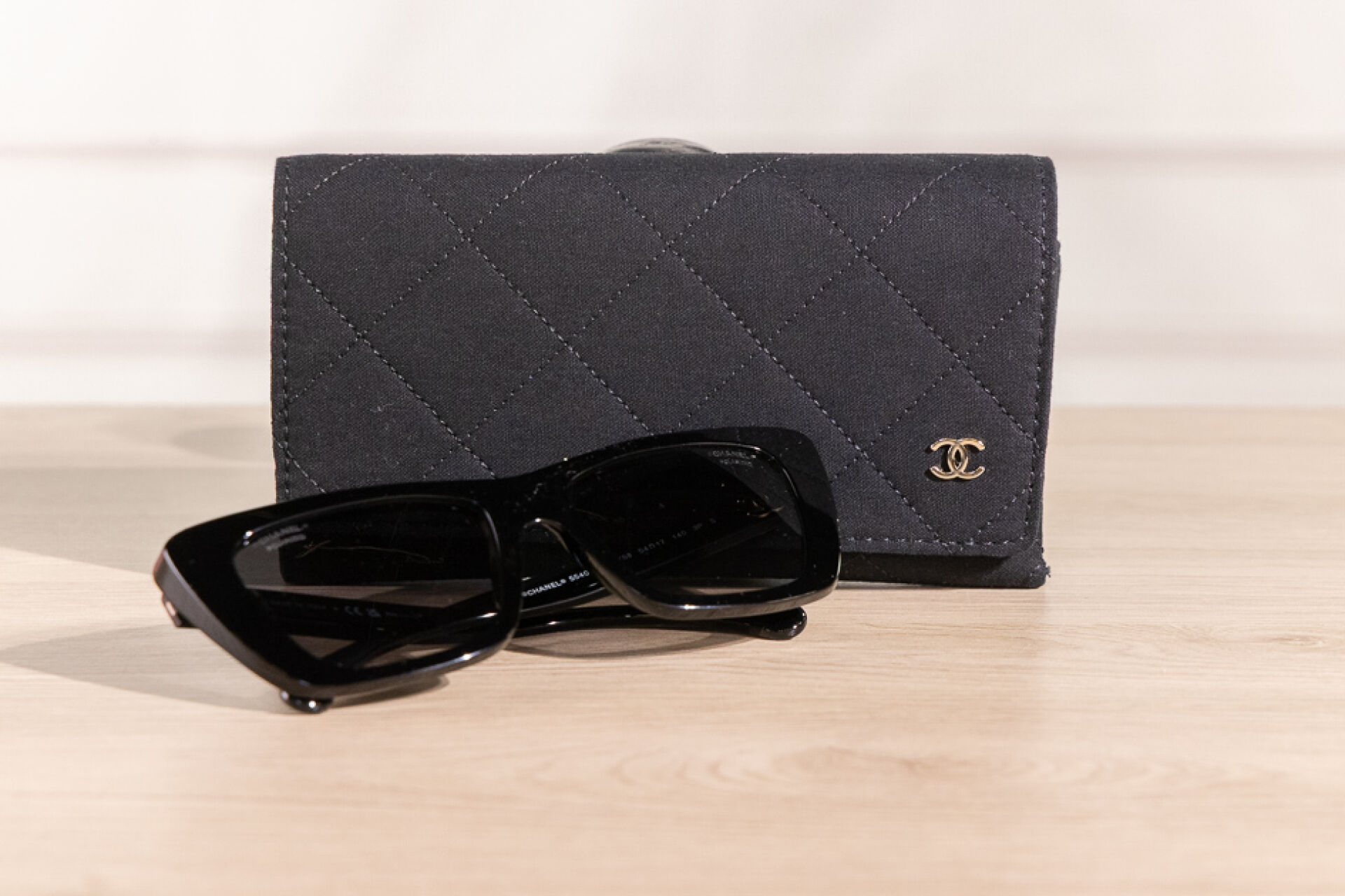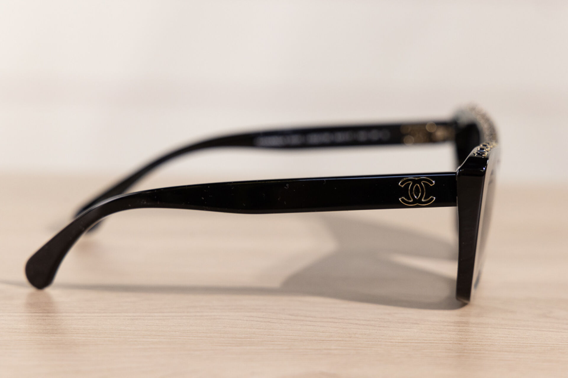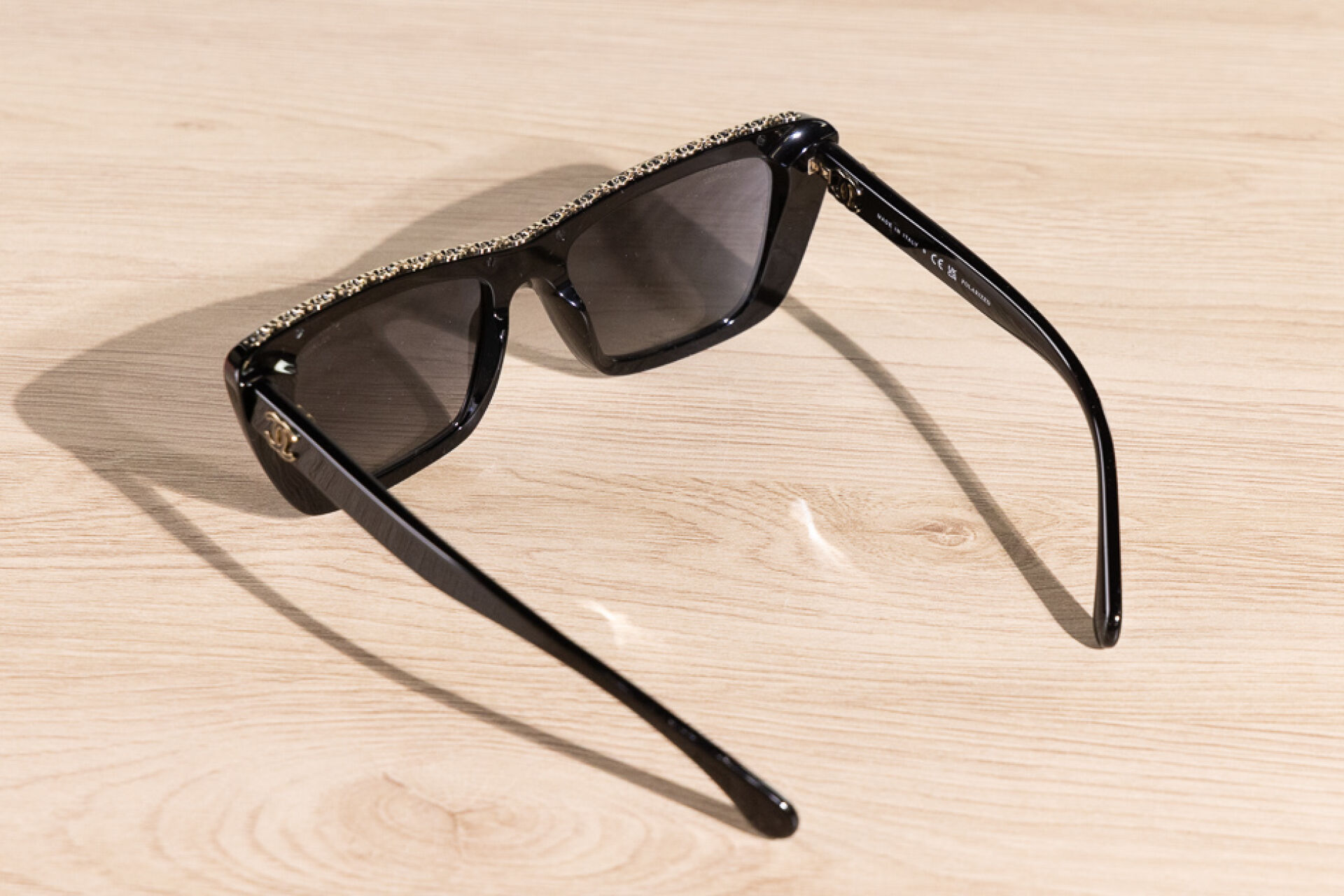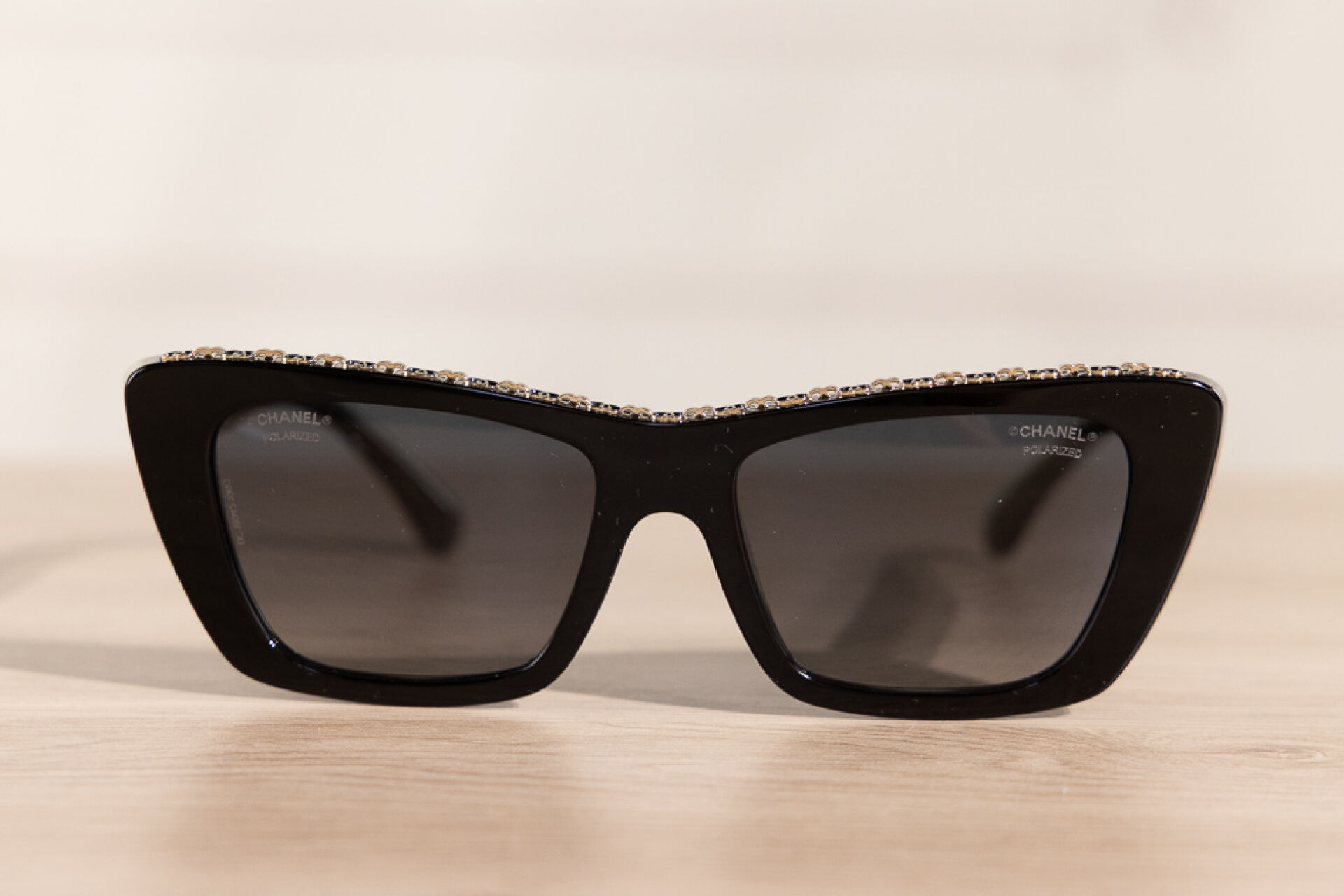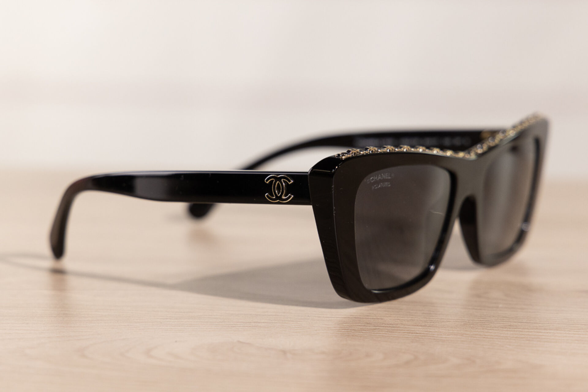 CHANEL - Paire de lunettes de soleil polarized, acétate noir rehaussé d'une chaine au double C doré sur le dessus. Dans son étui. Très bon état