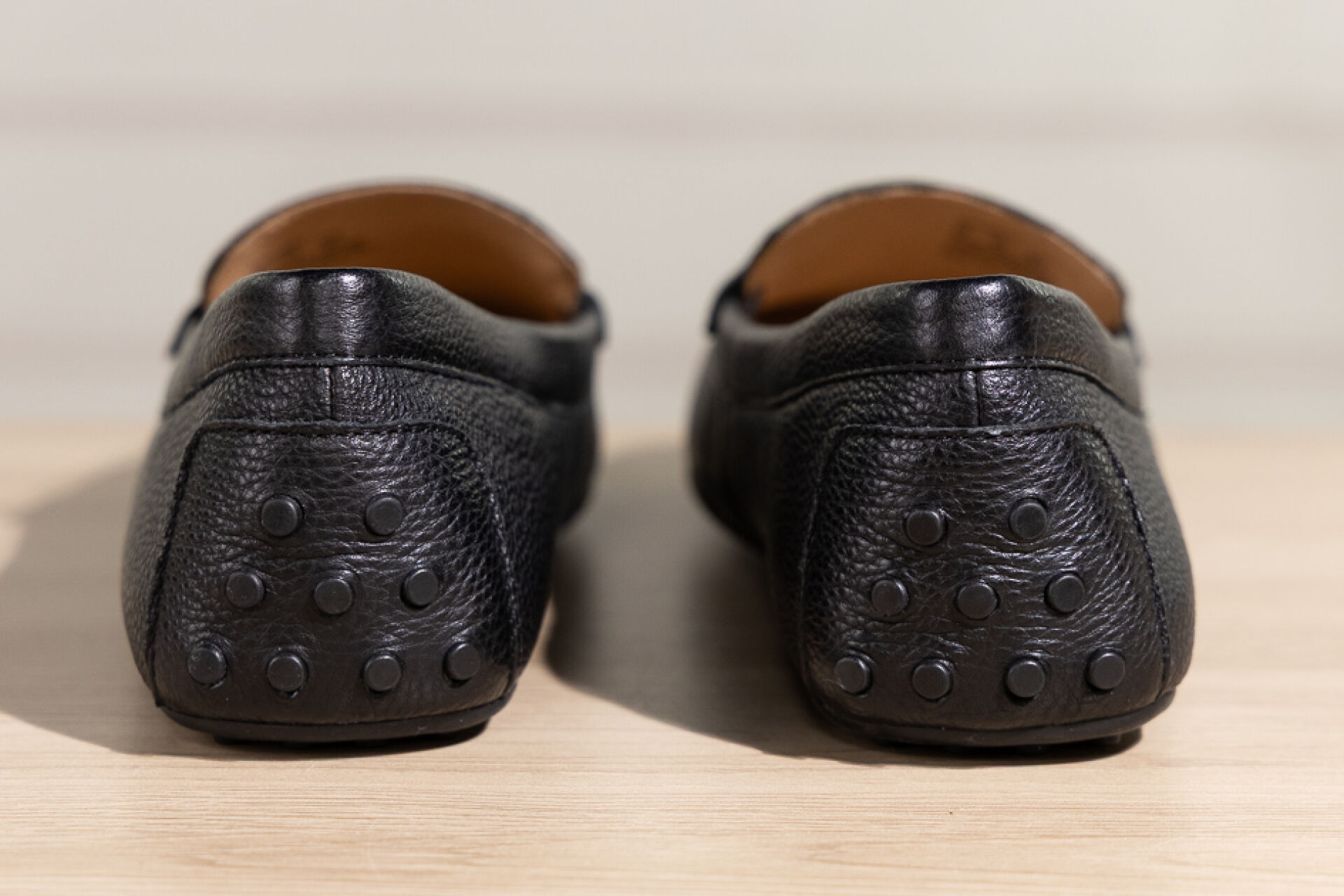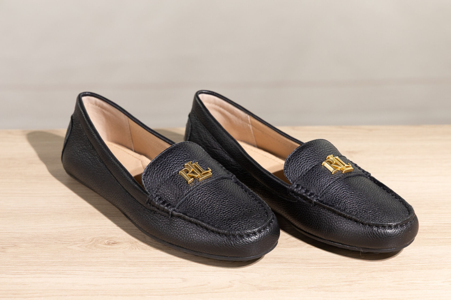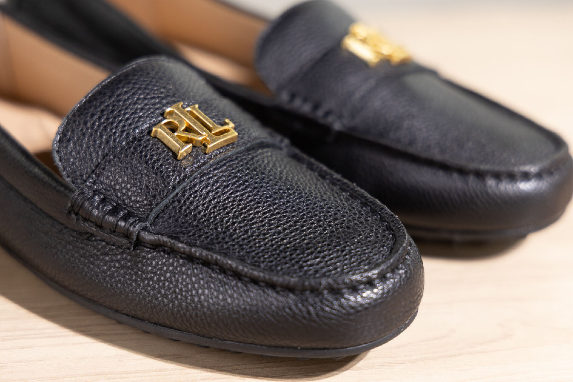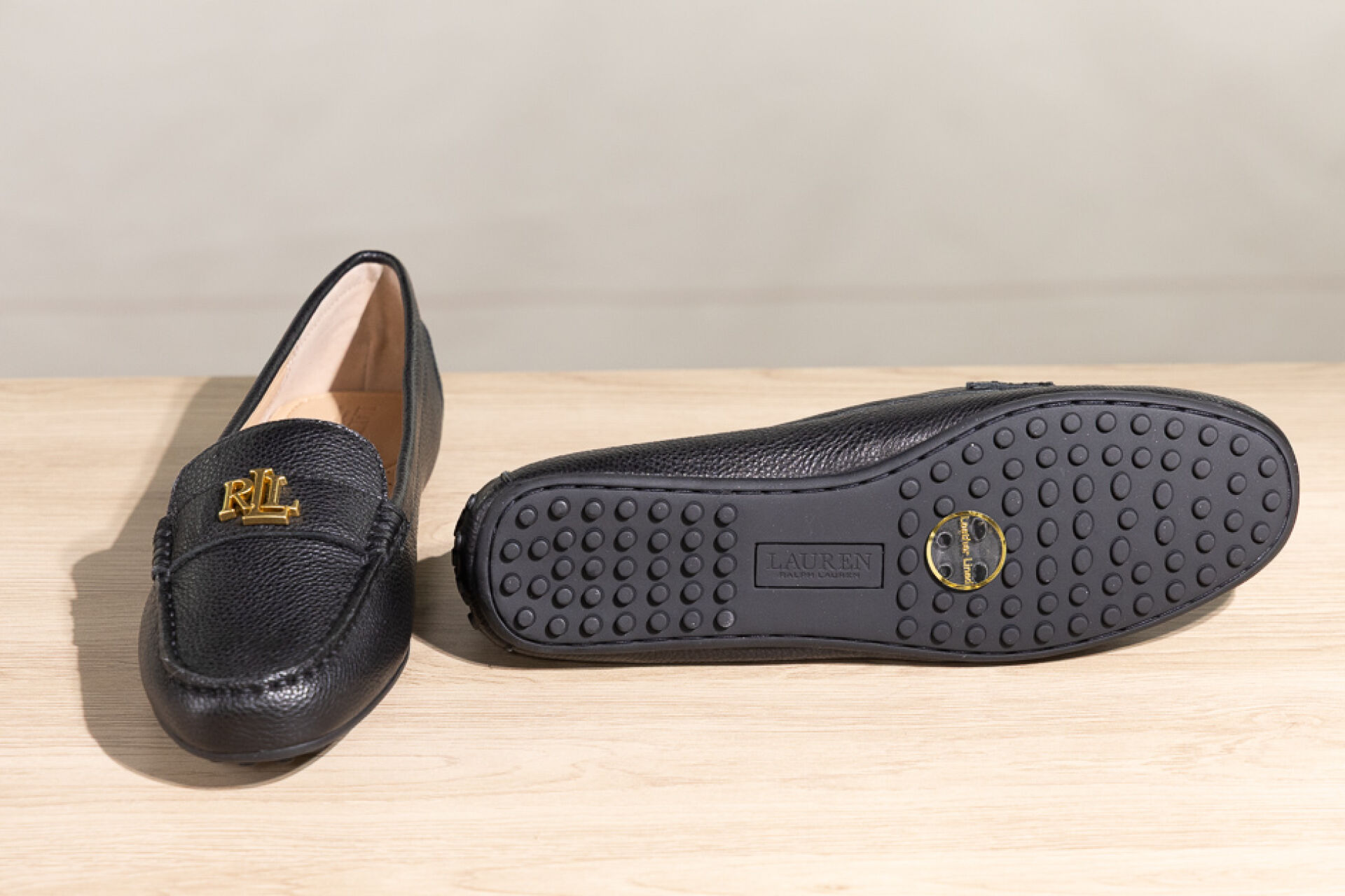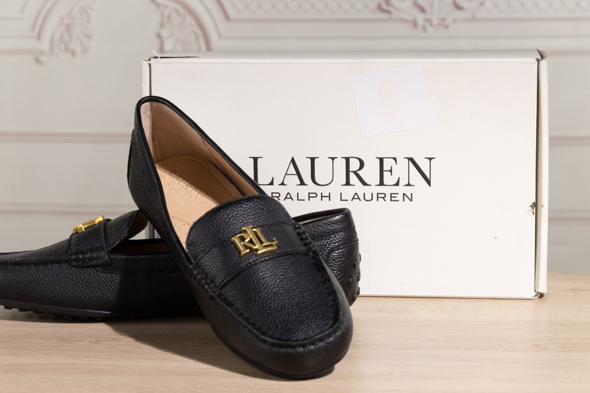 RALPH LAUREN - Paire de mocassins en cuir grainé noir, empeigne aux lettres dorés, semelle picot. Boite. Pointure 38,5 Non portés
