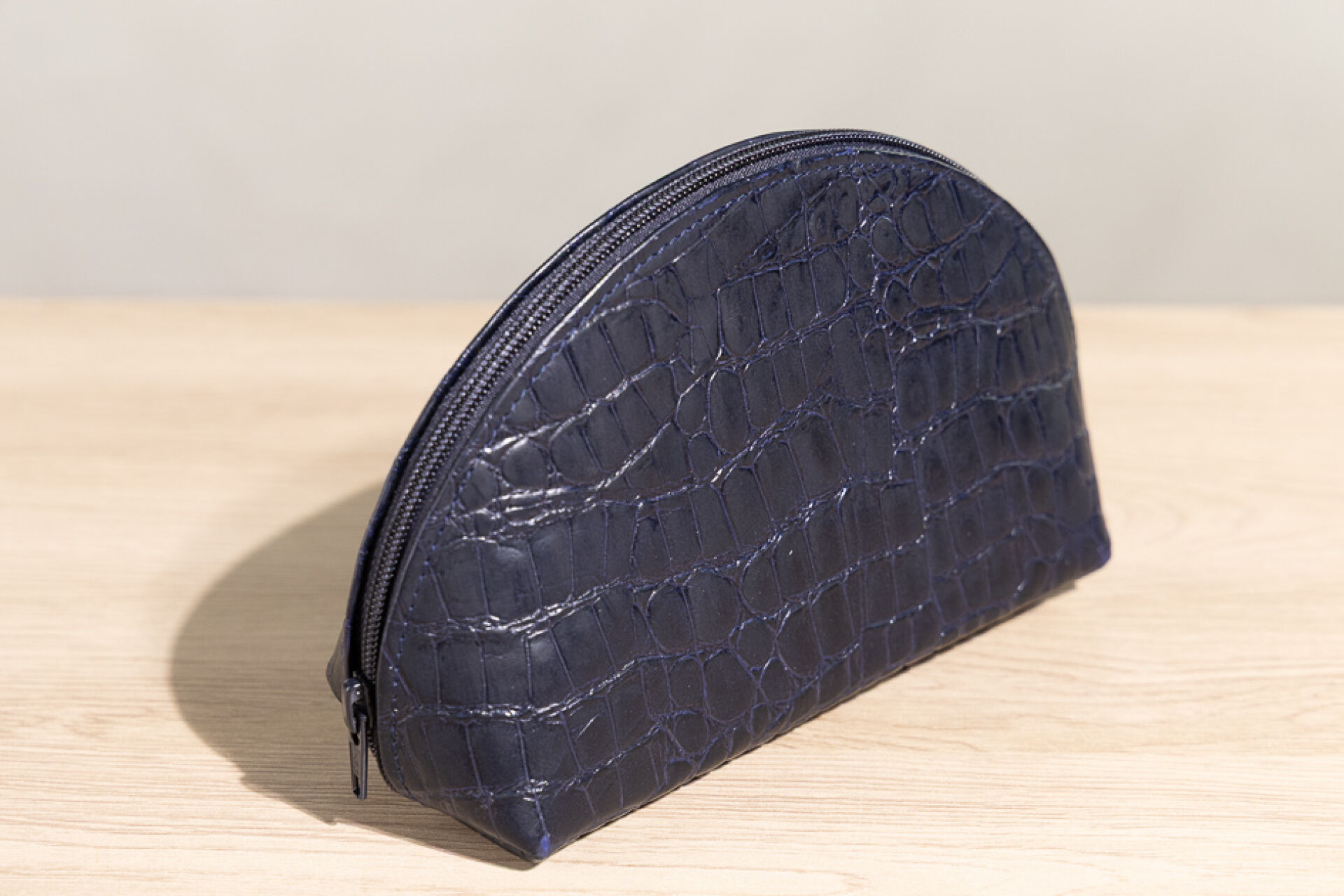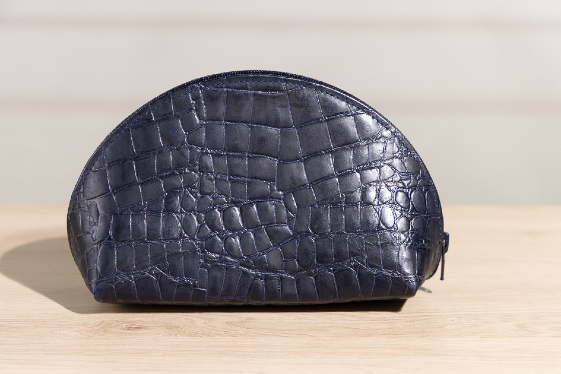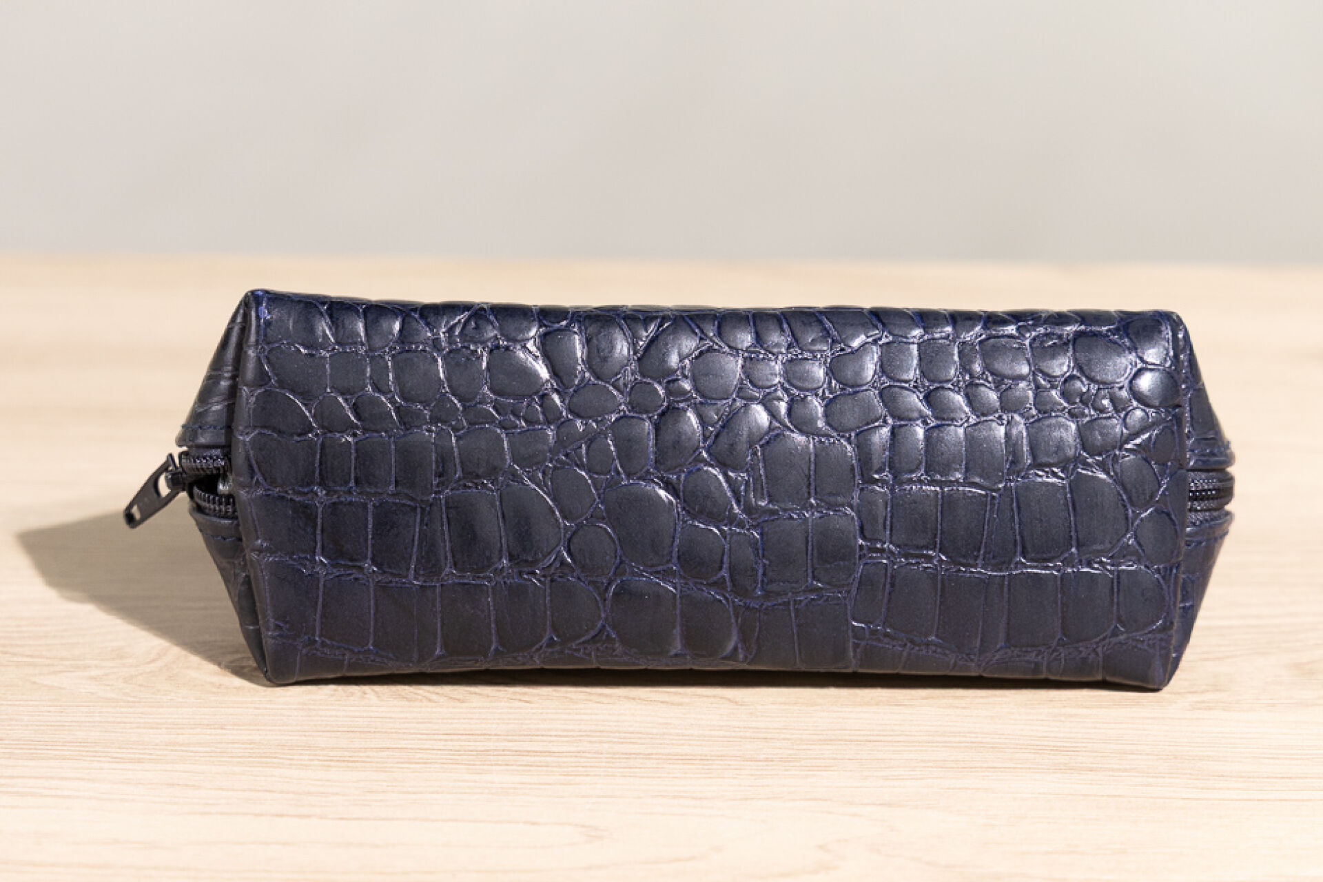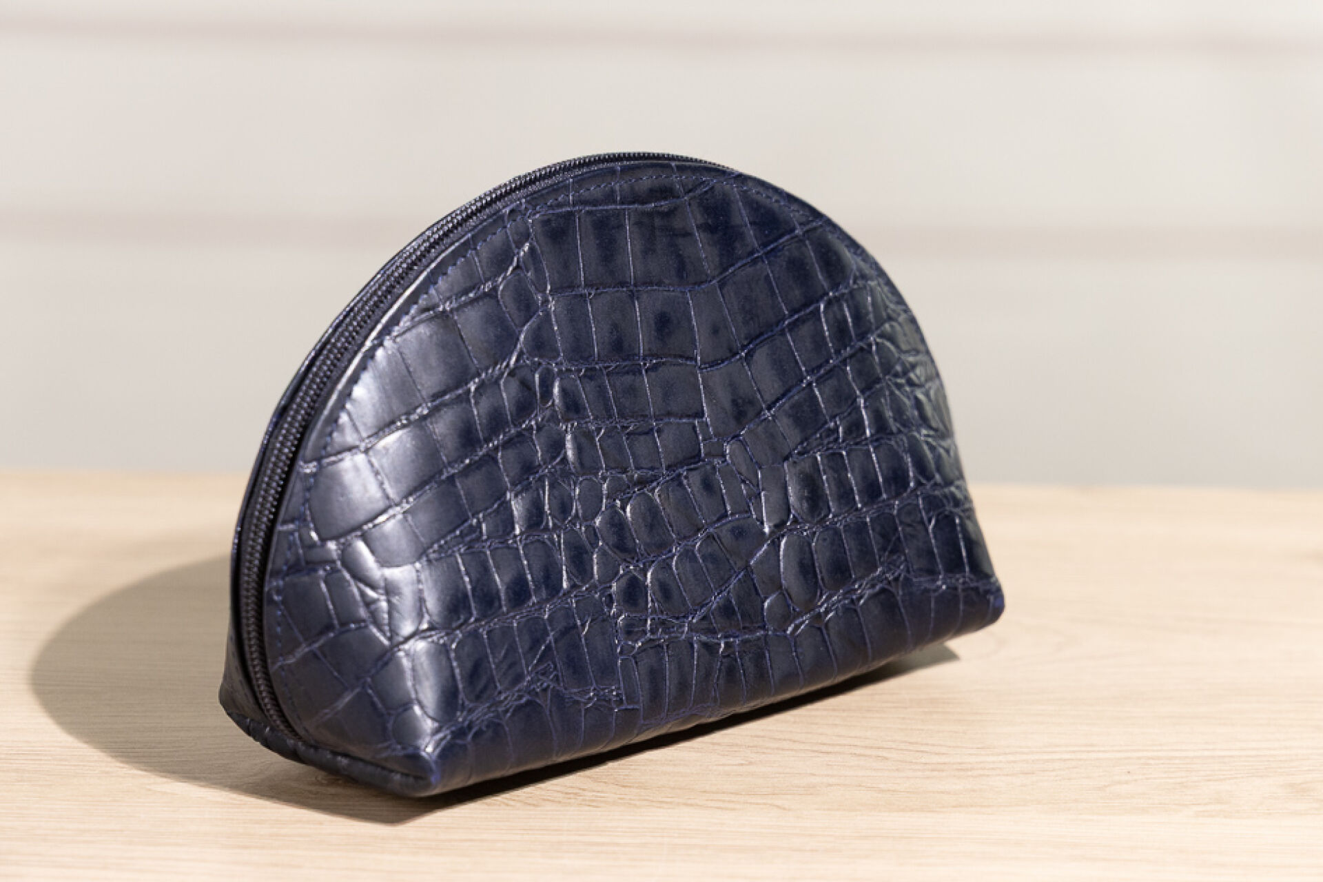 ROCHAS - Trousse de toilette en cuir imitation crocodile marine, fermeture à glissière. Long. : 16 cm Très bon état