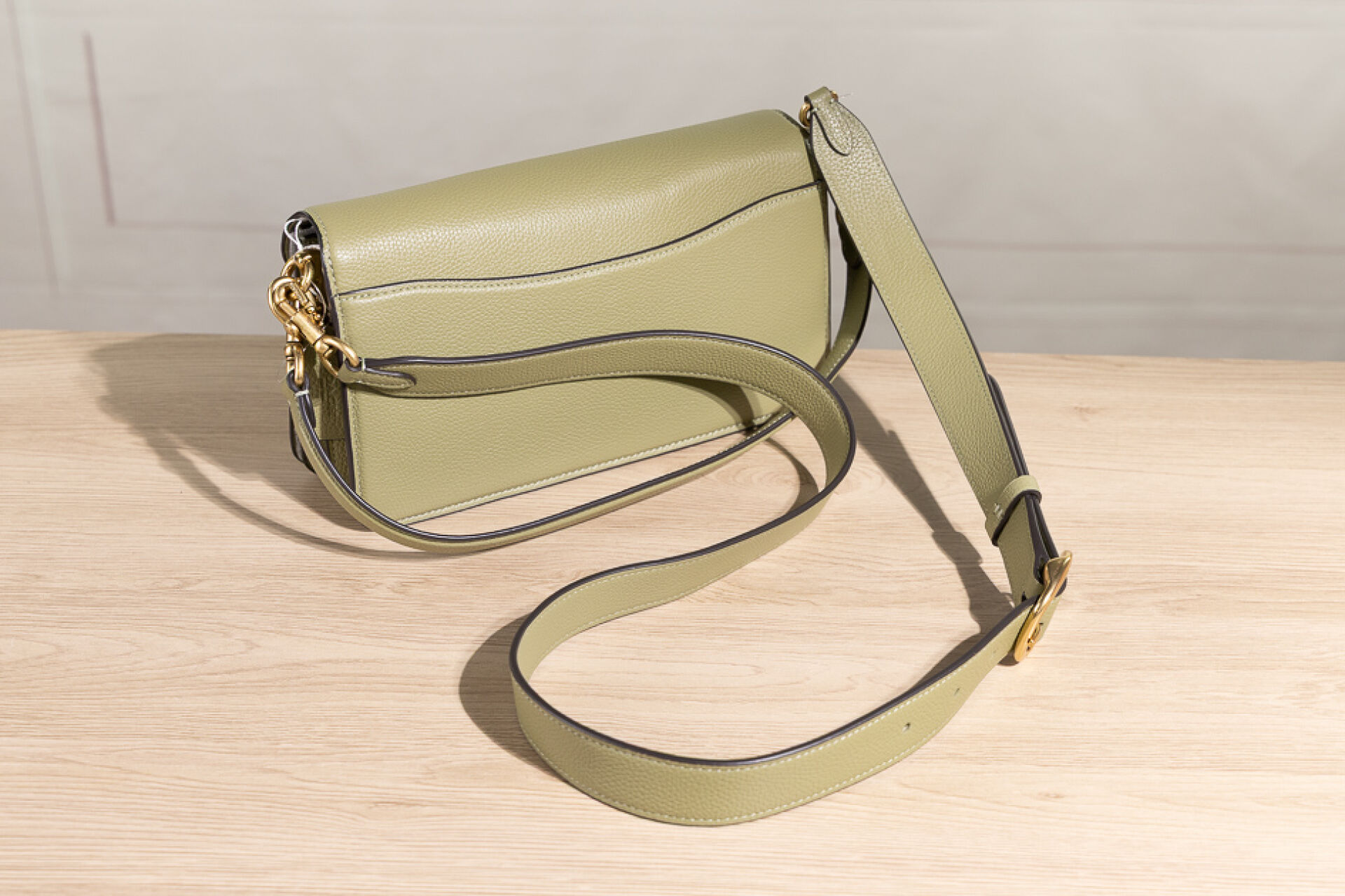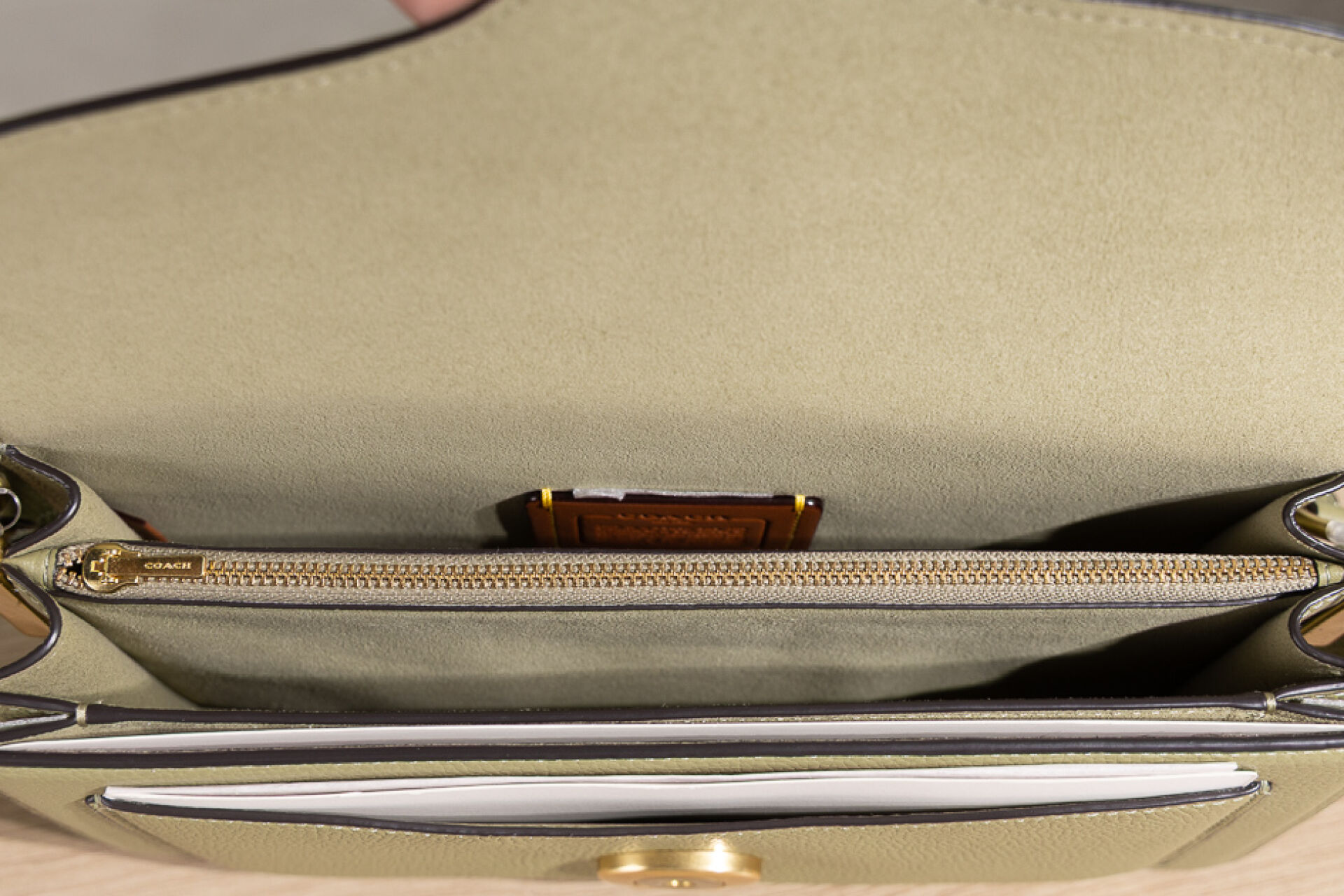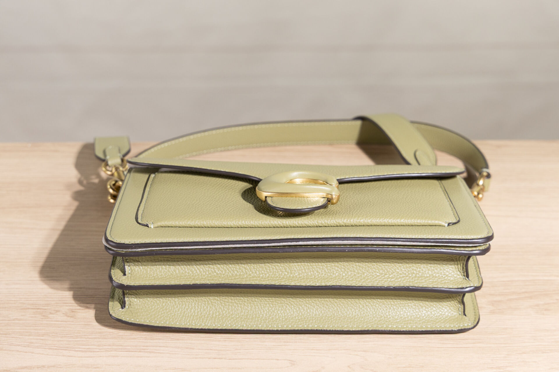COACH - Sac en cuir grainé vert kaki clair, fermoir aimanté sous rabat siglé, poche plaquée au dos, poignée et anse bandoulières amovibles. Haut. : 15 cm - Long. : 26 cm Bon état - Non porté