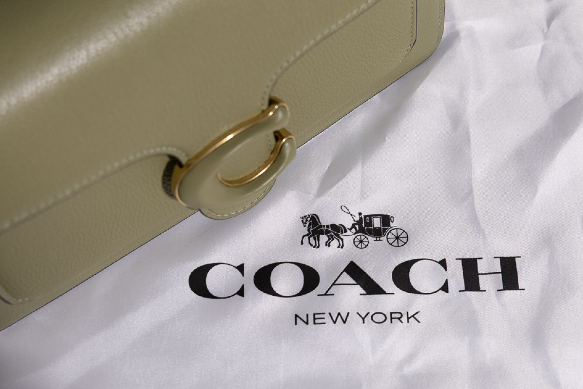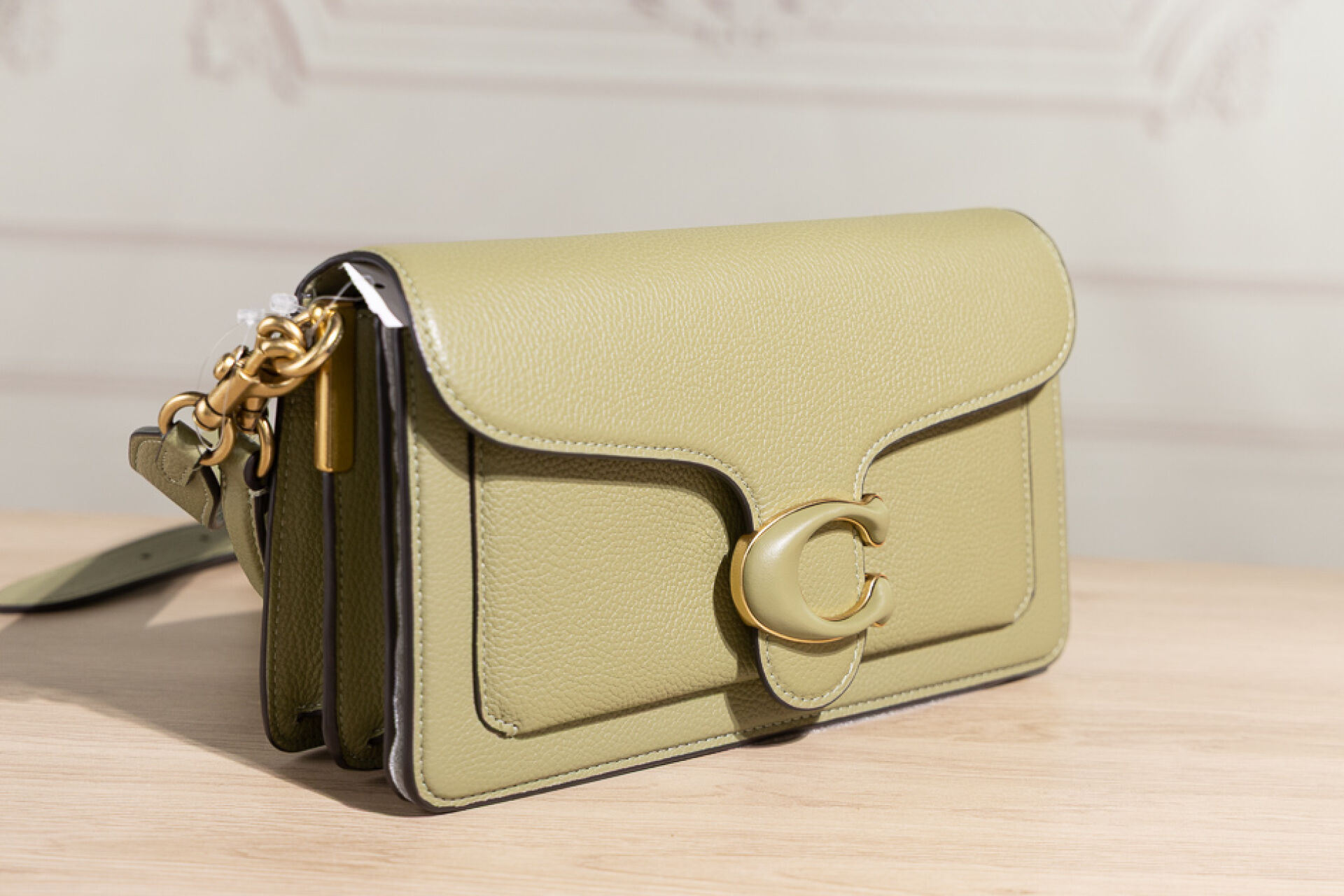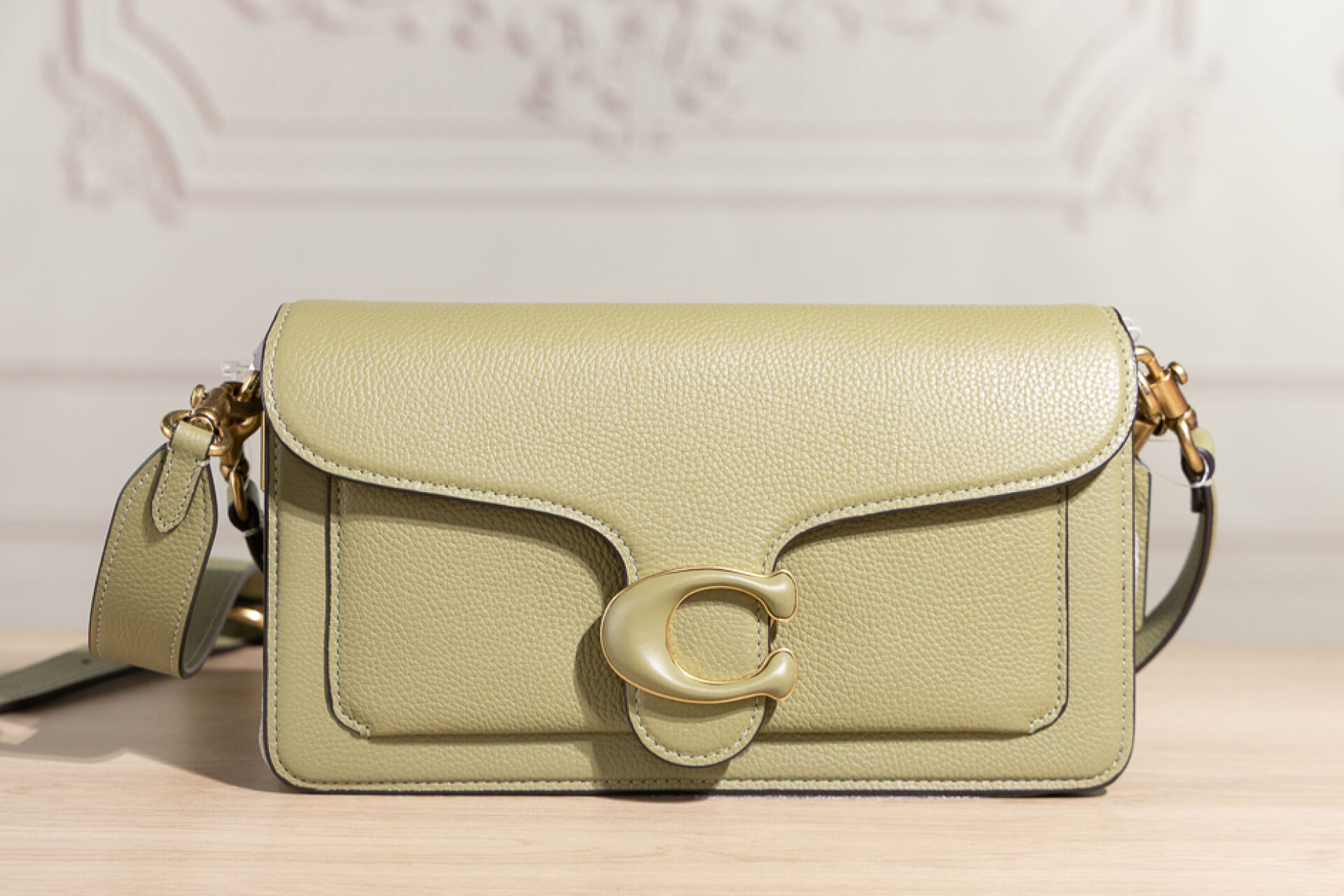 COACH - Sac en cuir grainé vert kaki clair, fermoir aimanté sous rabat siglé, poche plaquée au dos, poignée et anse bandoulières amovibles. Haut. : 15 cm - Long. : 26 cm Bon état - Non porté