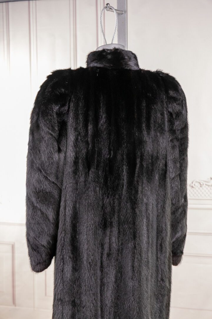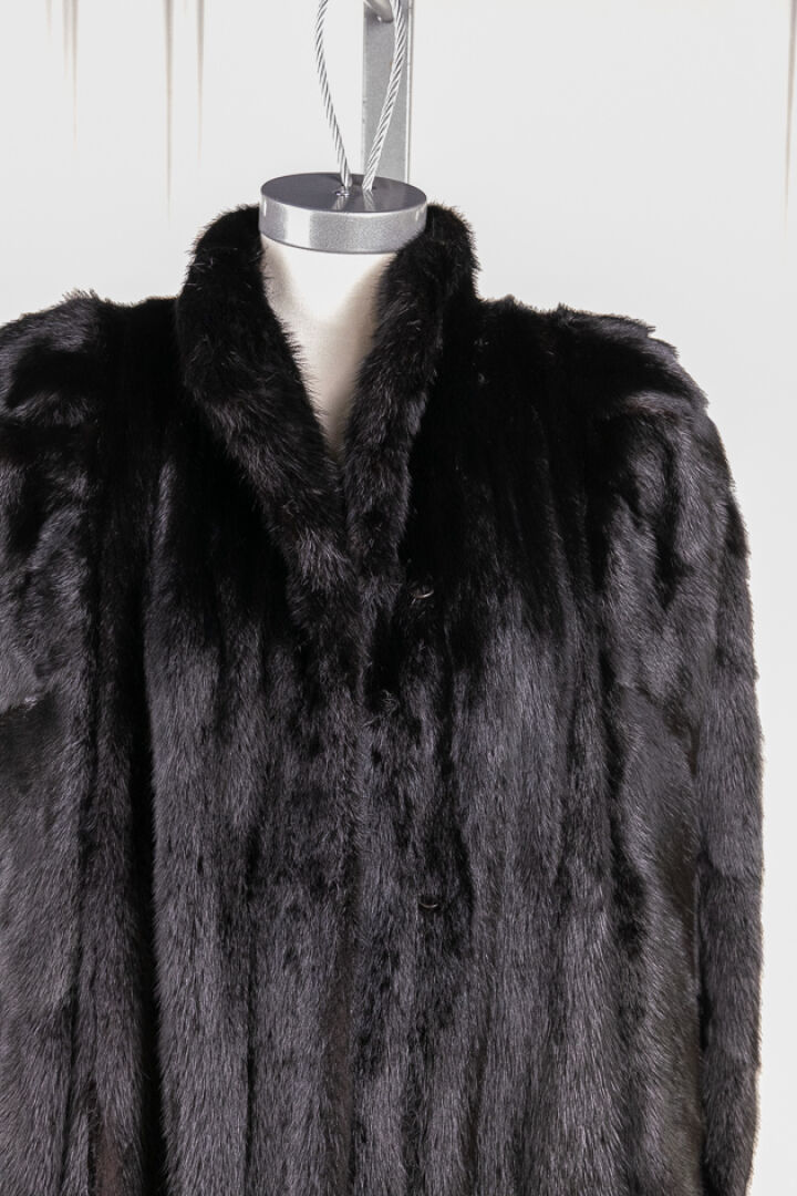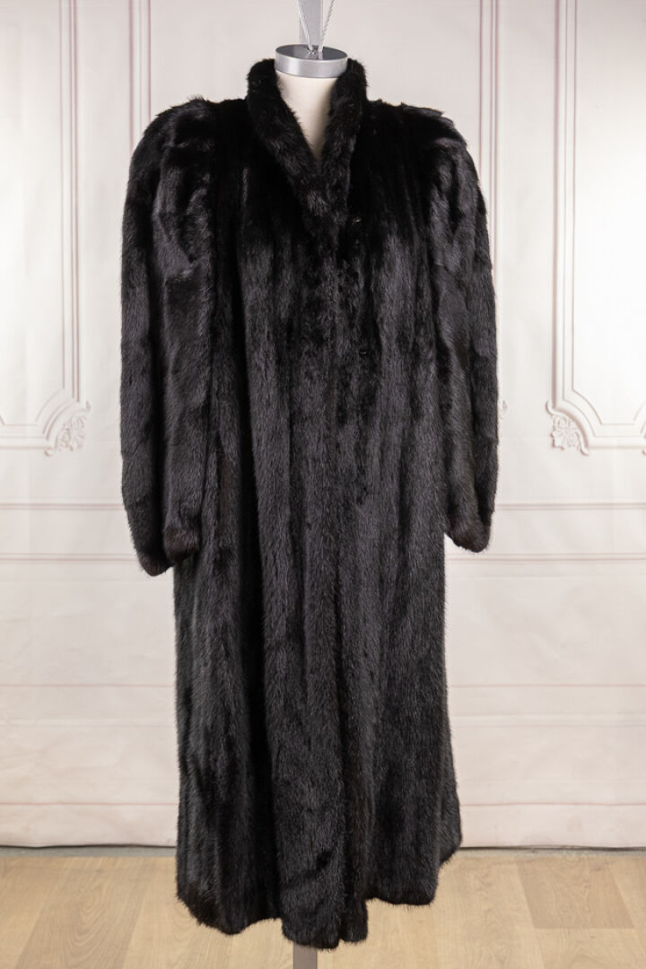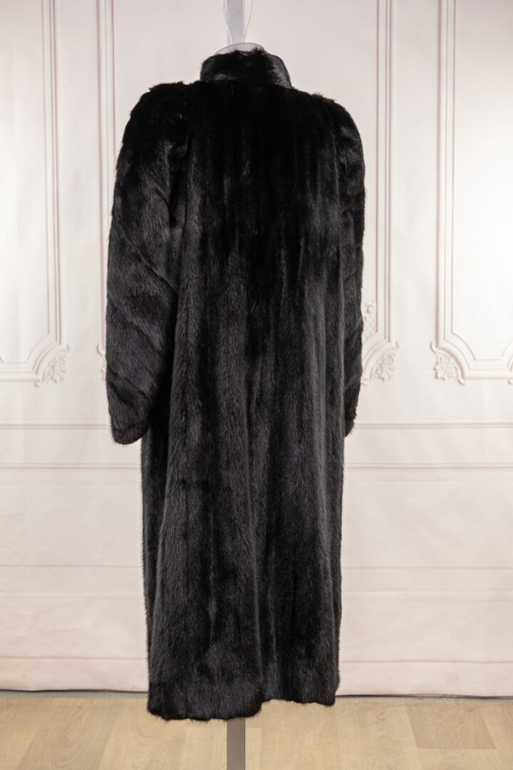 NINA RICCI - Manteau en vison dark, col montant, simple boutonnage agrafe, deux poches verticales, manches longues travaillées en biais. Taille supposée 38 Doublure l'état