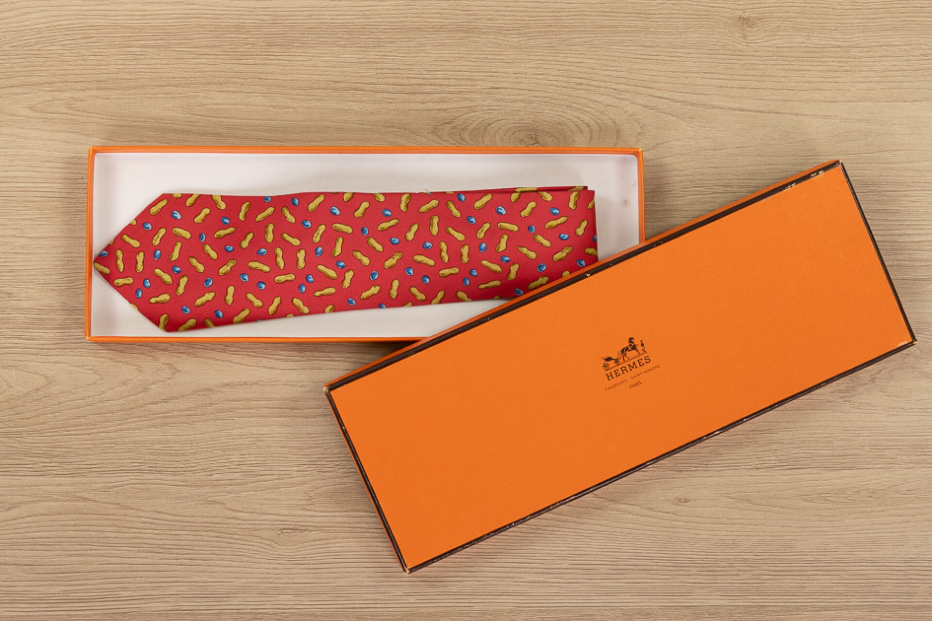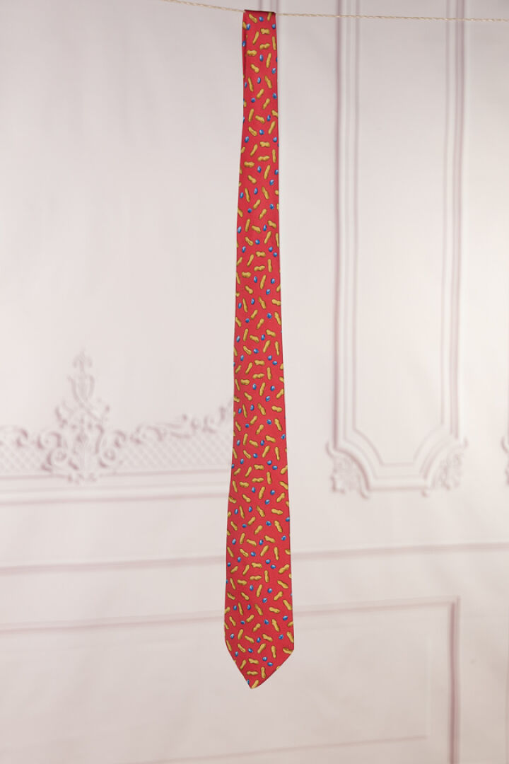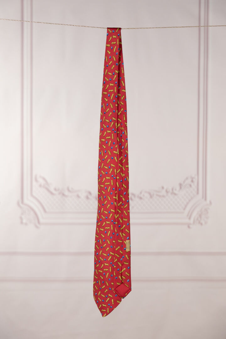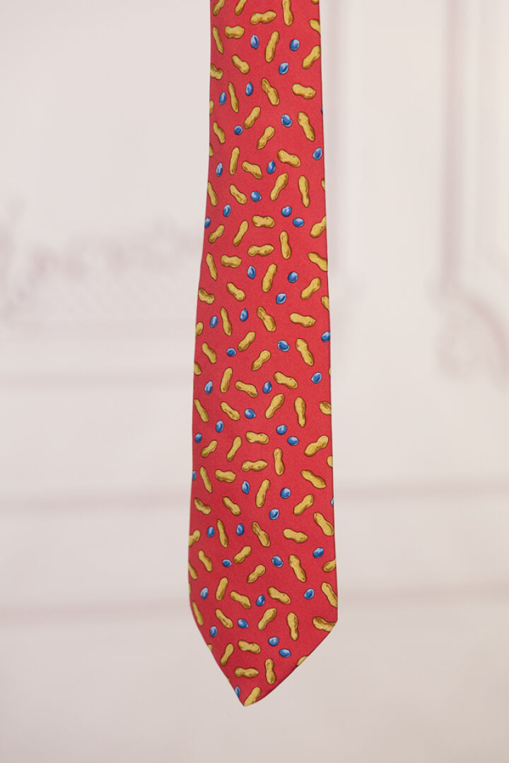 HERMES Paris - Cravate en soie imprimée rouge à motifs de cacahuètes. Dans sa boite Petites tâches