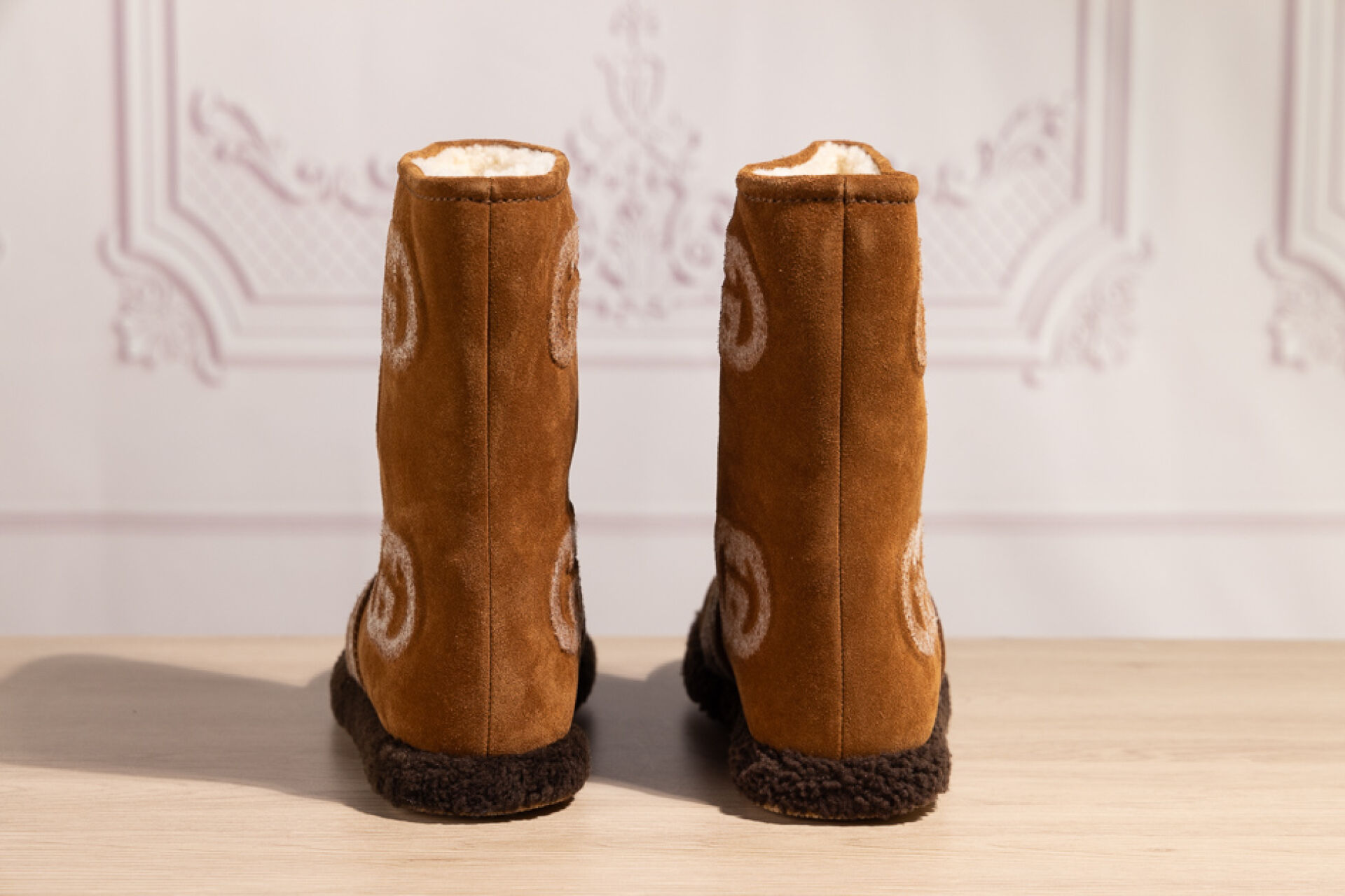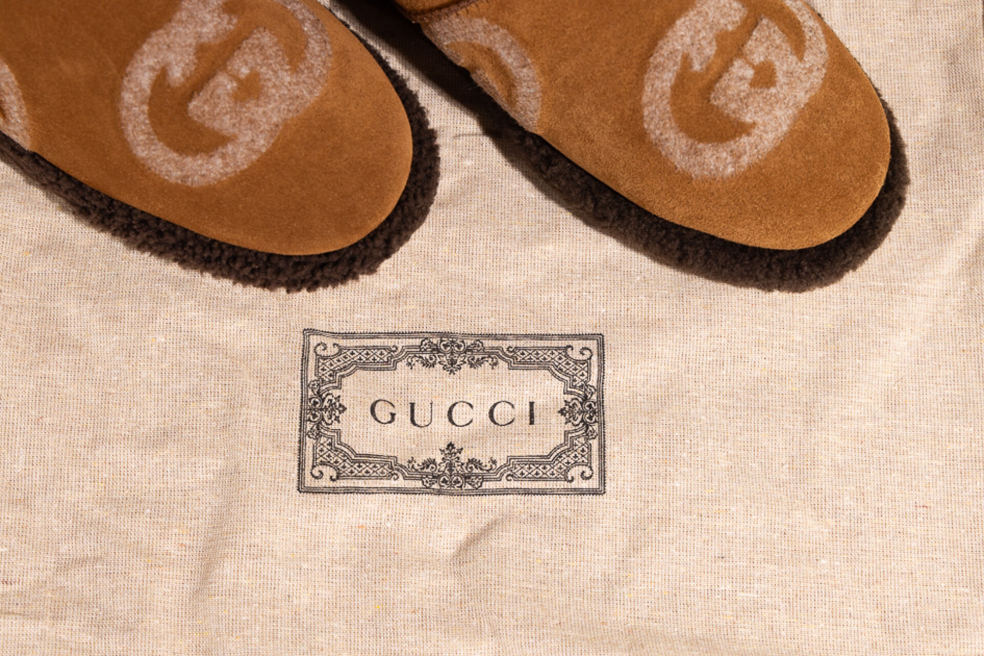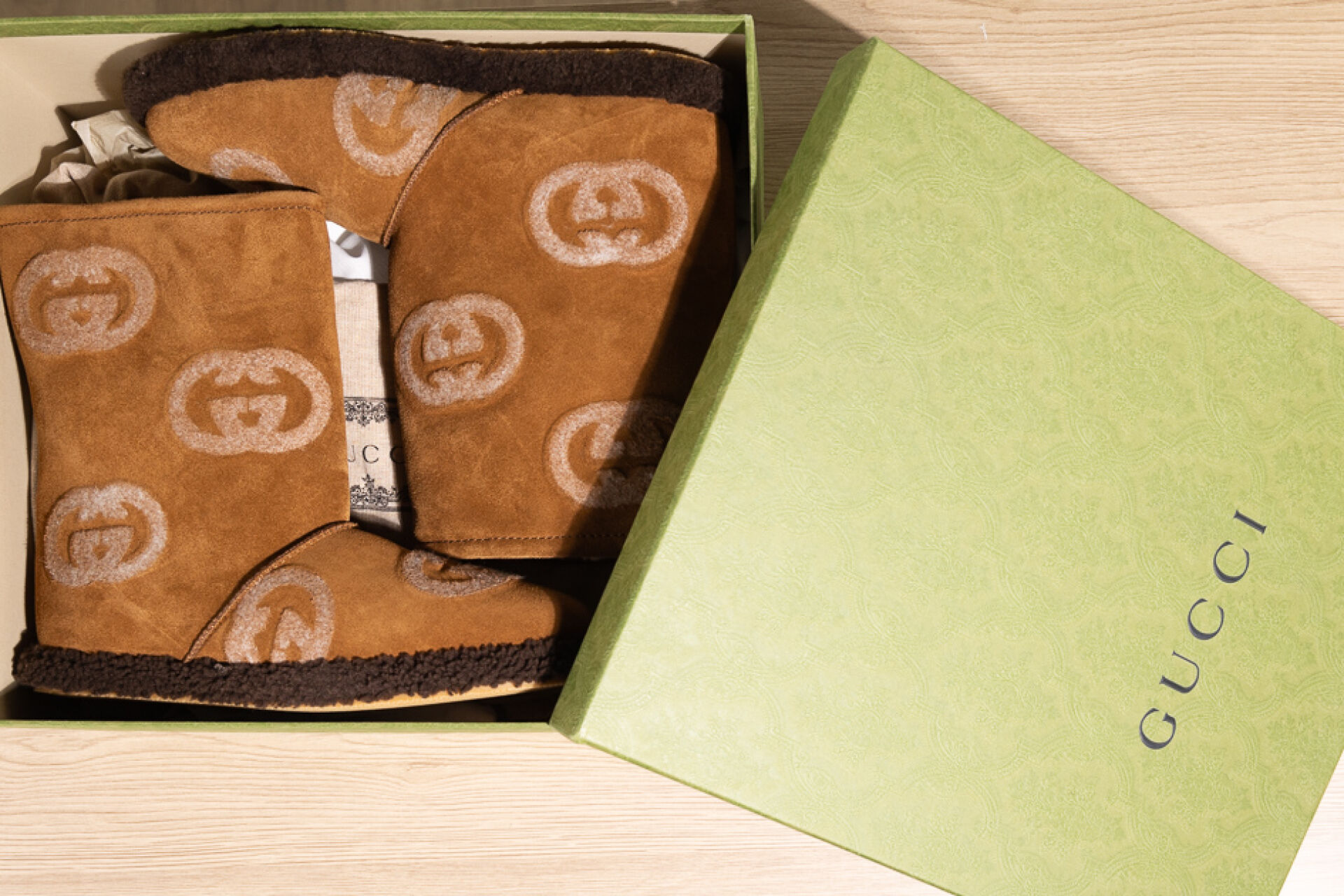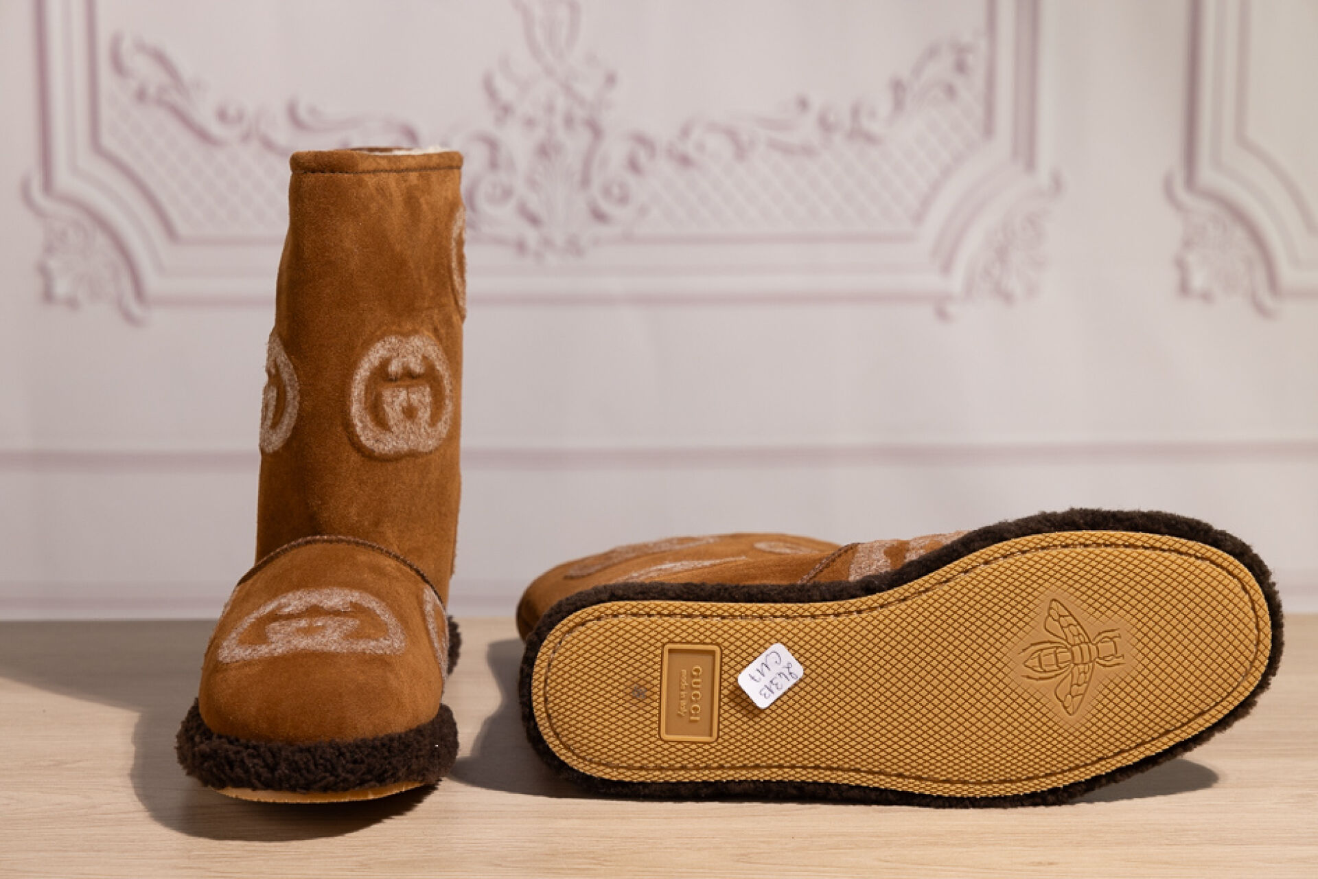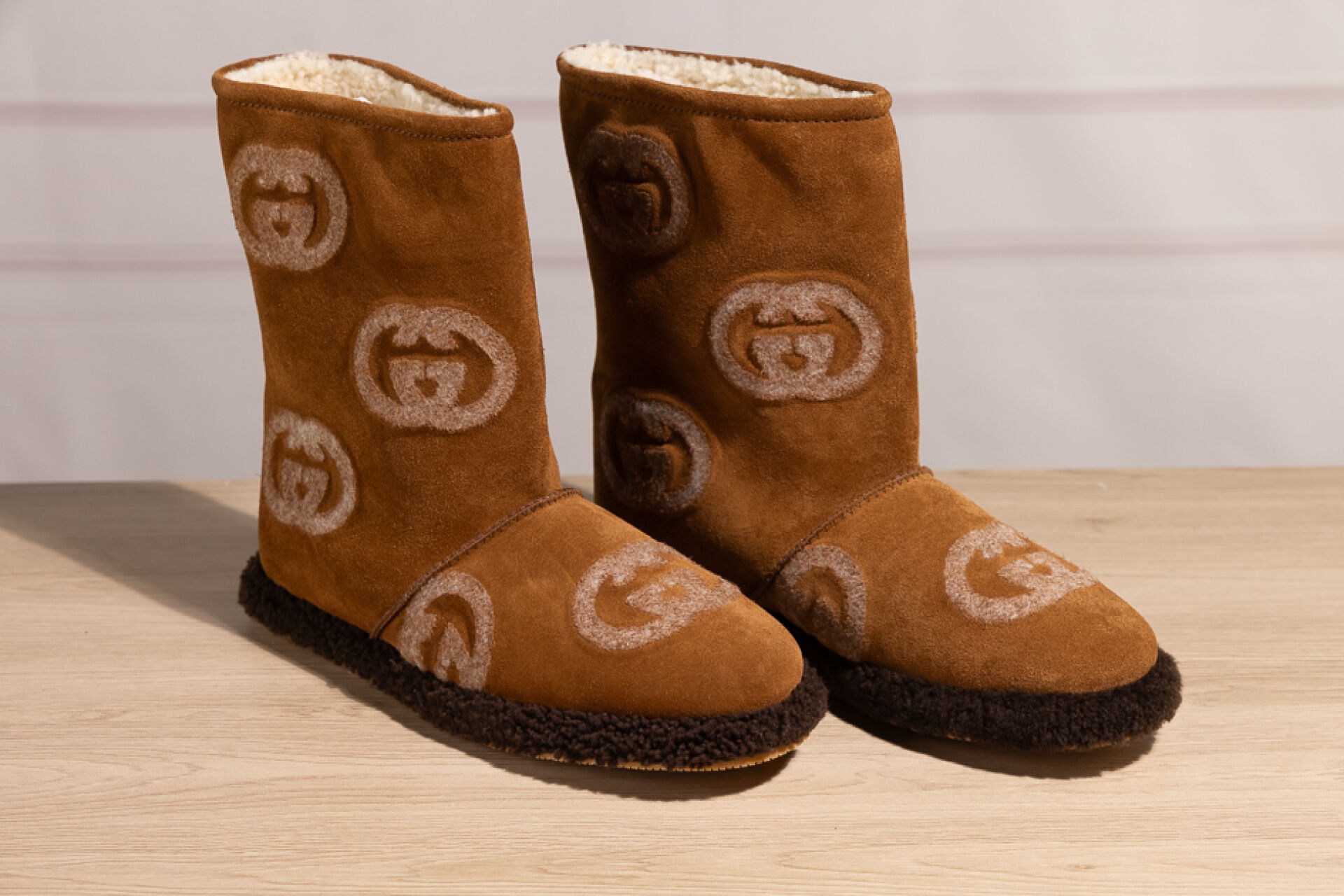 GUCCI - Paire de bottes en peaux lainées naturel grattées du sigle, tour de pied marron. Dans leur boite. Pointure 39 Non portées
