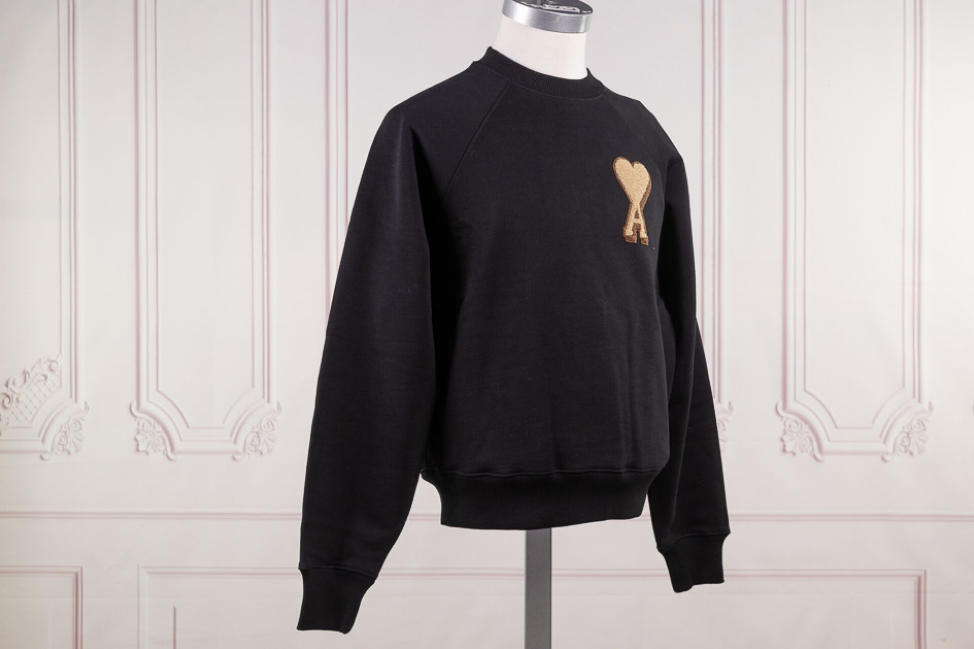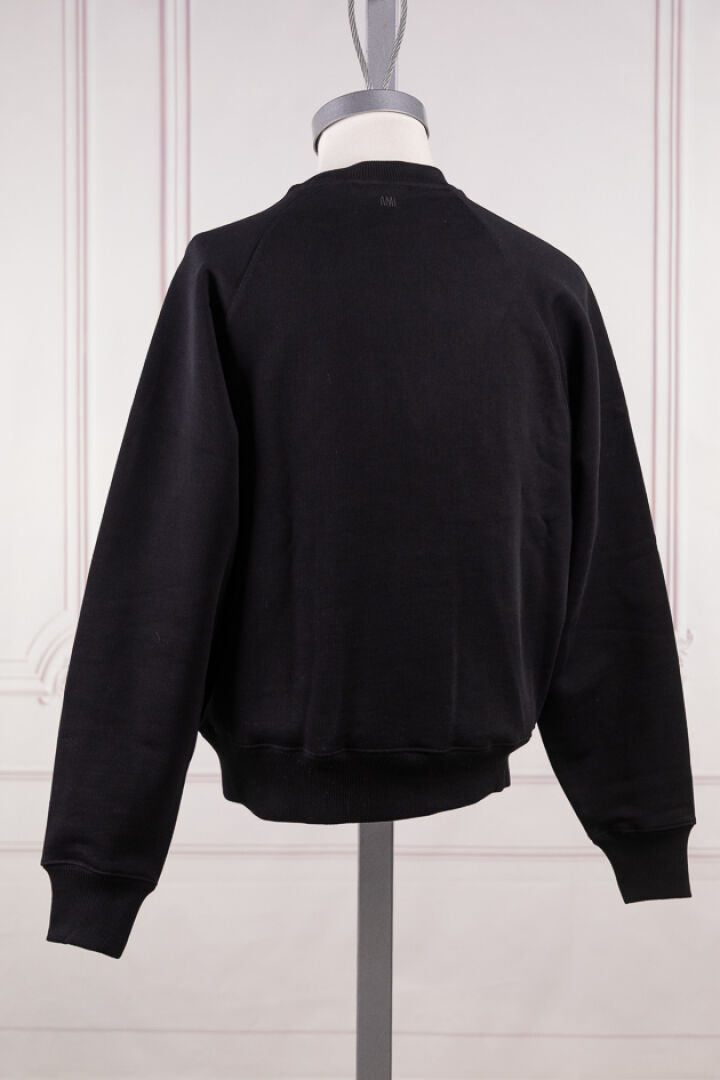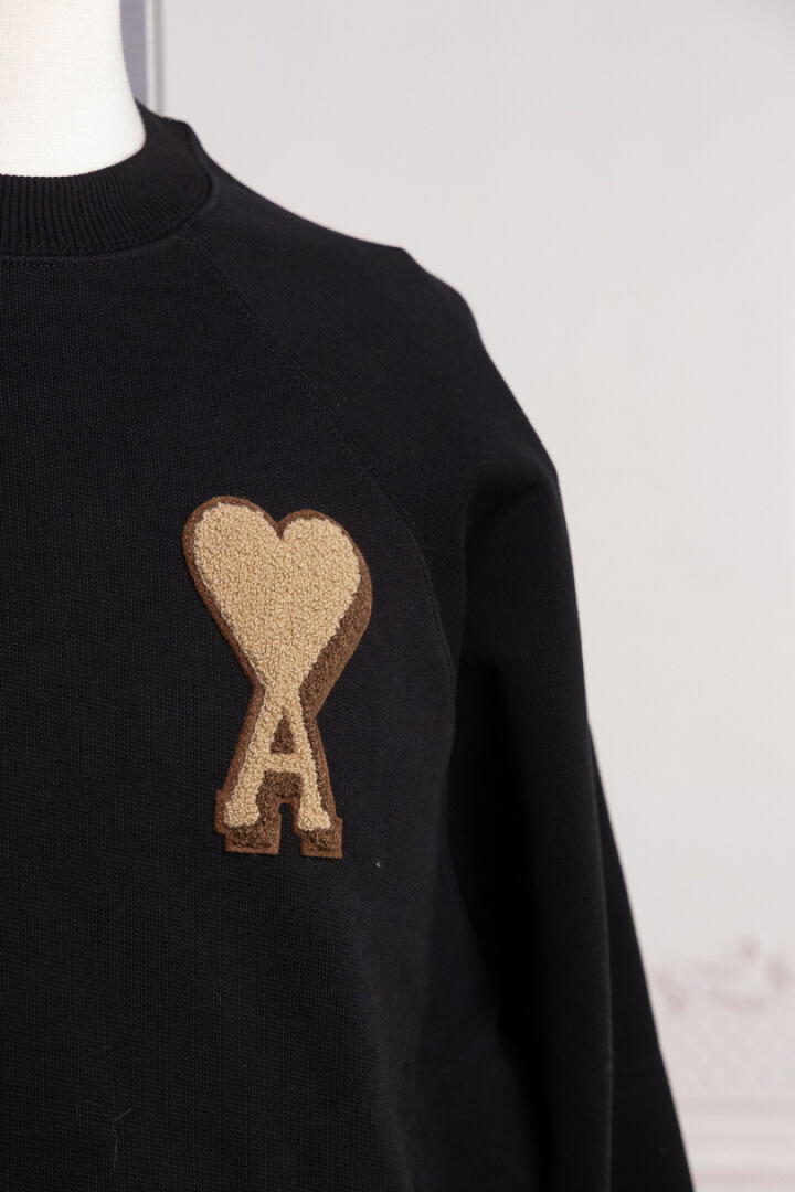 AMI par ALEXANDRE MATTUISSI - Pull-sweat en coton noir, bords côtes, encolure ronde, manches longues, A surmonté du cœur rebrodé à la poitrine. Taille supposée 40 Très bon état, déjà porté