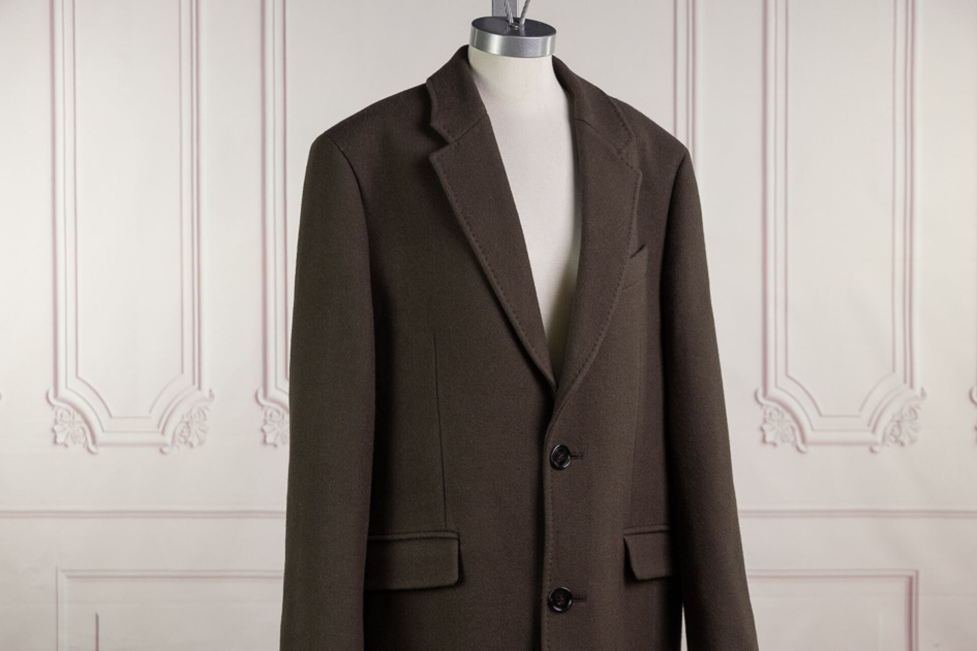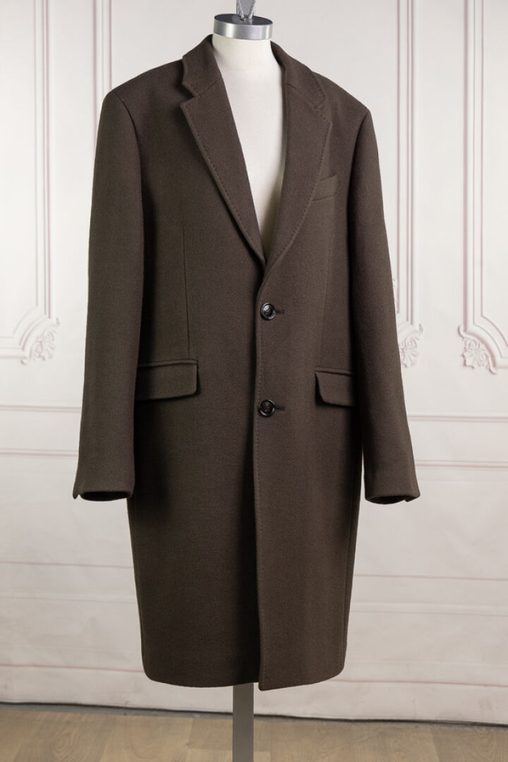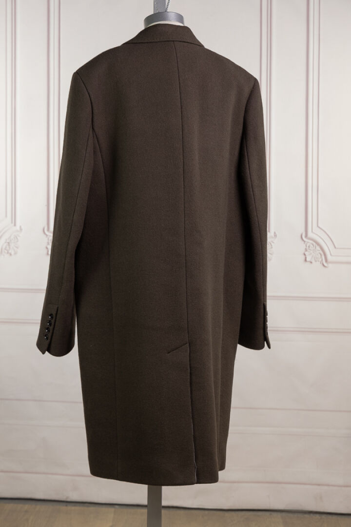 AMI par ALEXANDRE MATUSI - Manteau homme en lainage marron, col châle cranté, simple boutonnage, manches longues, une poche poitrine, deux poches sous rabat, fente dos. Taille indiquée 54 Non porté, étiquette d'origine
