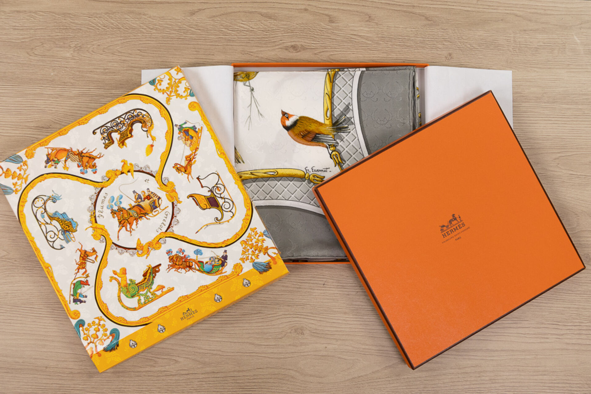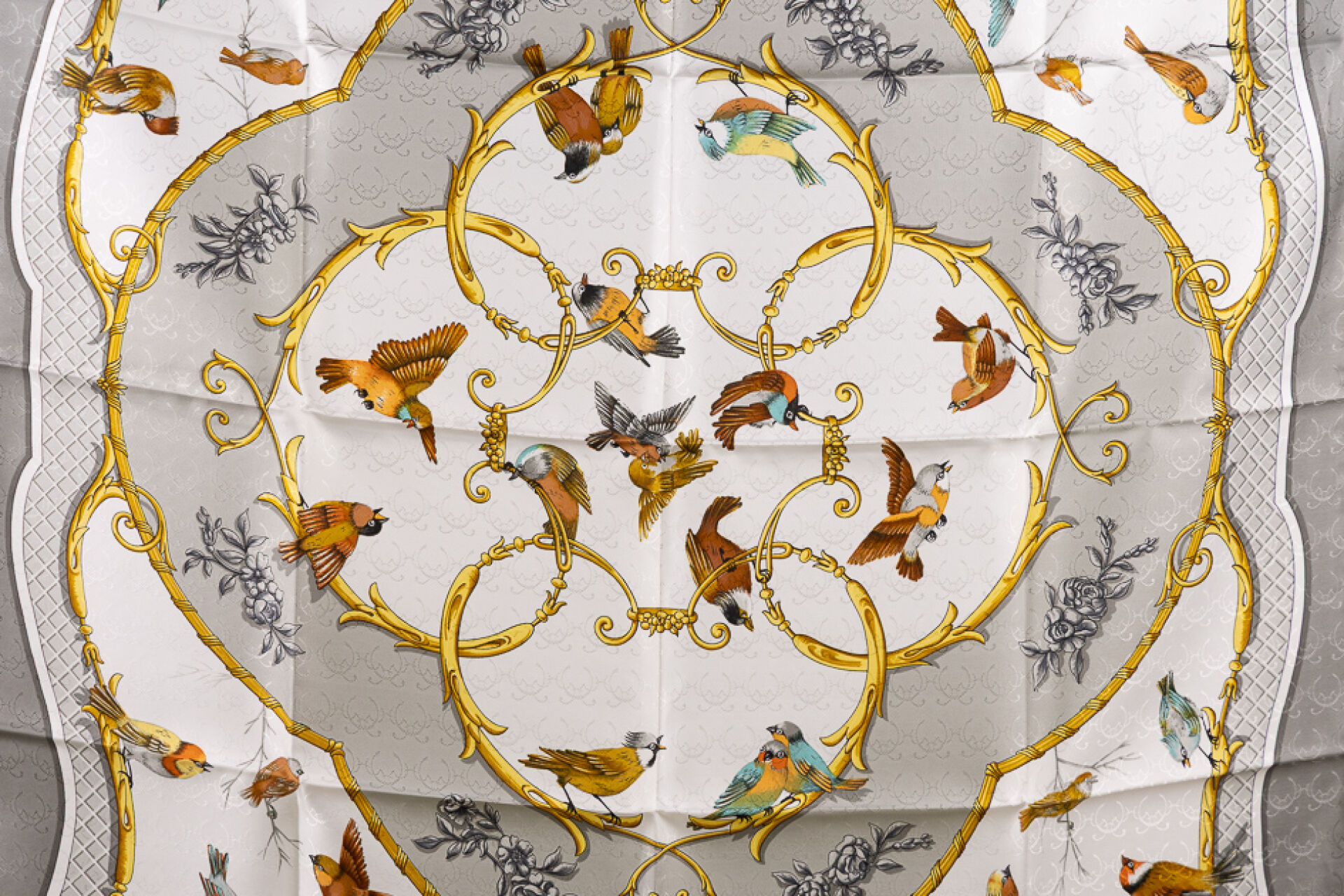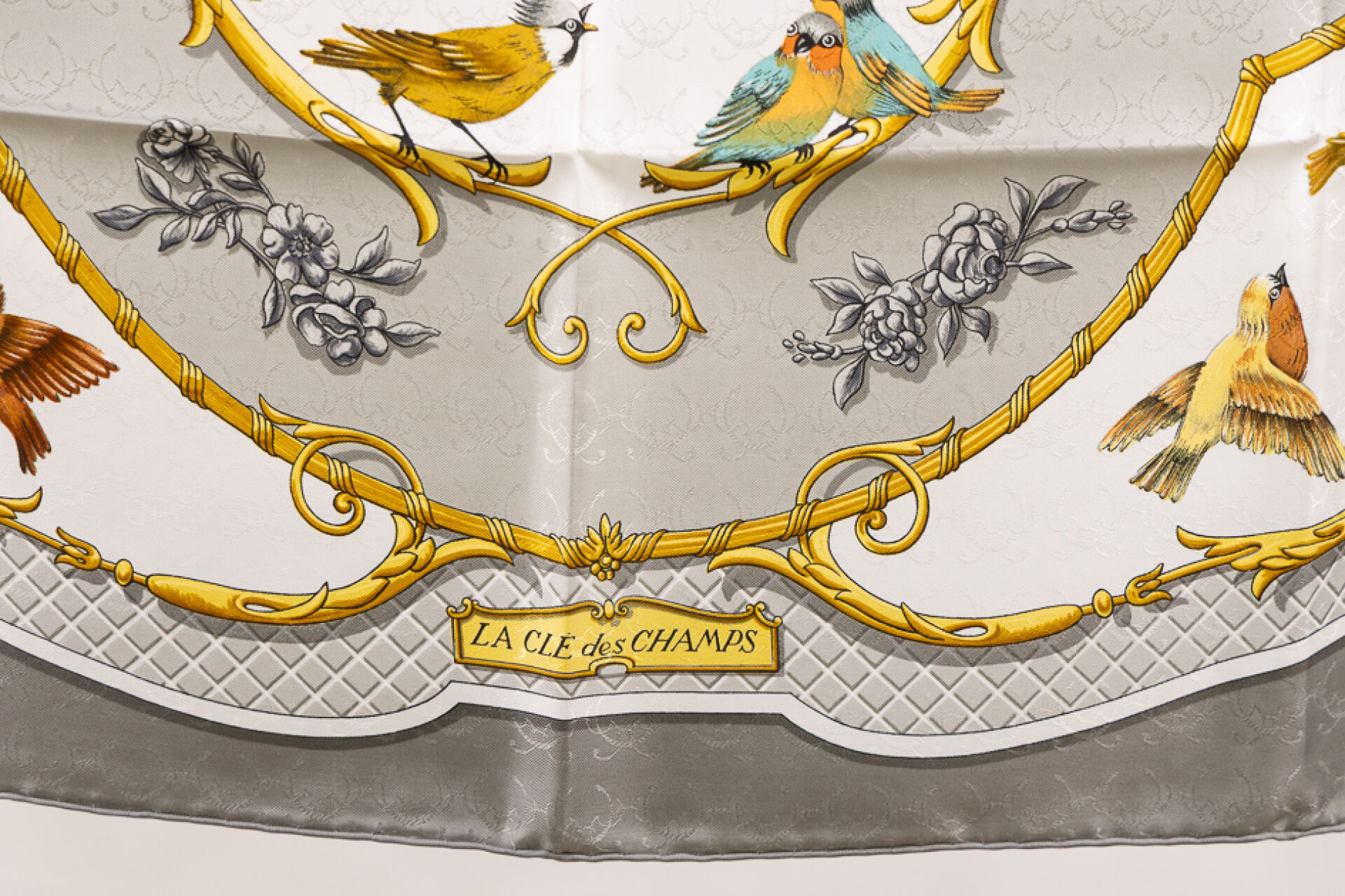 HERMES Paris - Carré en twill de soie damassée imprimée titré "La clé des champs", signé Falconnet à dominantes beige, gris, vert, blanc et doré. 90 x 90 cm Excellent état - Dans sa boite et sa sur boite cadeau