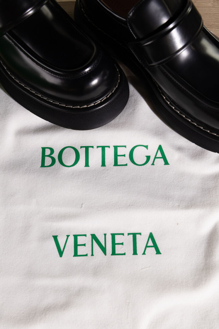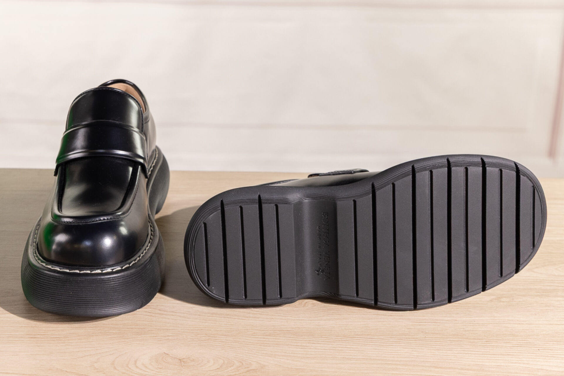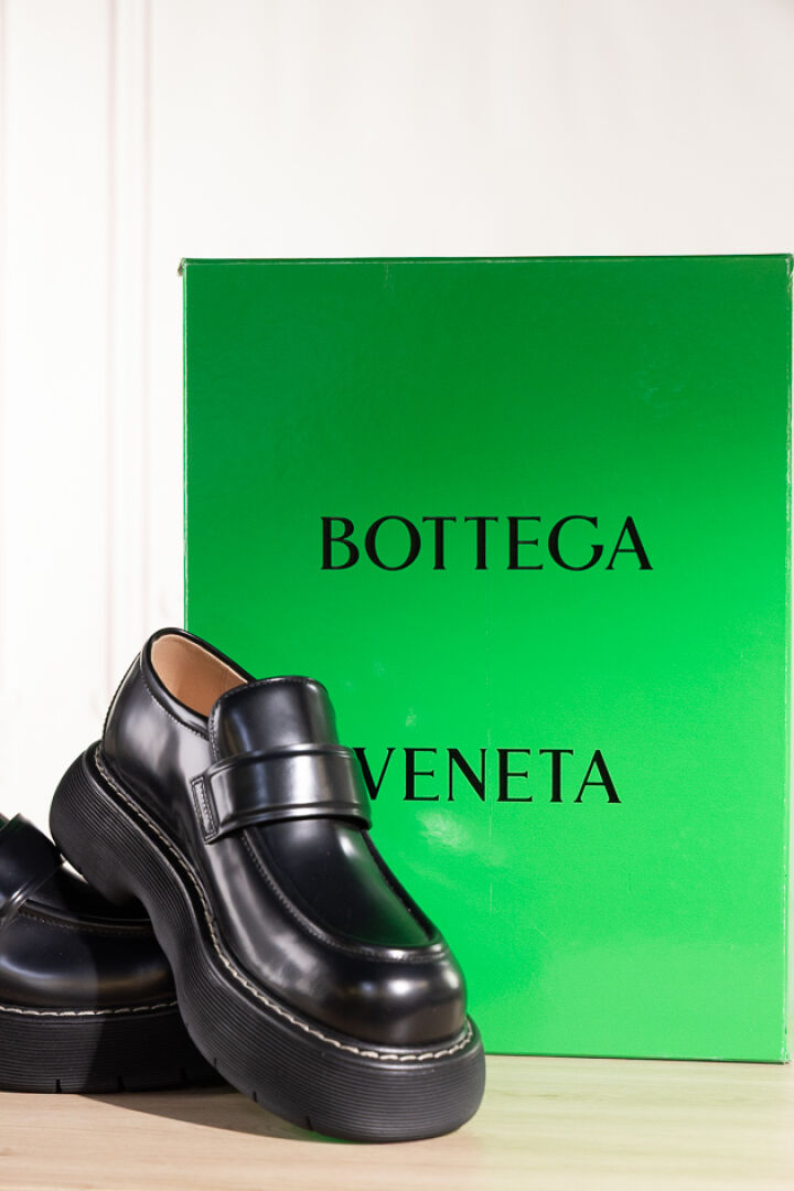 BOTTEGA VENETA - Paire de mocassins stylisés en cuir glacé noir, sur semelles stiées presque compensées. Pointure 41 Non porté, dans la boite abimée
