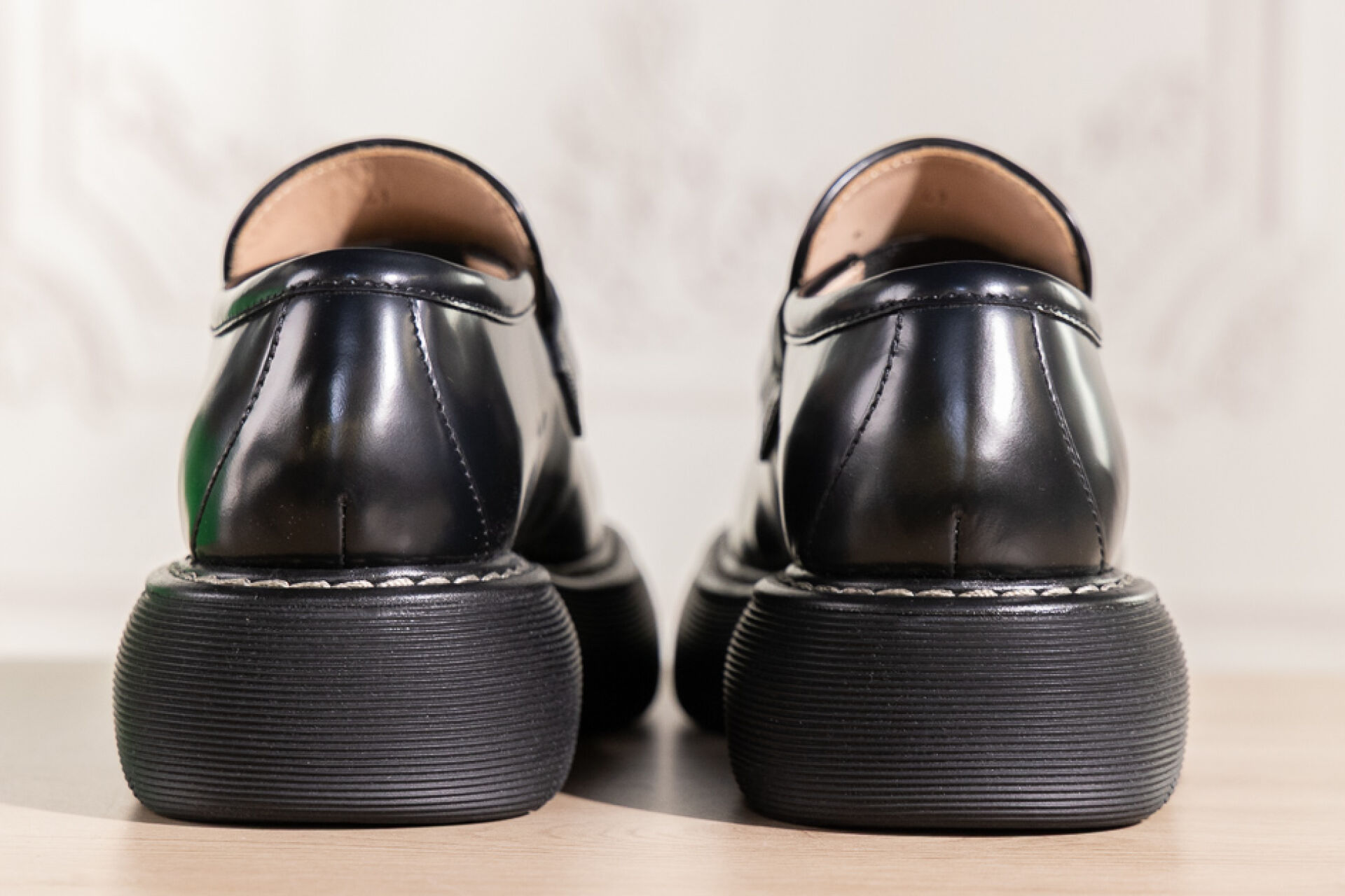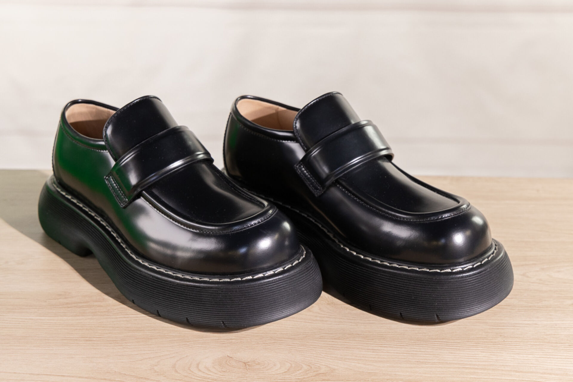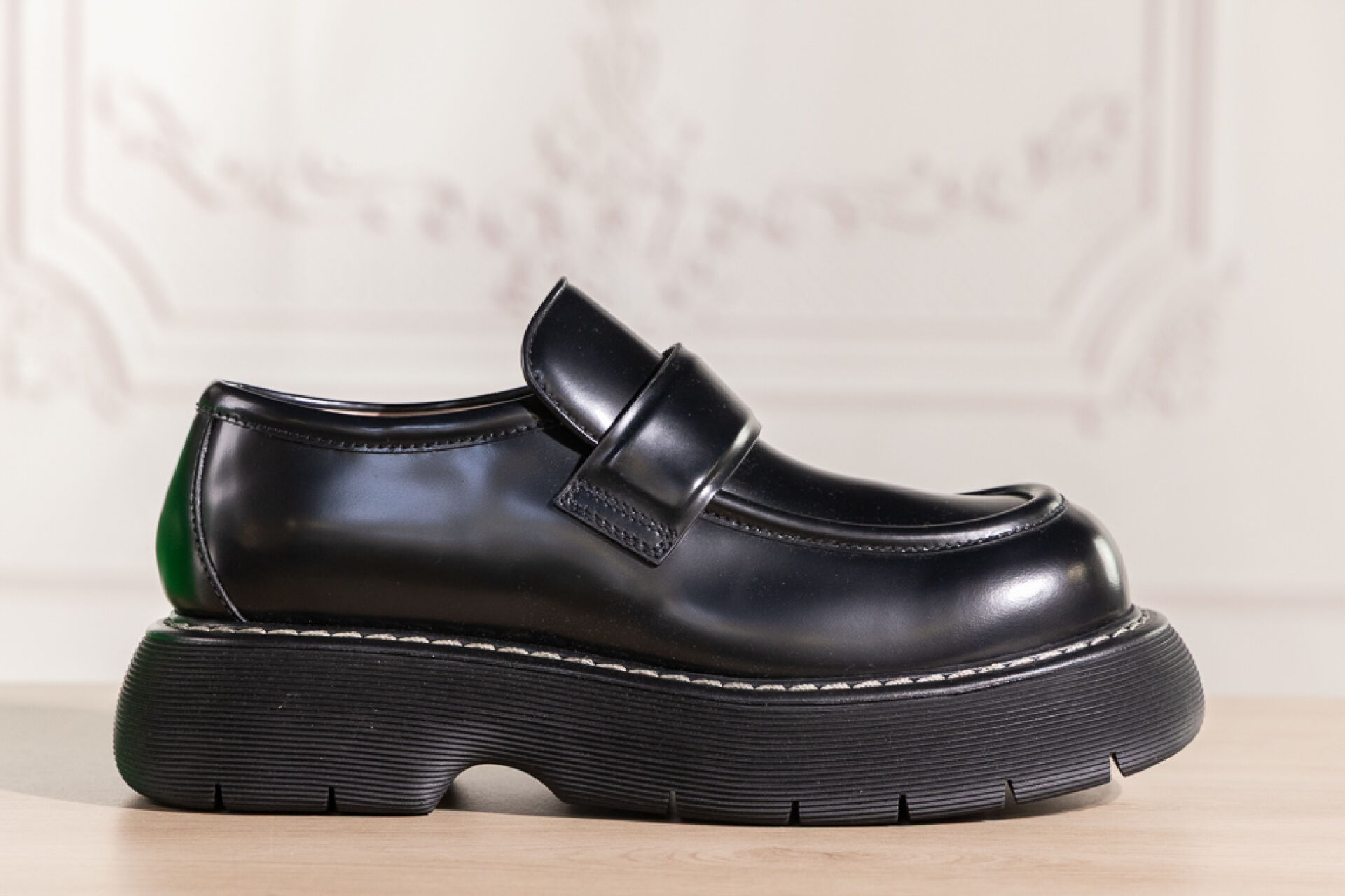 BOTTEGA VENETA - Paire de mocassins stylisés en cuir glacé noir, sur semelles stiées presque compensées. Pointure 41 Non porté, dans la boite abimée