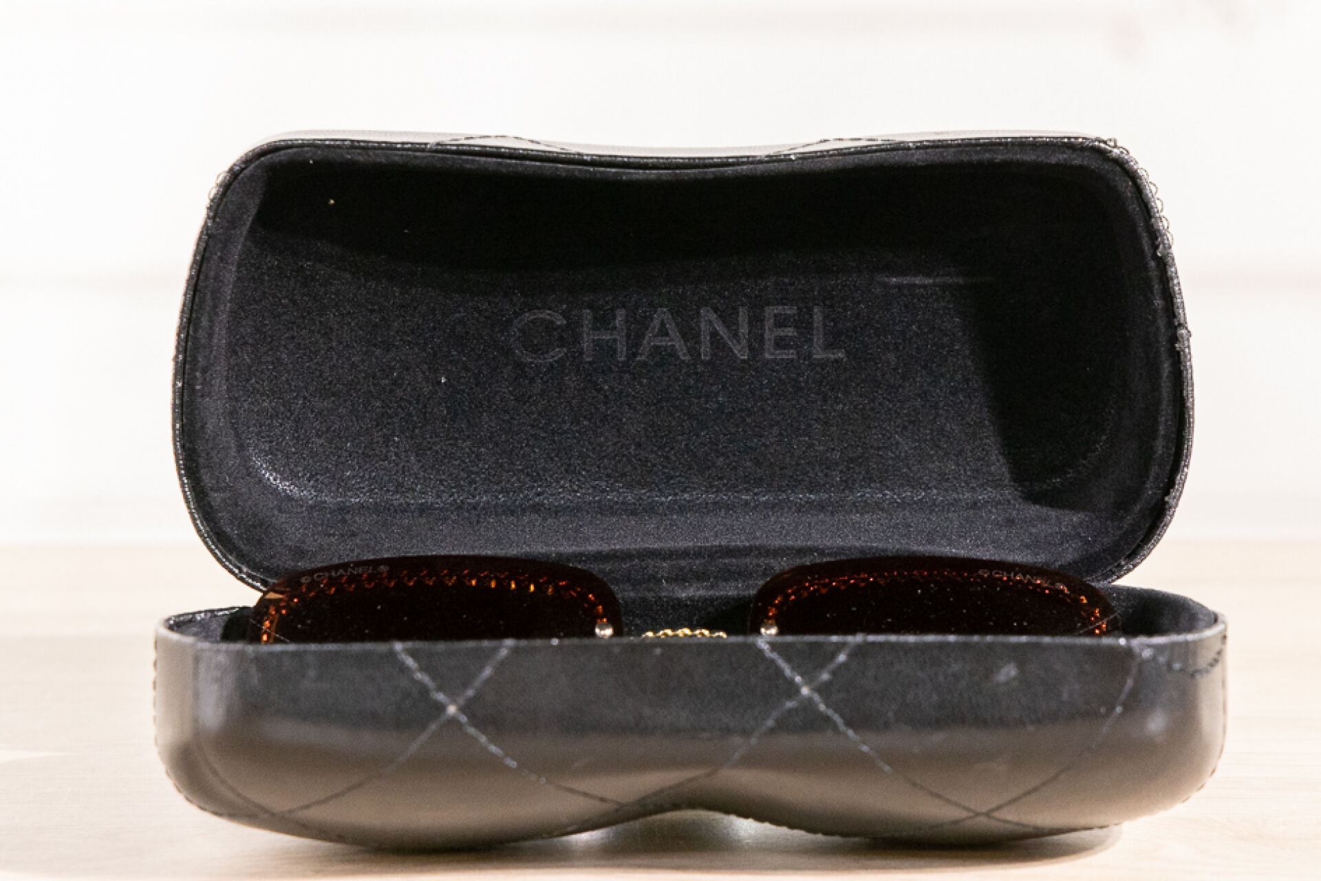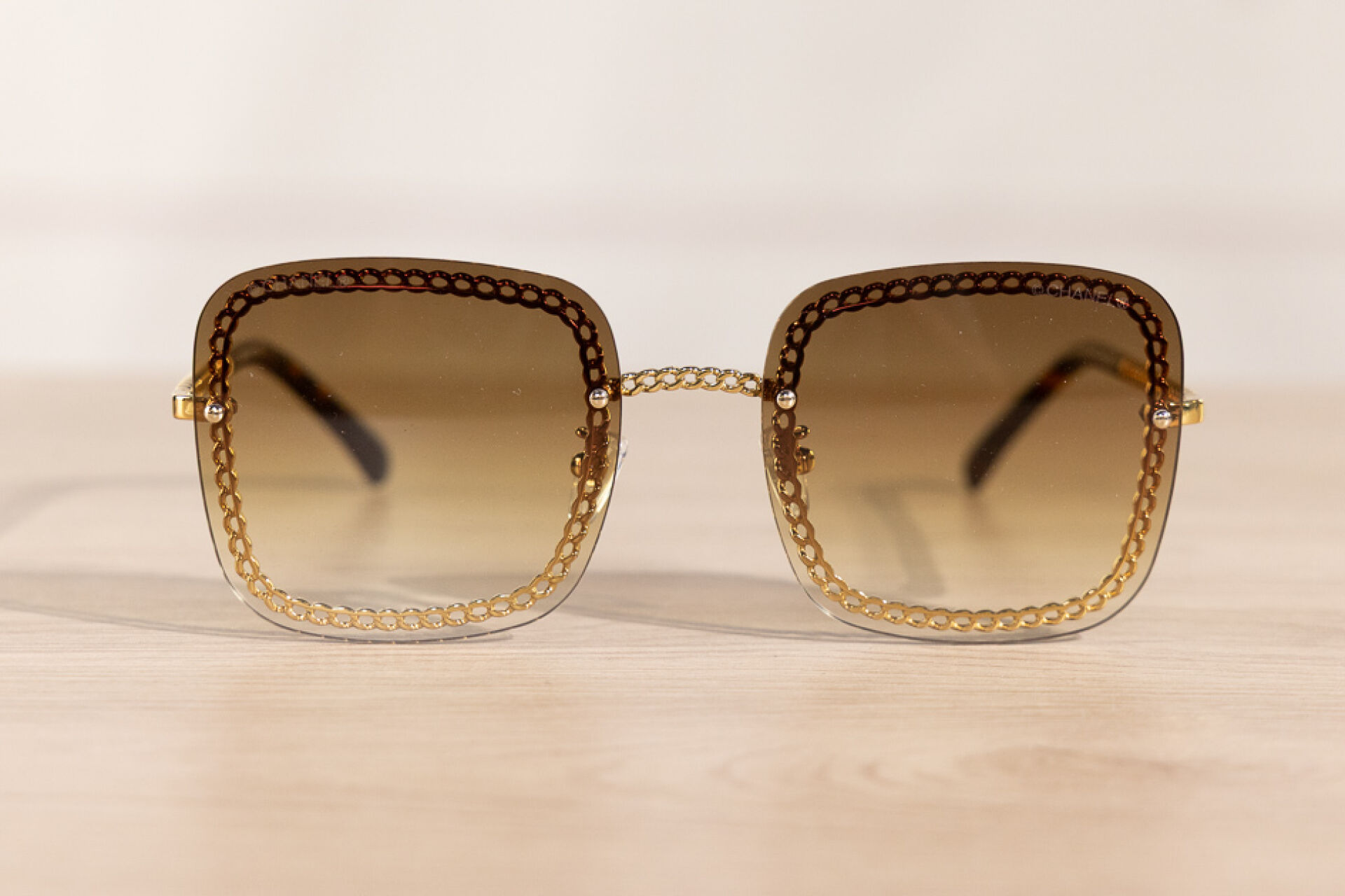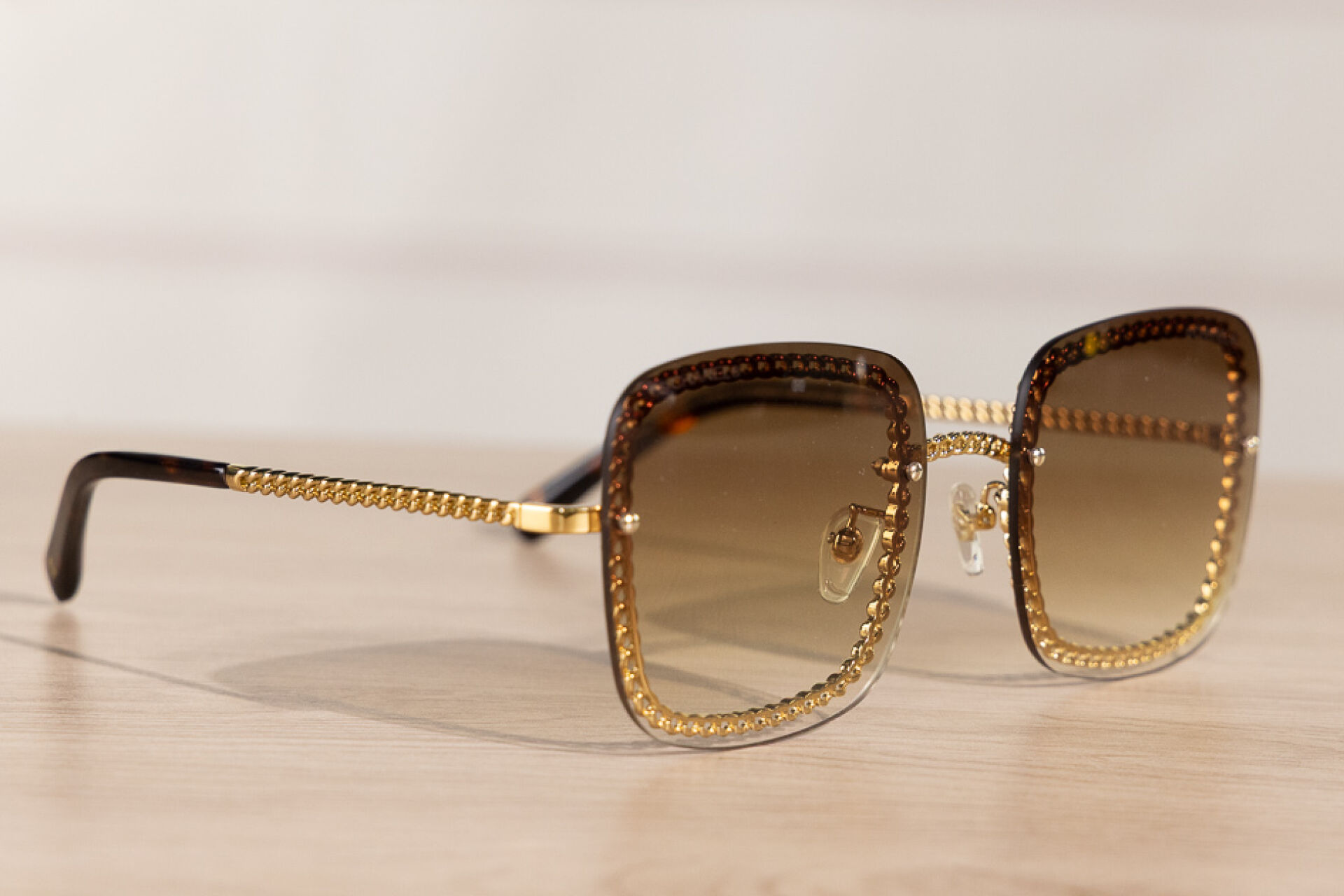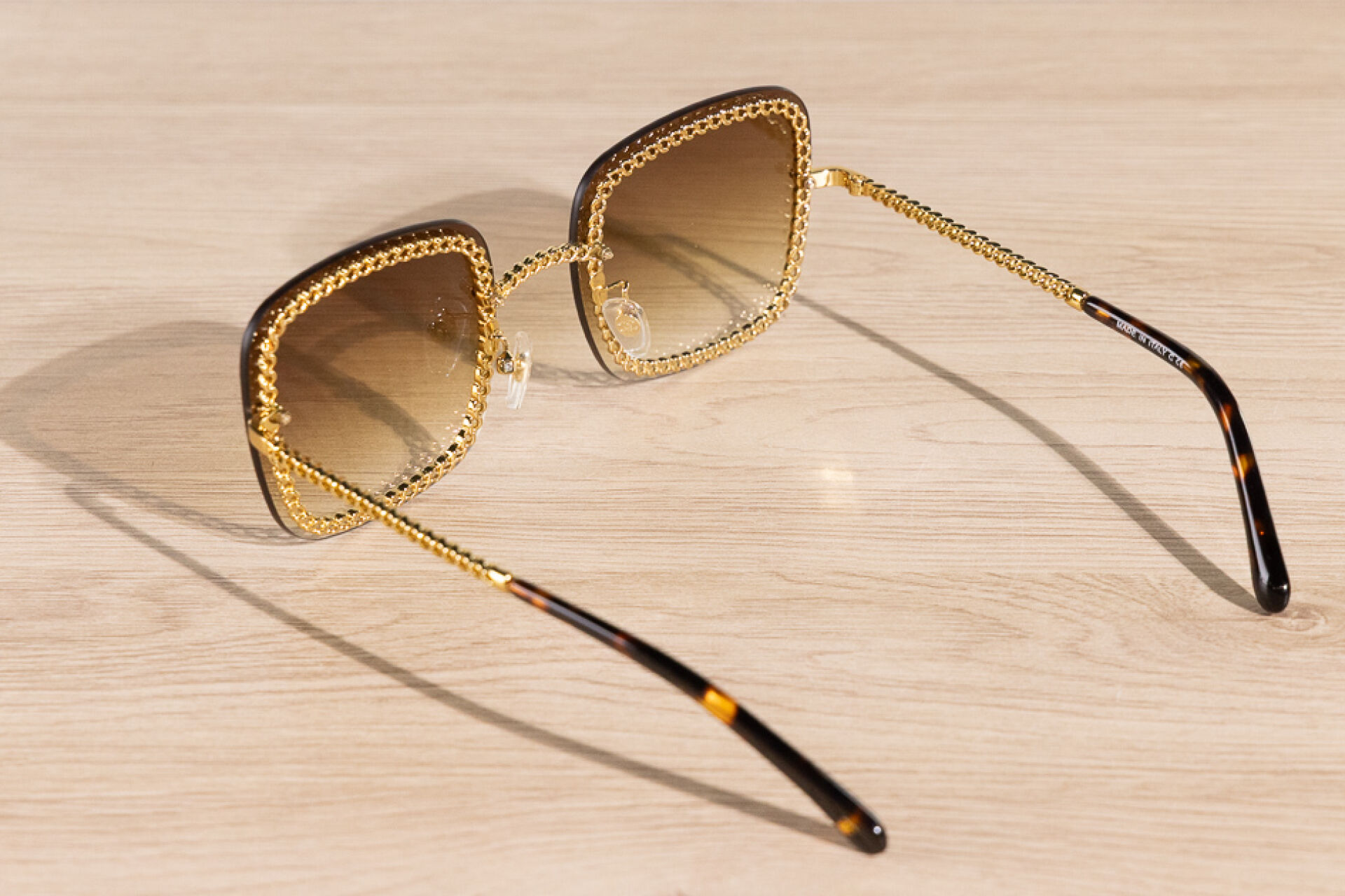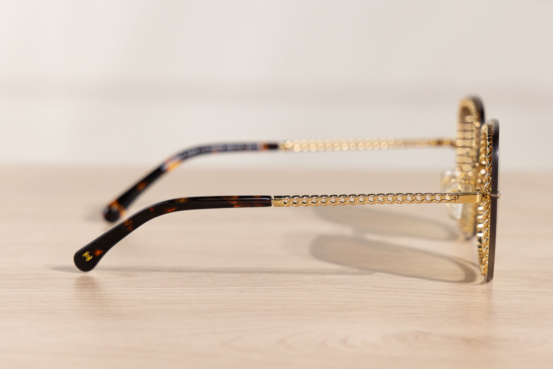 CHANEL - Paire de solaires à verres fumés dégradés, fixés sur chaine dorée se prolongeant sur les branches à finition panthère. Dans leur boite.