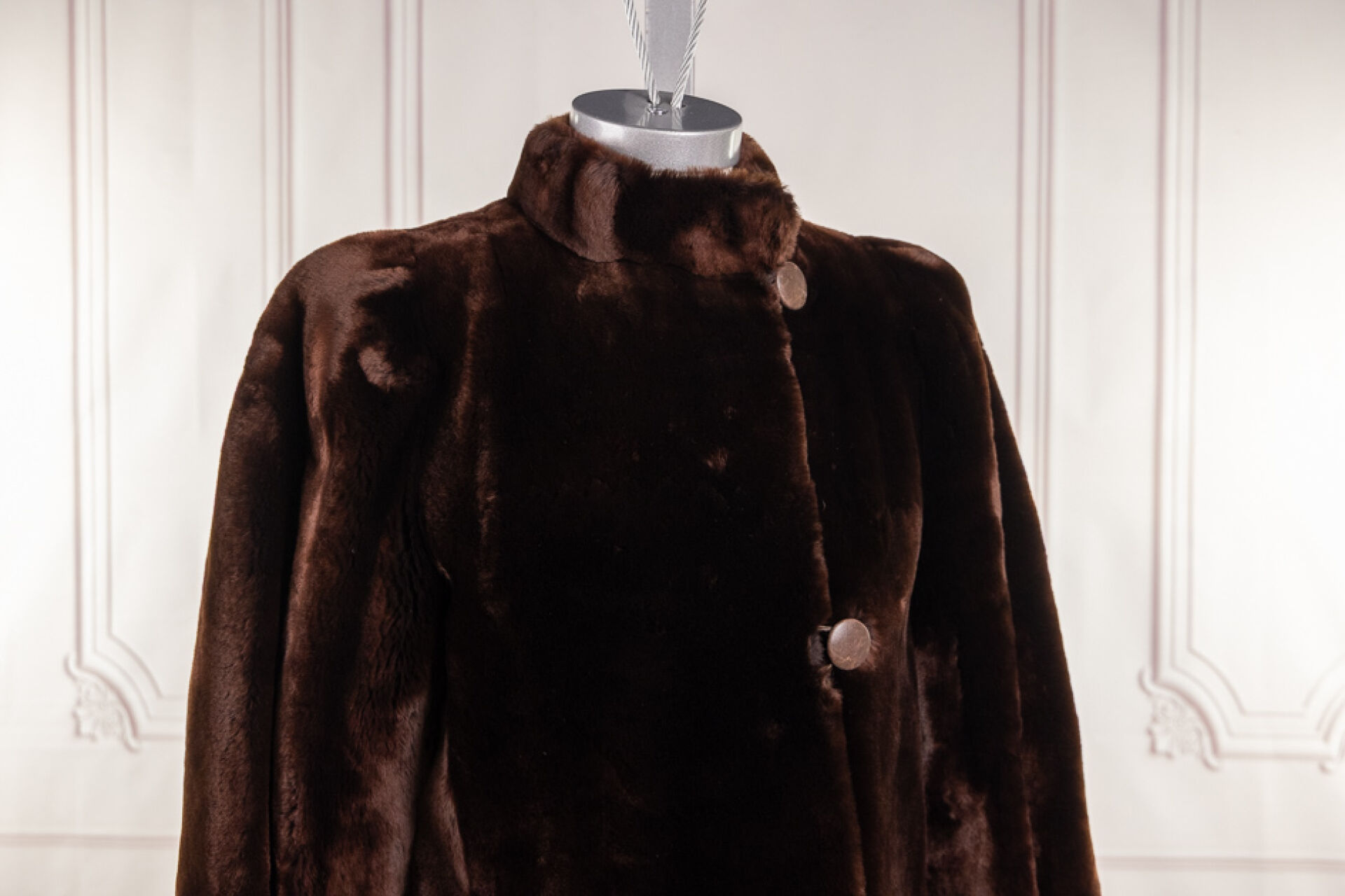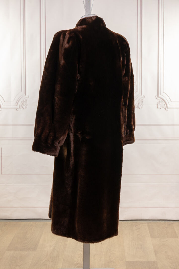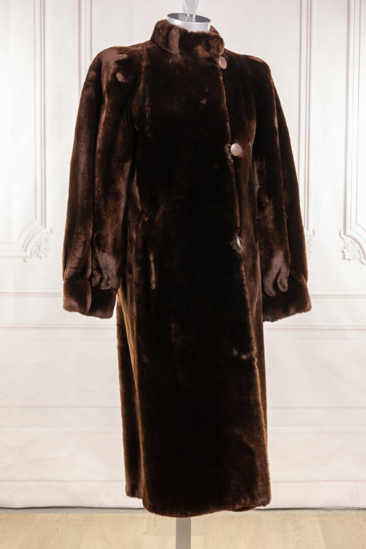 SPRUNG Frères, Paros - Manteau en mouton doré à col montant, simple boutonnage, deux poches verticales, manches longues aux poignets resserrés. Taille supposée 38 Usures, griffe recousue