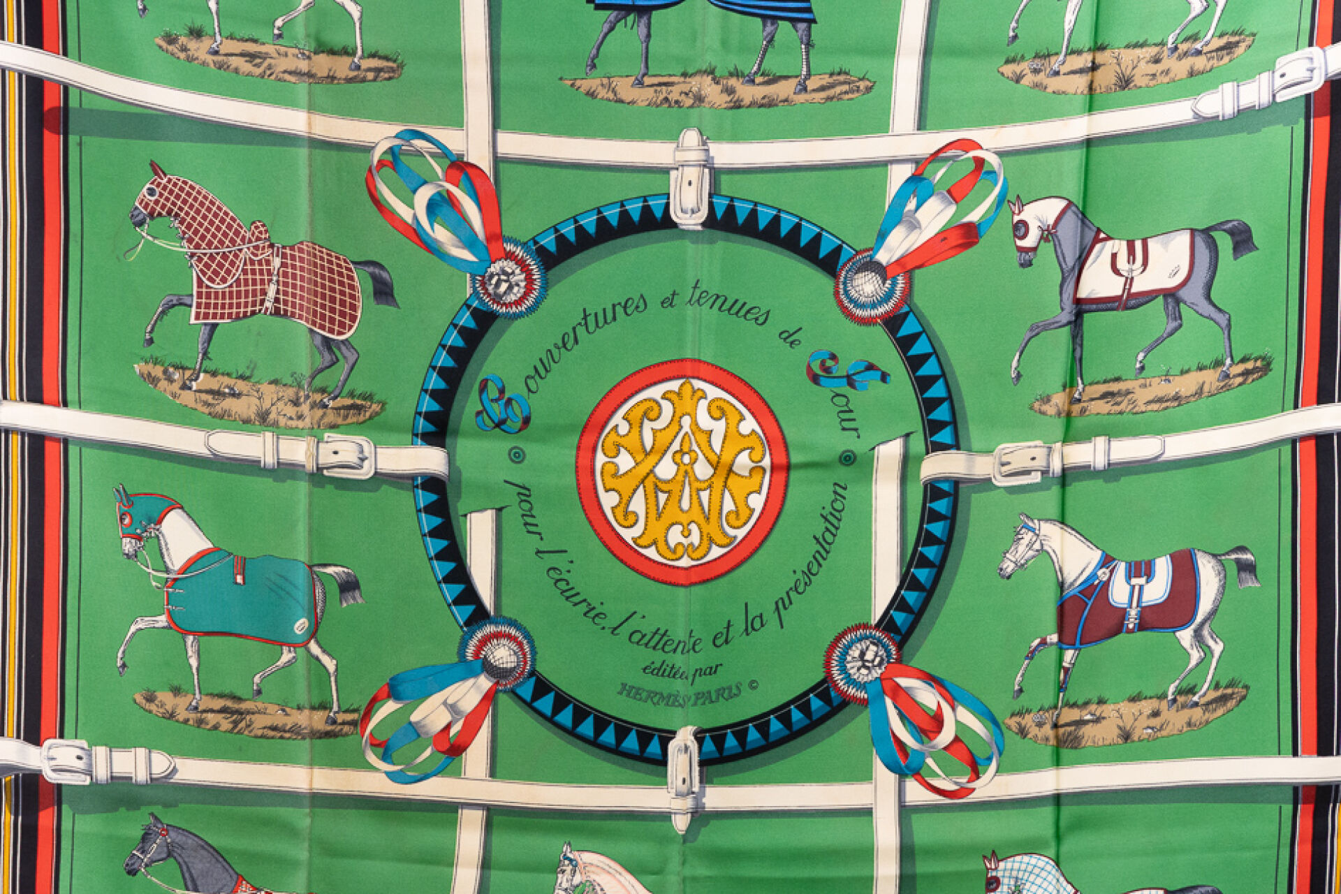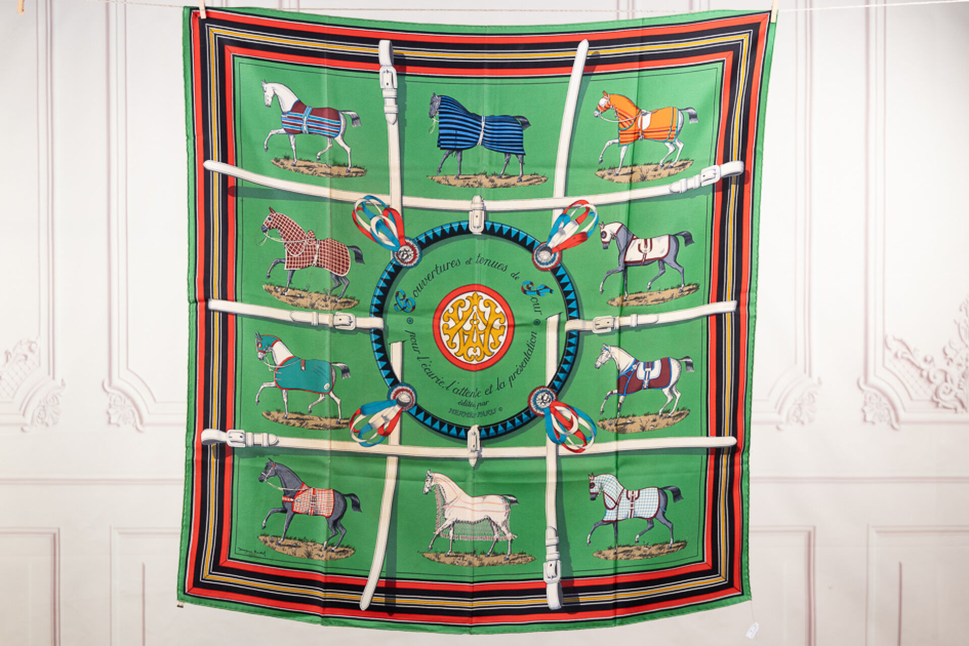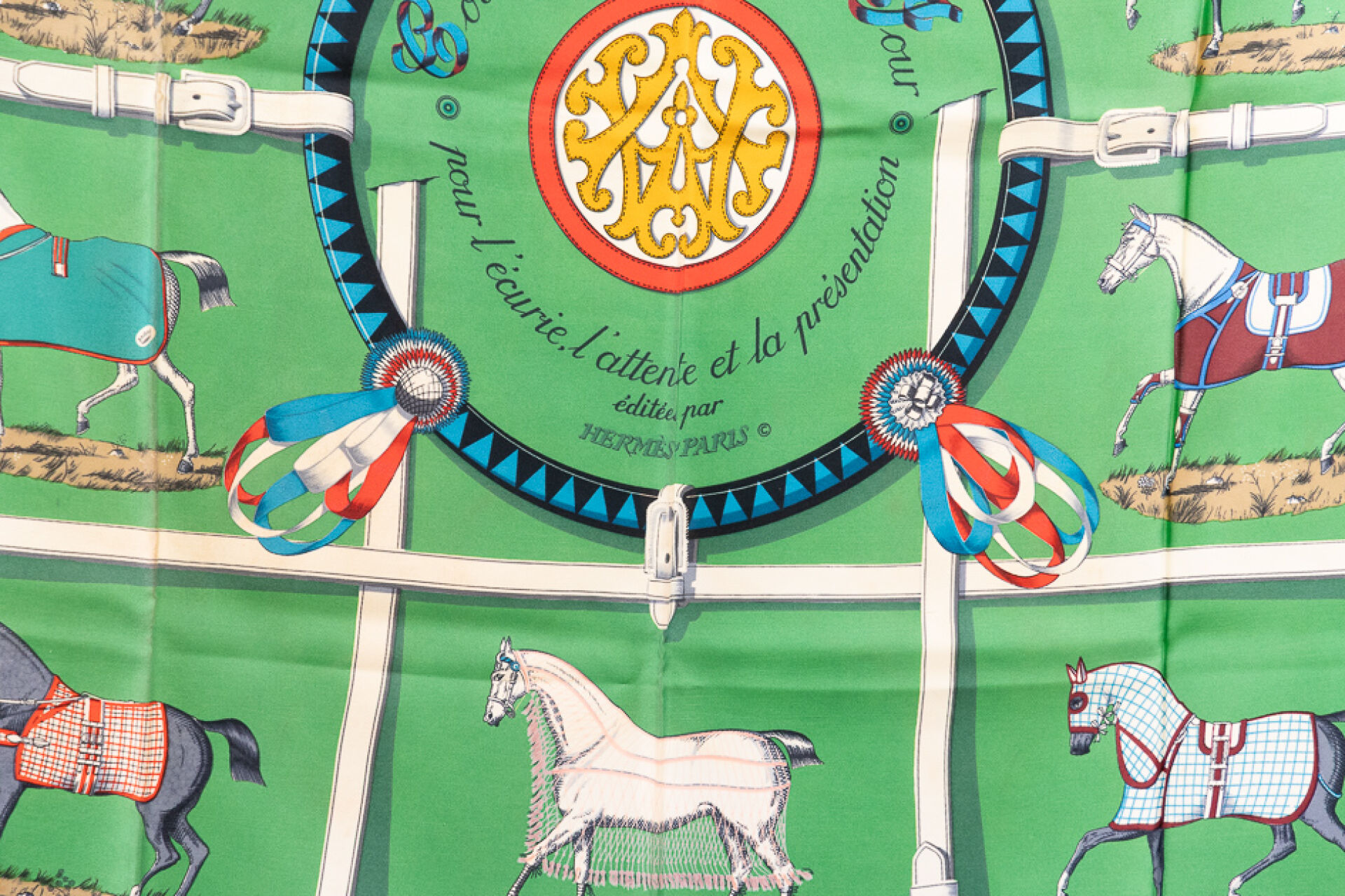 HERMES Paris - Carré en twill de soie imprimée, titré "Couvertures et tenues de Jour pour l'écurie, l'attente et la présentation", signé Jacques Endef, fond vert. 90 x 90 cm Tâches, auréoles