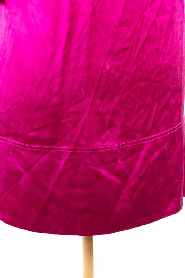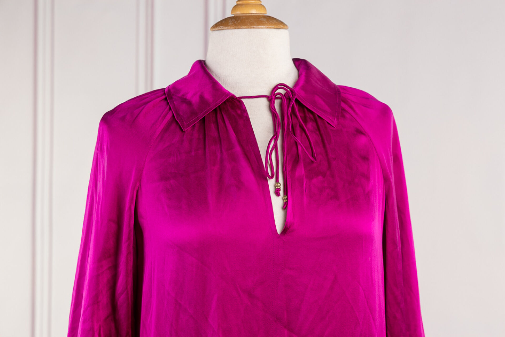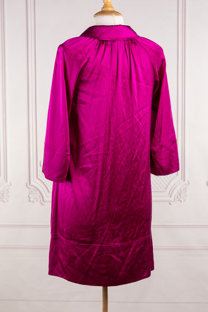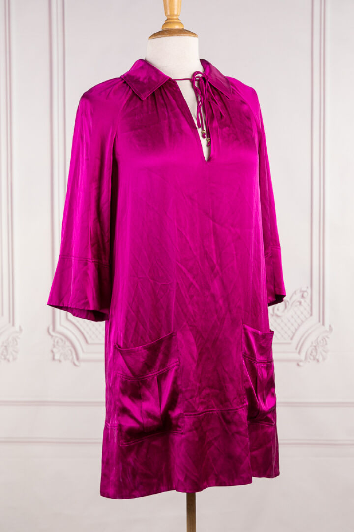 DIANE VON FURSTENBERG - Robe/tunique soie fuschia, deux poches plaquées, lien coulissant au col sur décolleté V et manches 3/4 raglan. Taille 6 Tâches