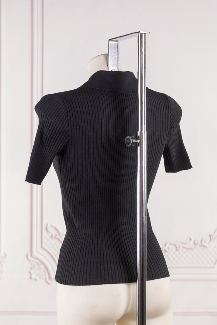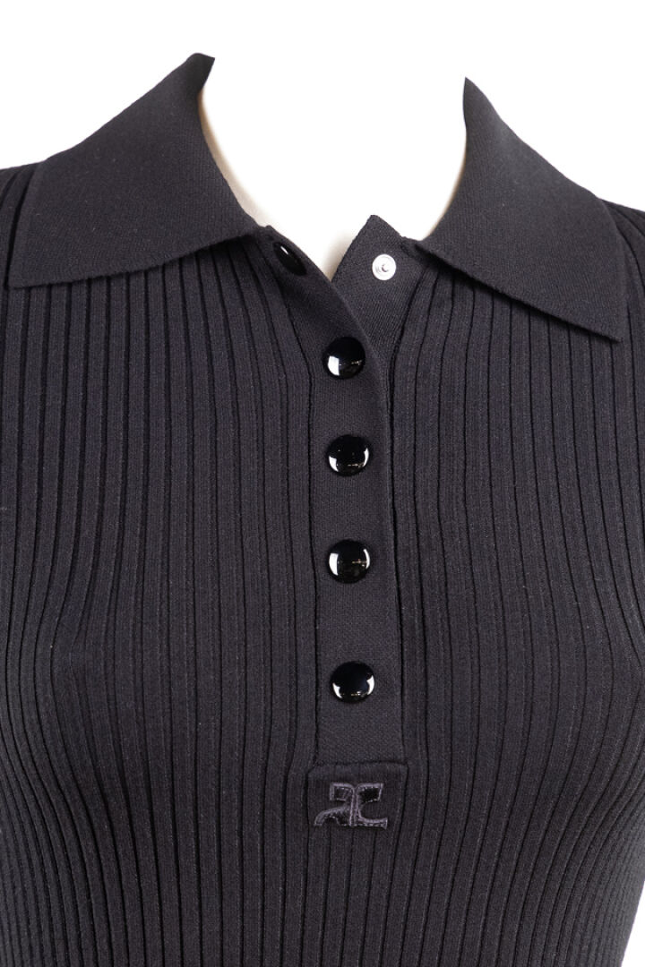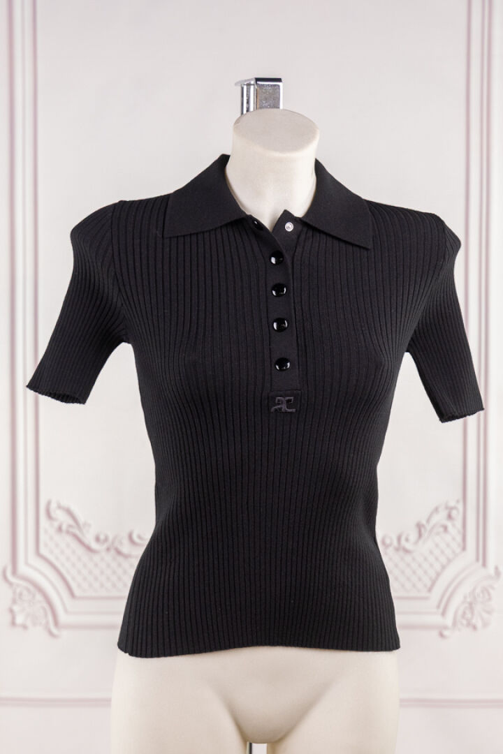 COURREGES - Polo en polyester côtelé noir, manches courtes. Taille XS Non porté, étiquette d'origine