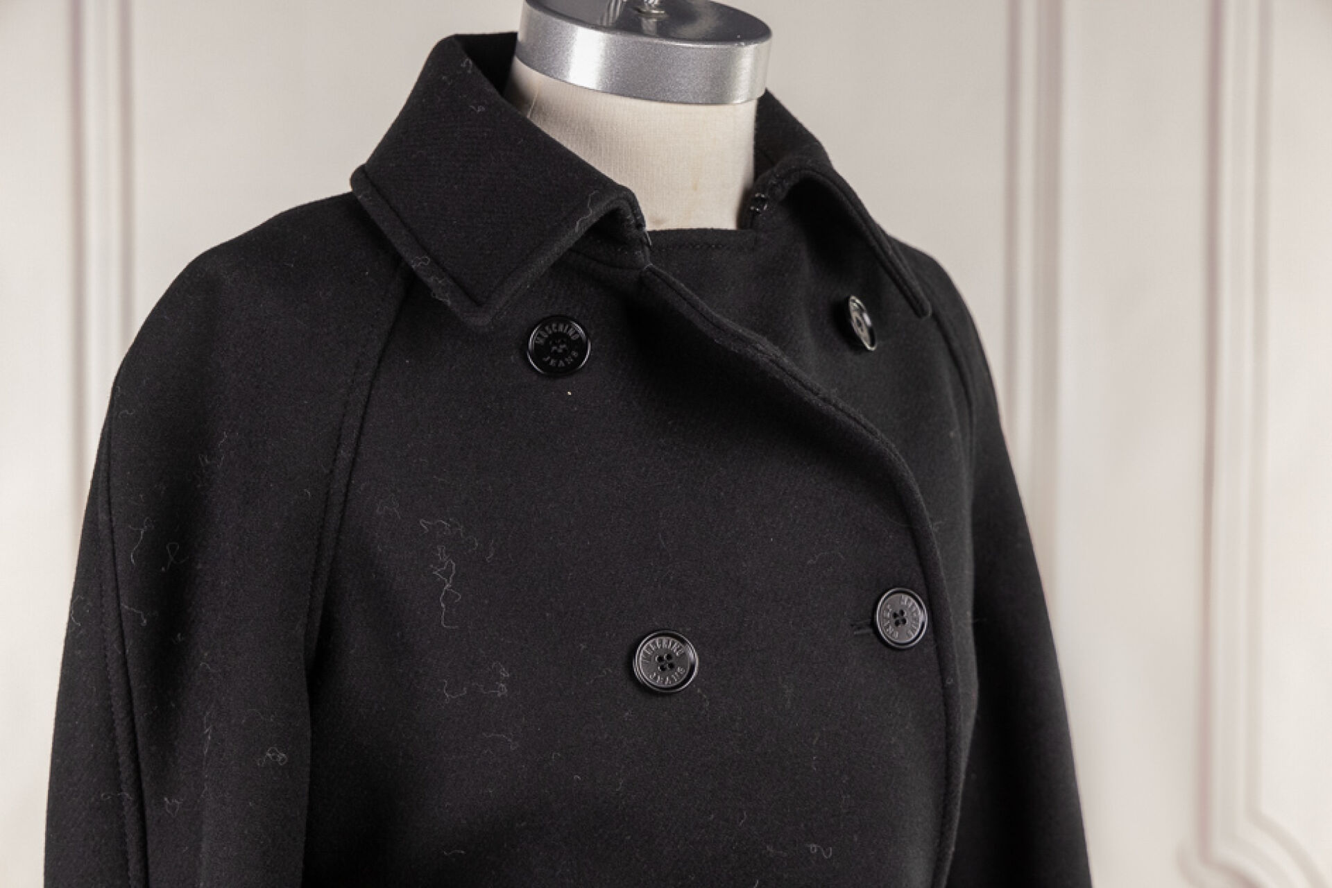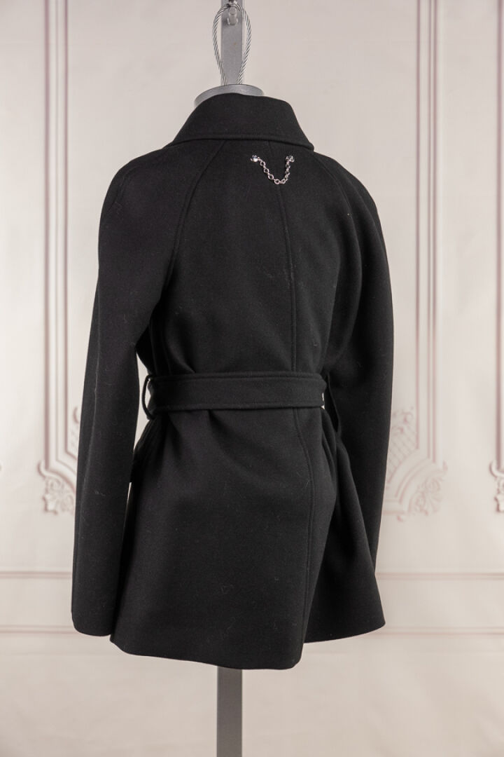 MOSCHINO Jeans - Caban en lainage noir, col, double boutonnage, manches longues raglan, deux poches sous rabat, ceinture. Taille 38 Non porté, étiquette d'origine