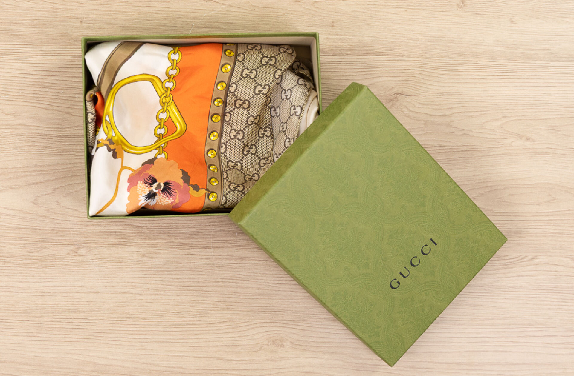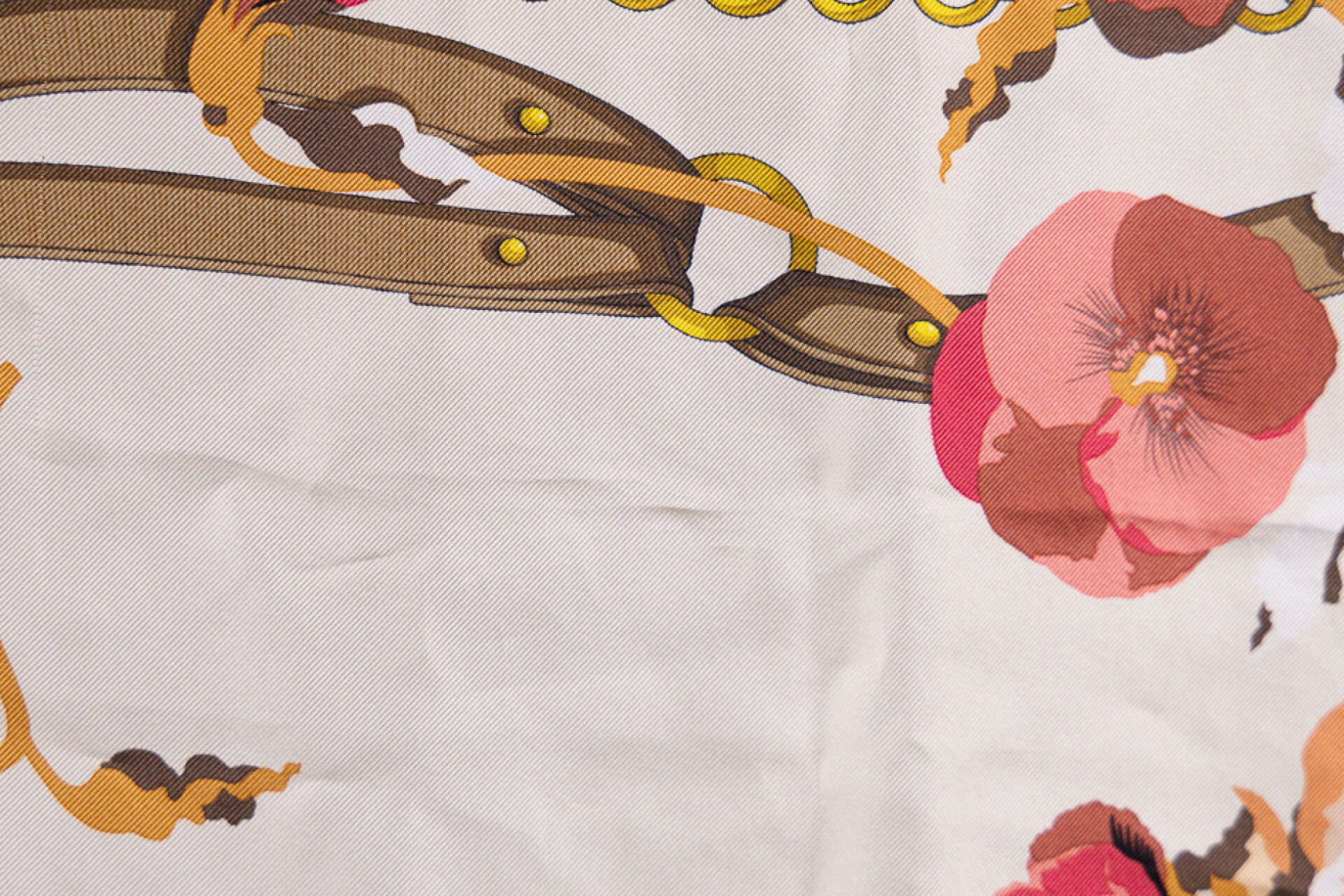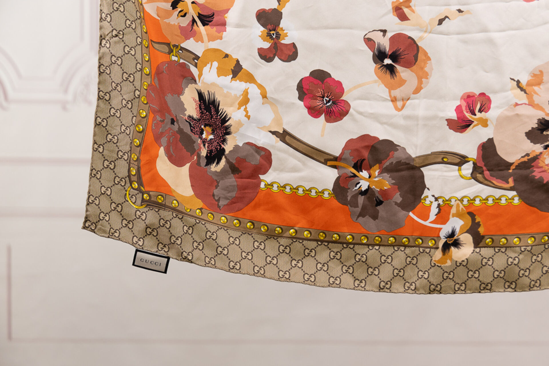 GUCCI - Carré en soie imprimée de fleurs et sangles sur fond blanc. Dans sa boite. 90 x 90 cm Très bon état
