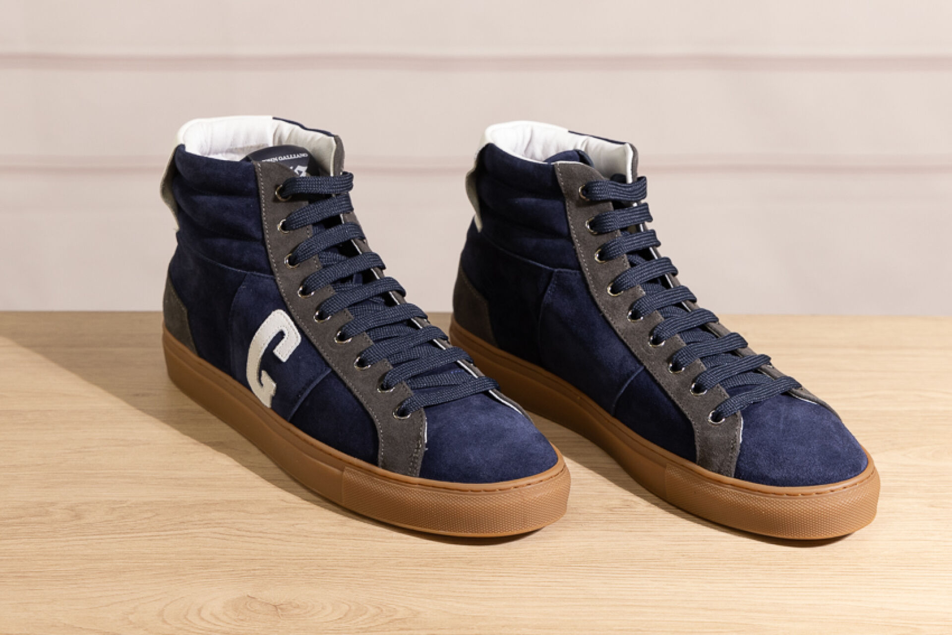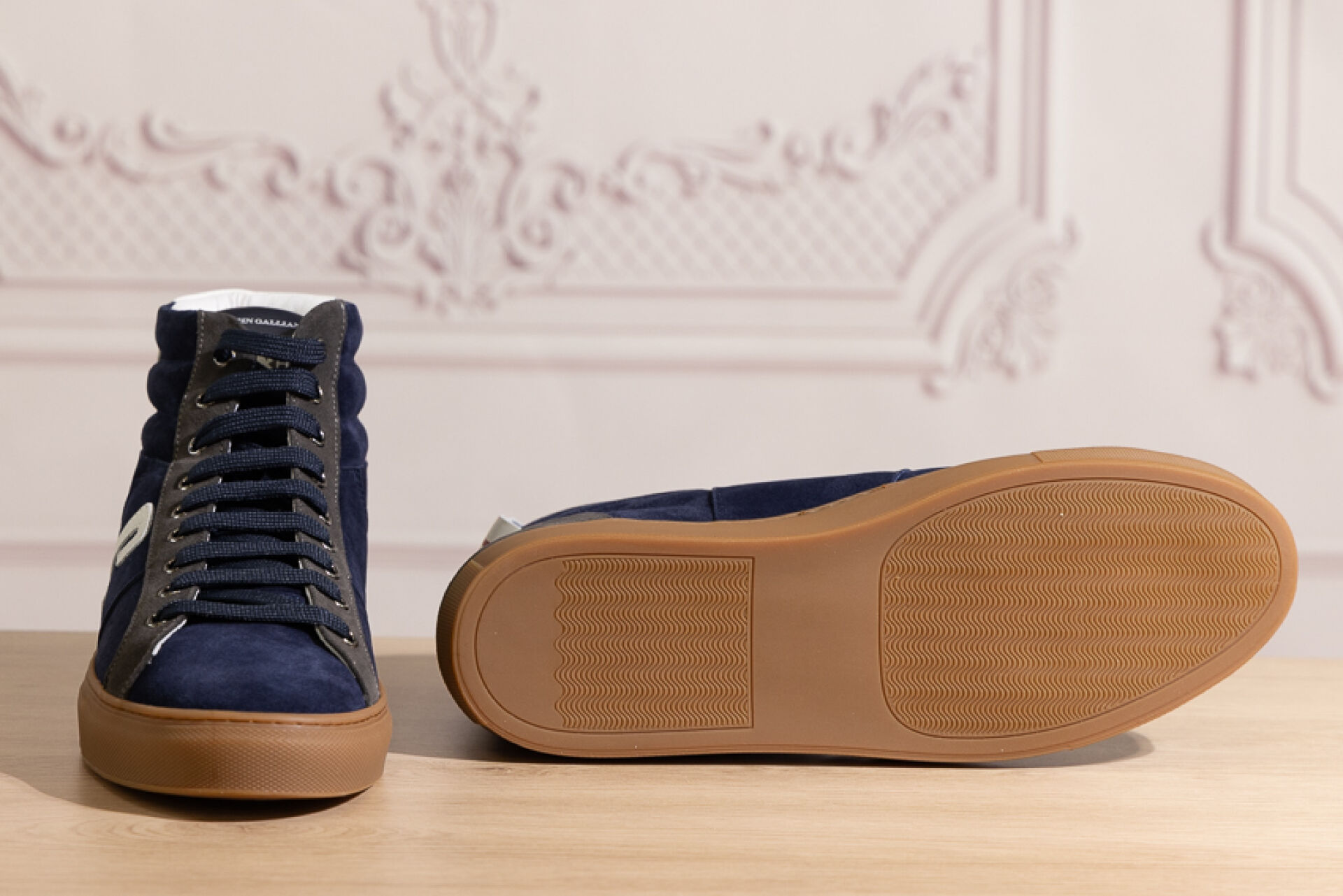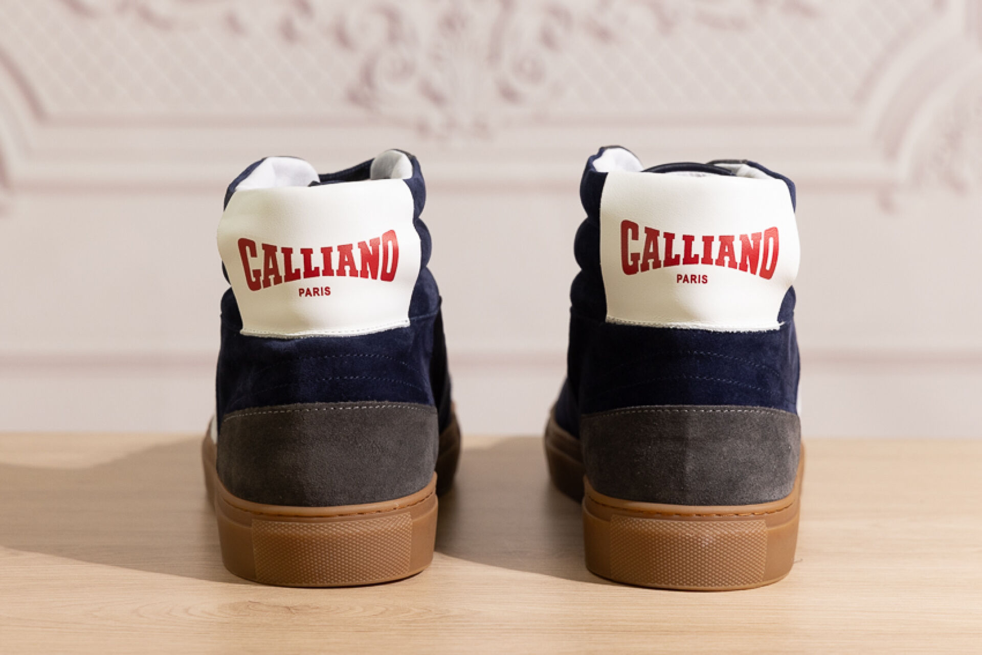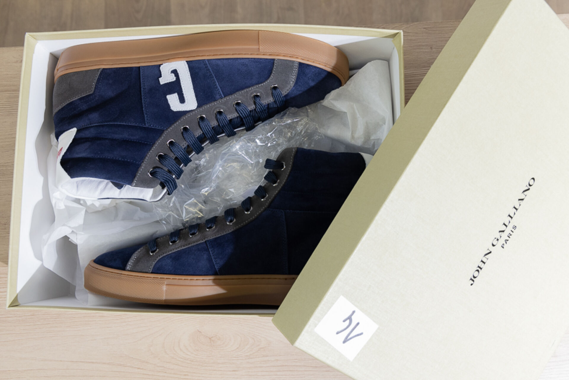 JOHN GALLIANO - Paire de baskets montantes à lacets en daim marine, gris et G plus clair en application, marque Galliano sen rouge sur empiècement de cuir blanc au dos. Dans leur boite. Pointure 45 État magasin