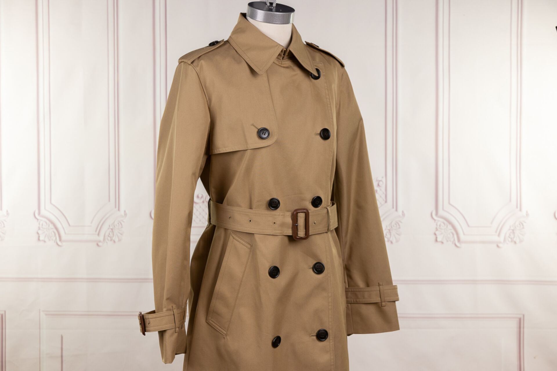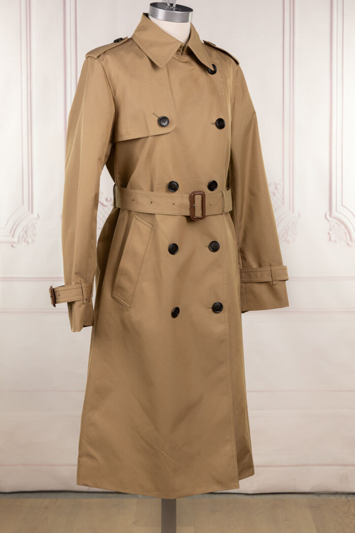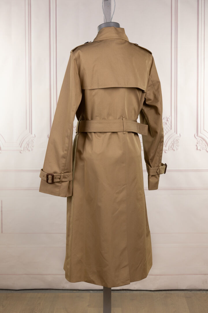COACH - Trench coat en gabardine beige, col double boutonnage, bavolets devant droit boutonnés et dos, pattes d'épaule à l'identique, ceinture, deux poches verticales, fente dos. Taille indiquée S Non porté, étiquette d'origine