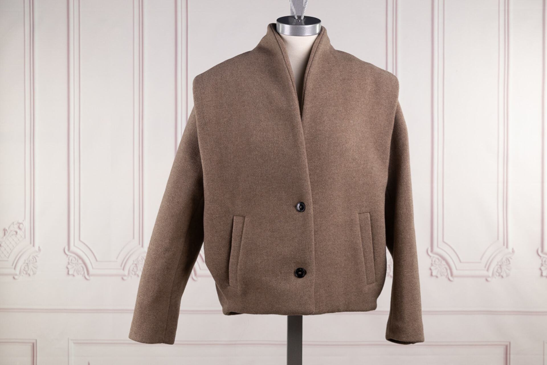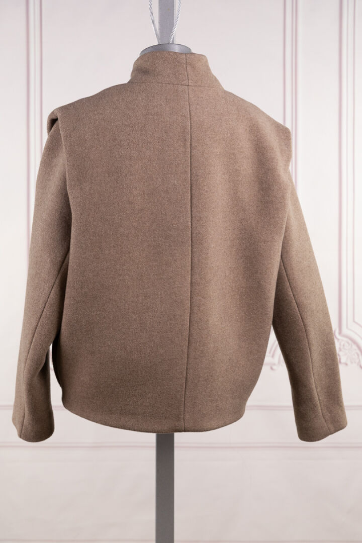 ISABEL MARANT - Veste façon blouson en drap de laine mélangée chinée beige, col montant à finition V sur simple boutonnage, deux poches verticales, manches longues à découpe aux épaules. Taille indiquée 34 (taillant 38) Etiquette d'origine, non portée
