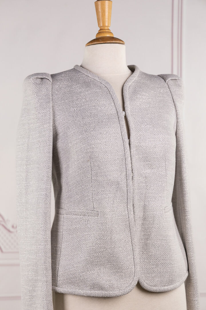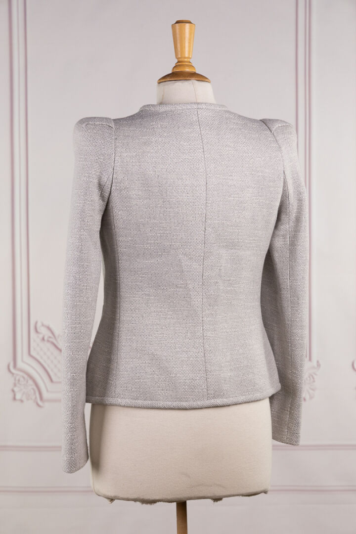 ARMANI COLLEZIONI - Veste en tweed gris blanc irisé, sans col, simple boutonnage agrafe, deux poches horizontales, manches longues montées. Taille indiquée 42 (38 français) Bon état