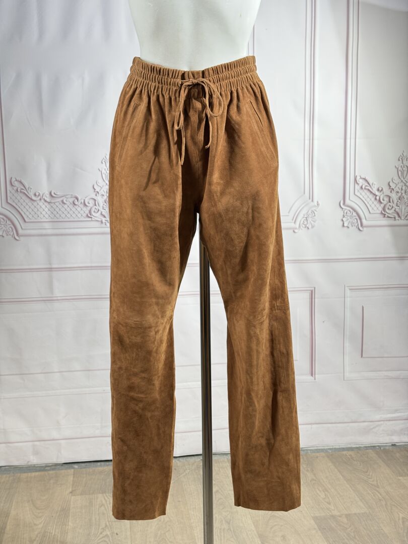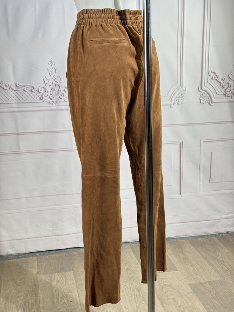 KUJTEN - Pantalon "Yaelle" en peau camel, taille coulissée sur élastique, deux poches en biais. Taille indiquée M Non porté