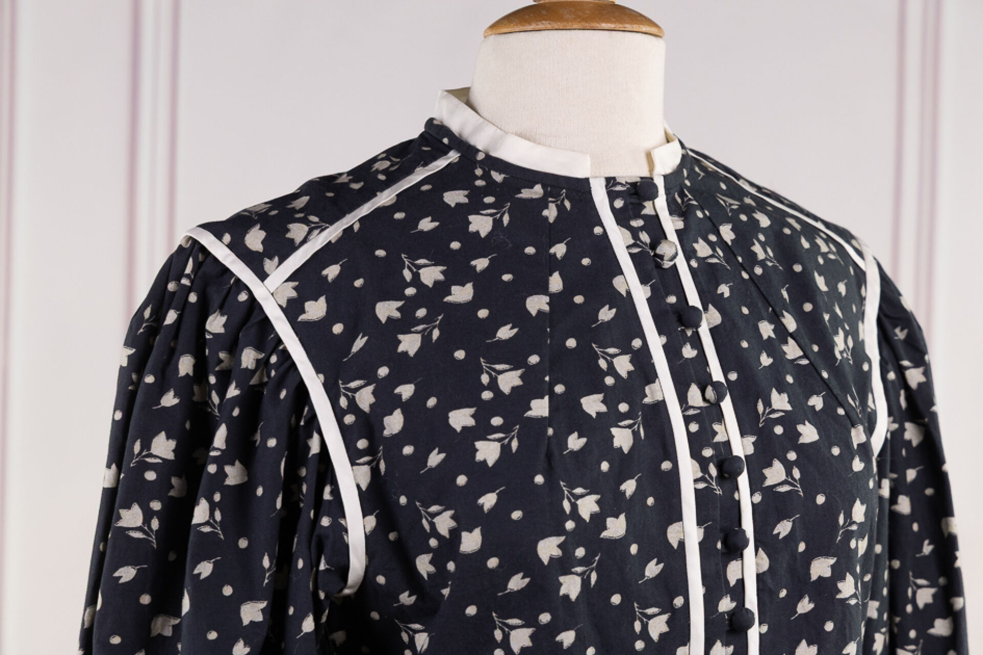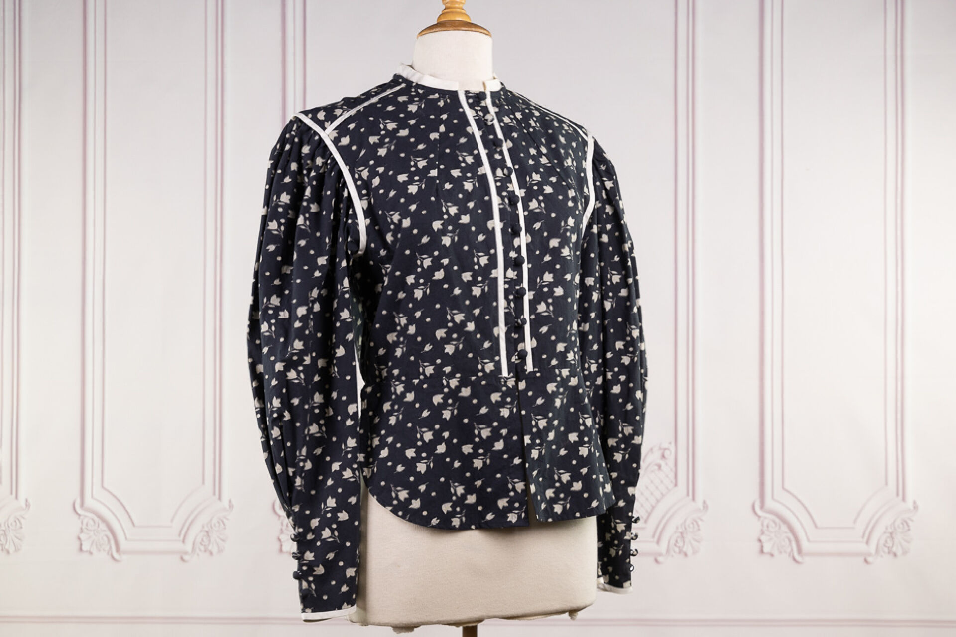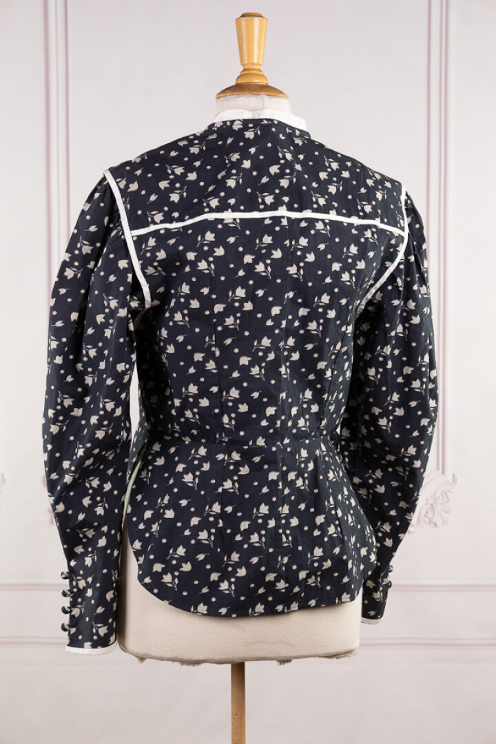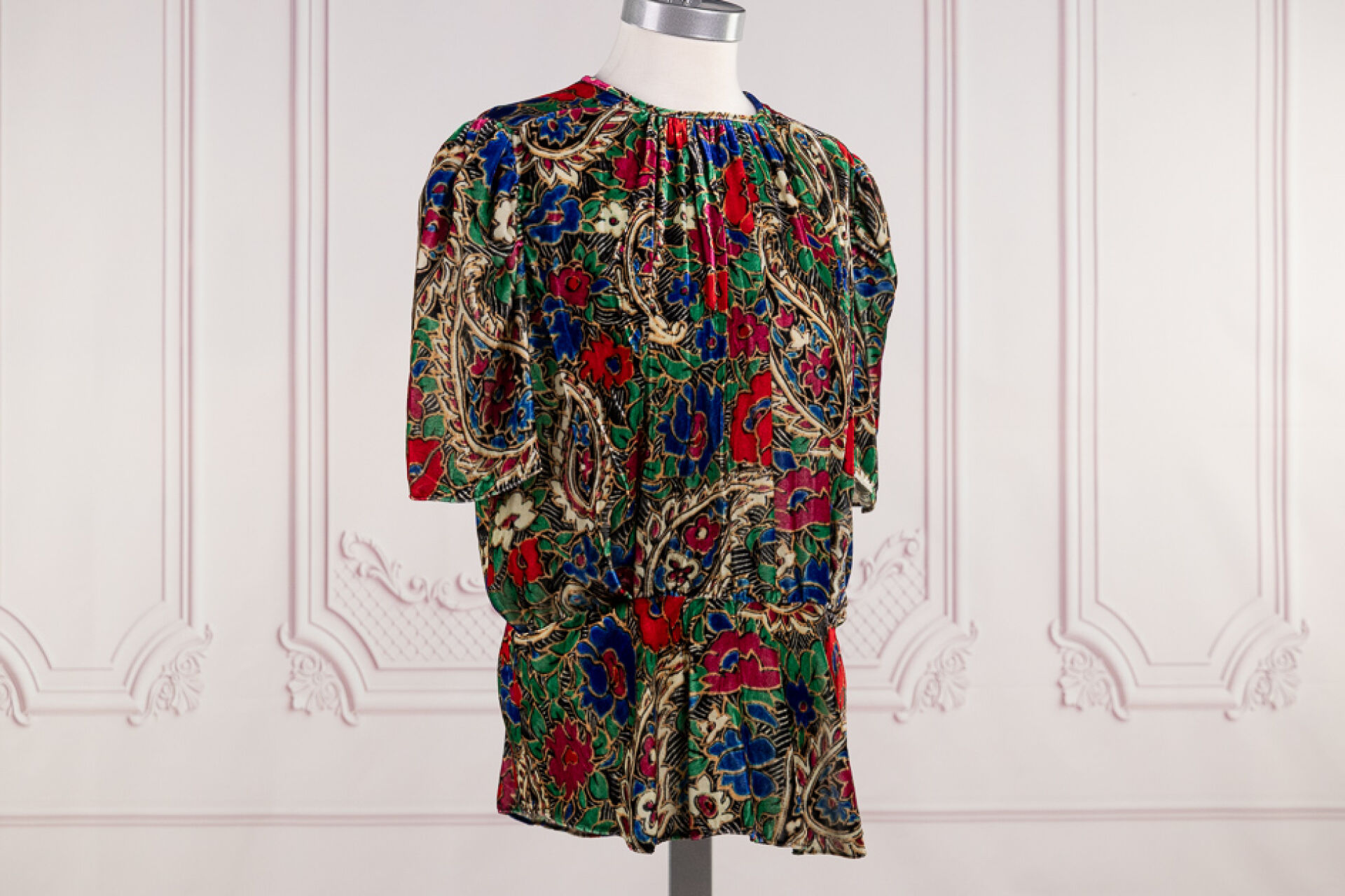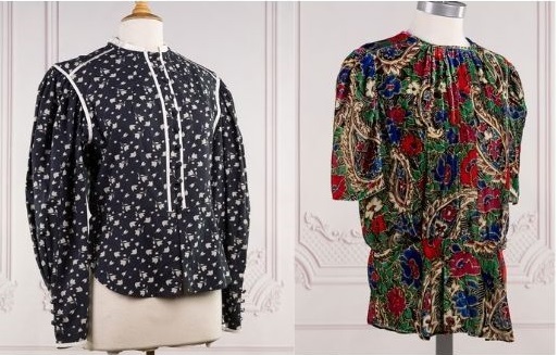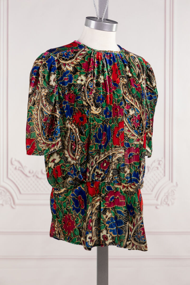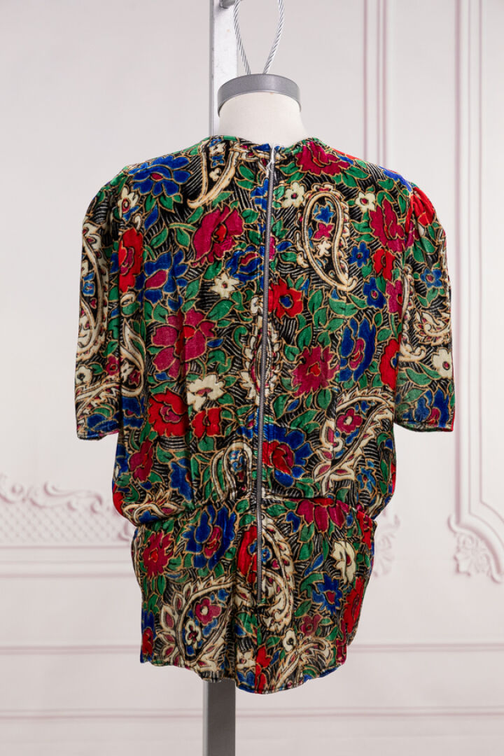 ISABEL MARANT - Lot de deux tops l'un en velours imprimé floral multicolore, à manches courtes, l'autre chemisier en coton gris imprimé de fleurs blanches. Taille indiquée 42 Salissures
