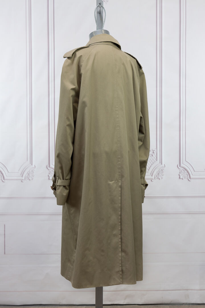 BURBERRY - Imperméable pour homme en gabardine beige, col, double boutonnage, pattes d'épaules sur manches longues raglans, deux poches verticales boutonnées, fente dos, doublure tartan. Taille supposée 54 Déjà porté, traces d'usage