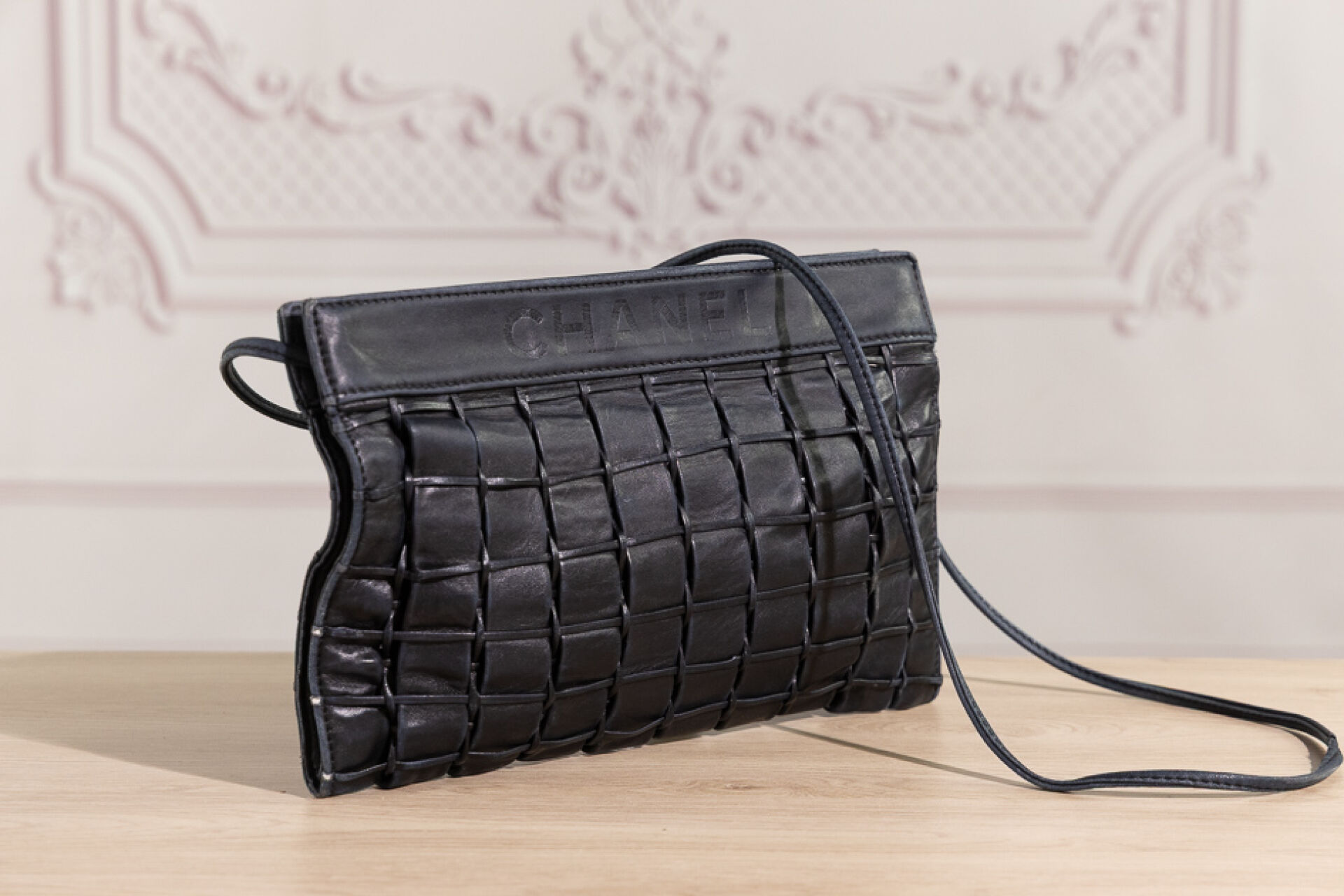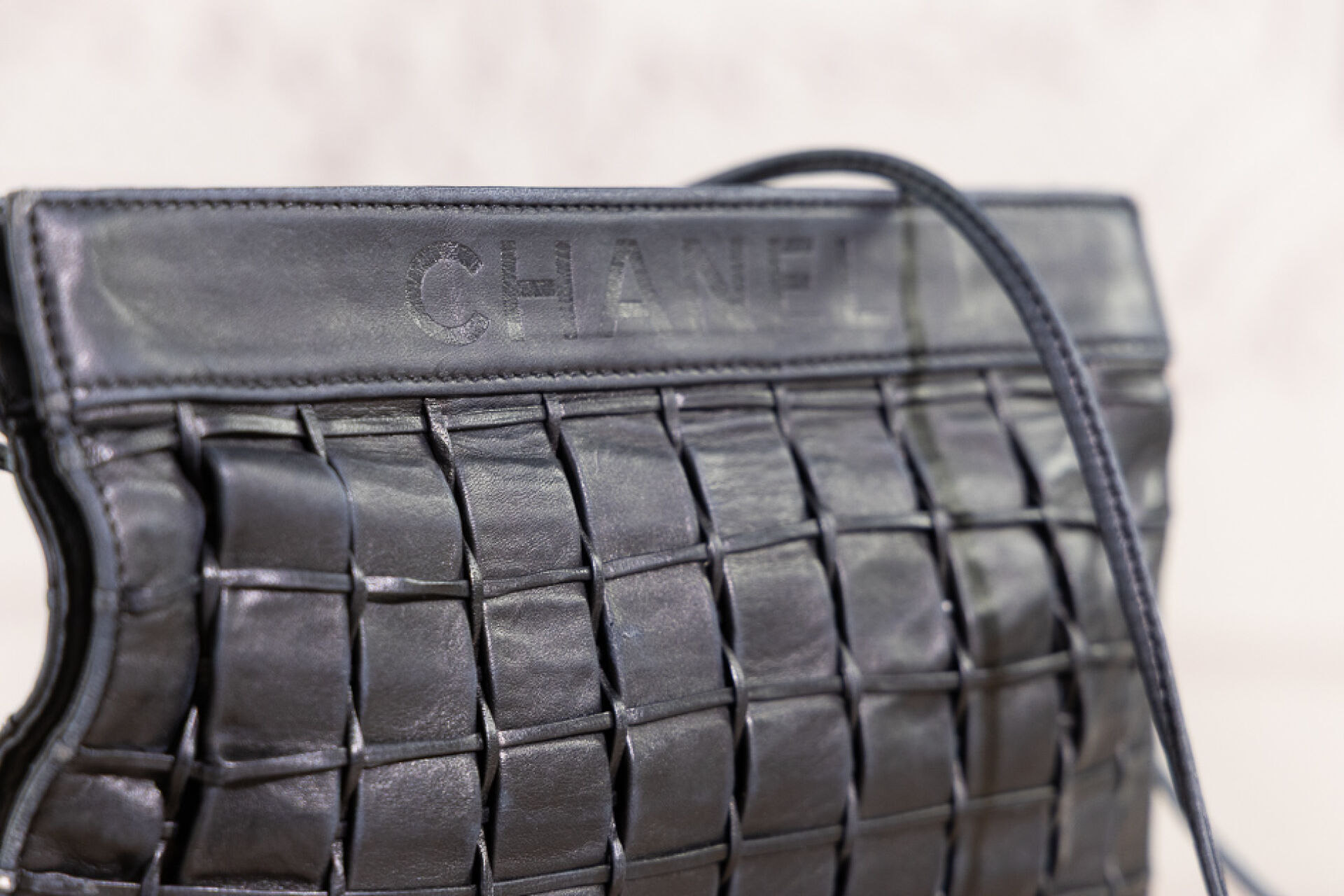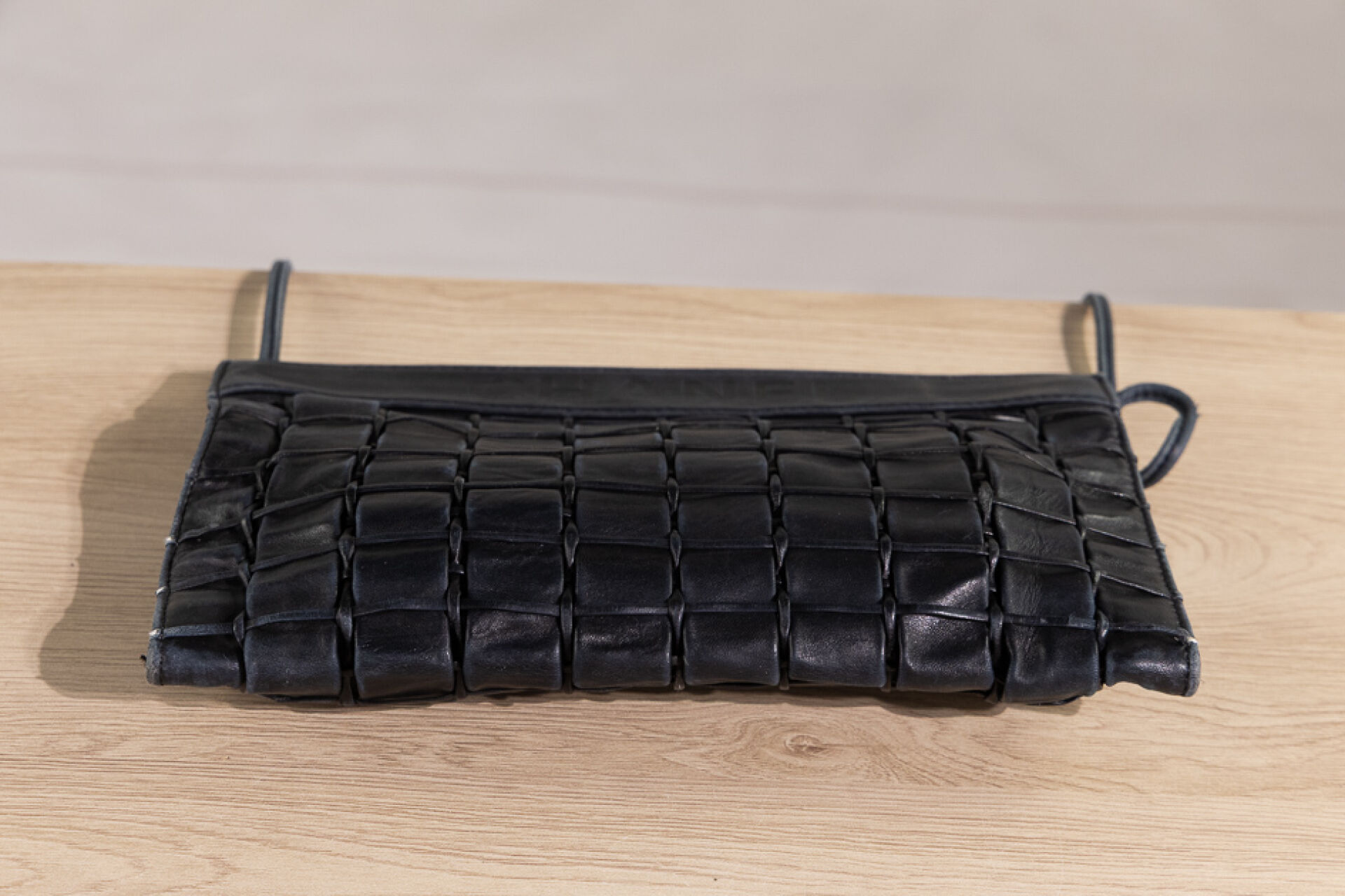 CHANEL - Pochette en cuir noir tressé, anse bandoulière, fermeture aimantée. Long. : Usures