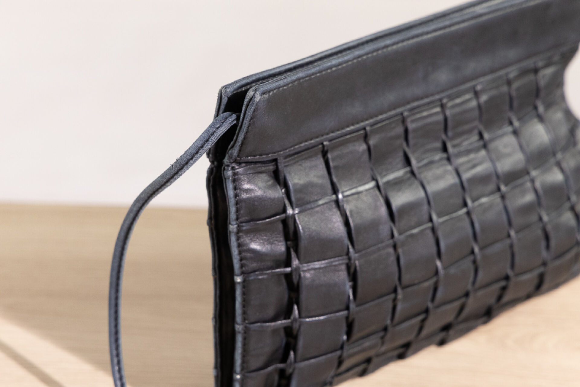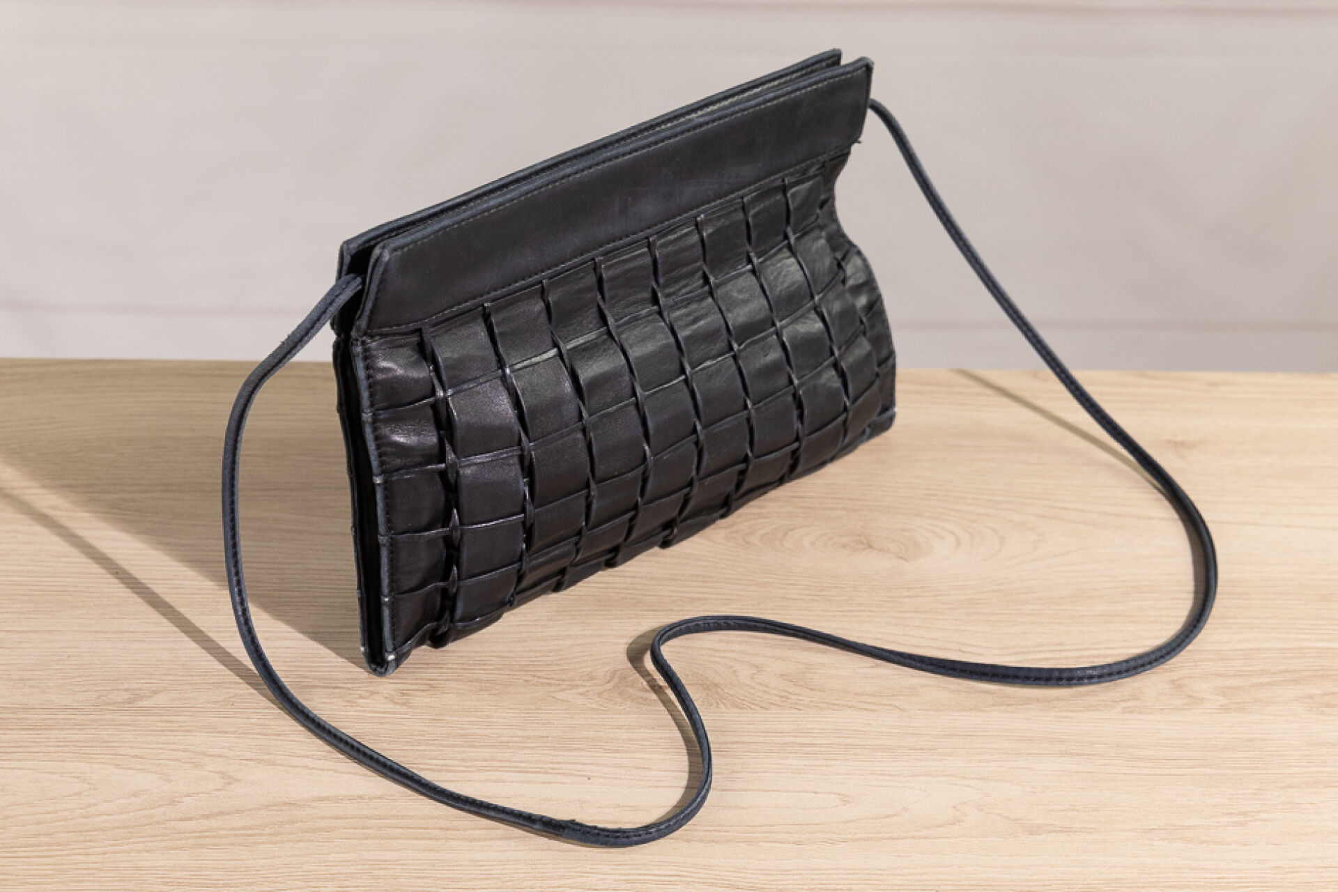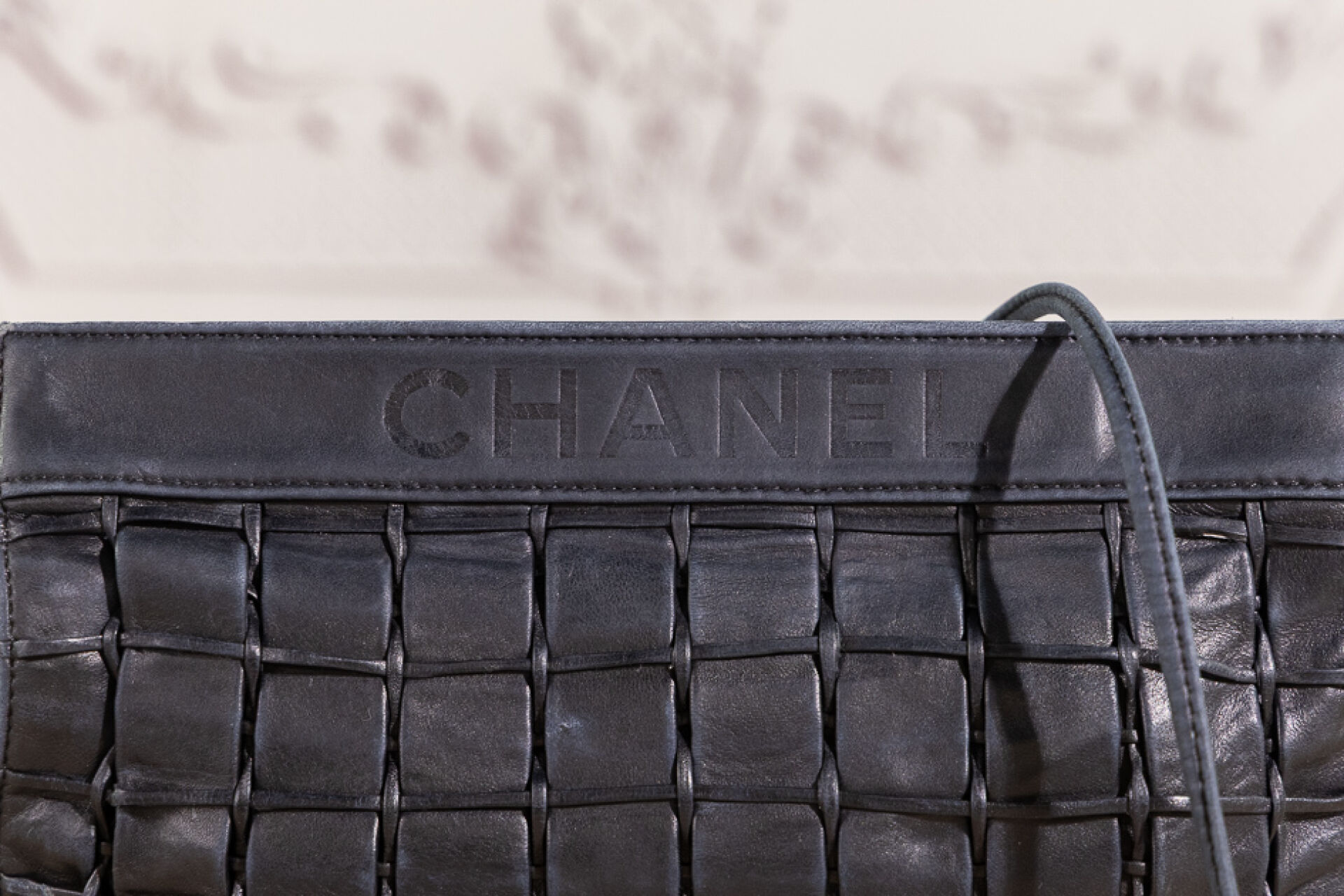 CHANEL - Pochette en cuir noir tressé, anse bandoulière, fermeture aimantée. Long. : Usures