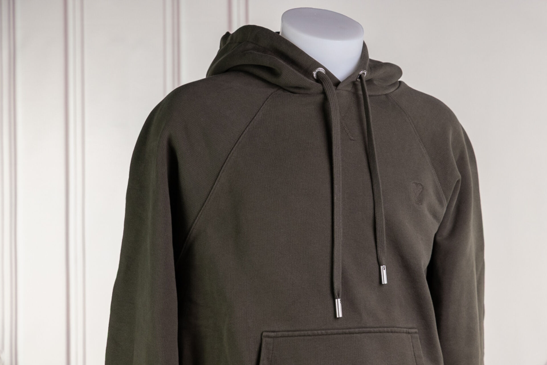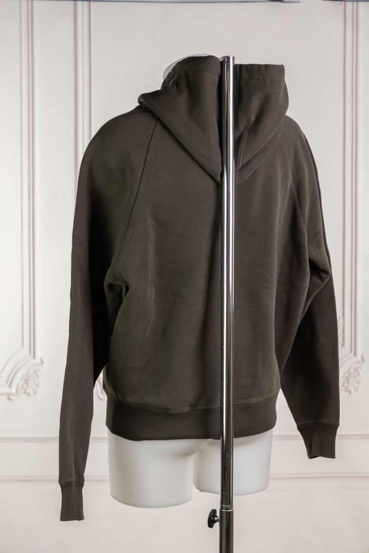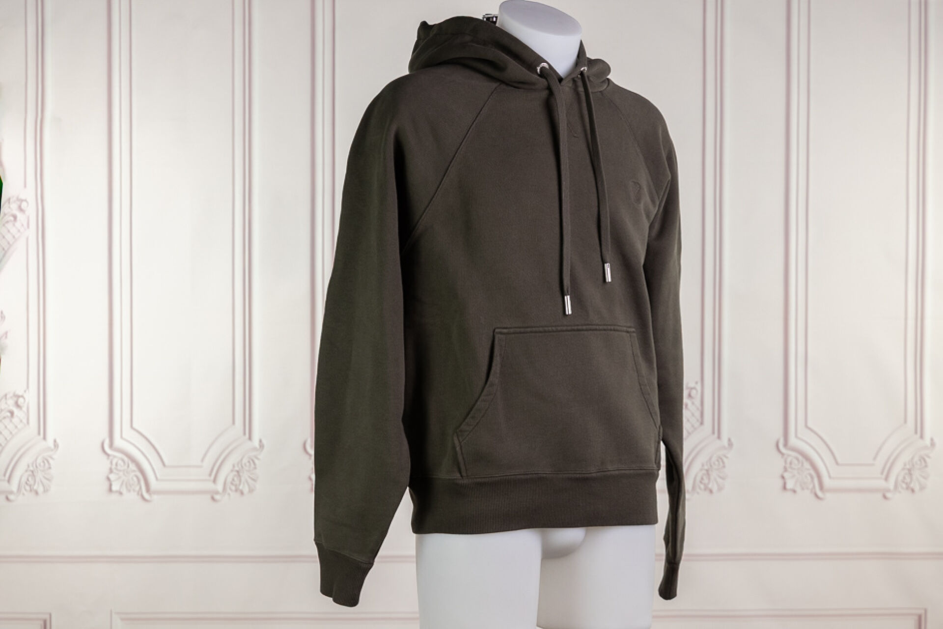 AMI par ALEXANDRE MATIUSSI - Sweat à capuche coulissée en coton café foncé, manches longues raglan, poche kangourou. Taille indiquée M Non porté, étiquette d'origine cependant quelques traces.