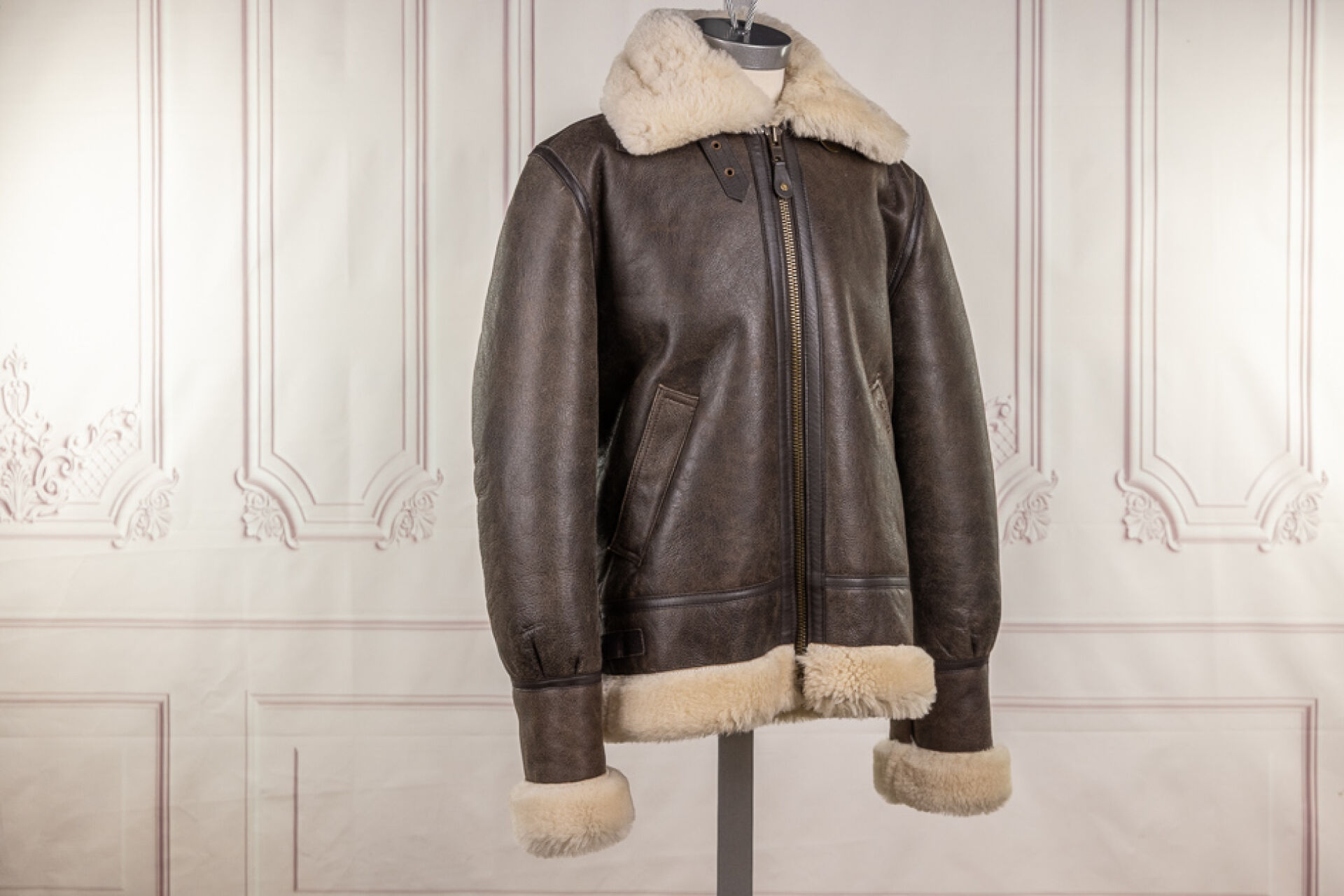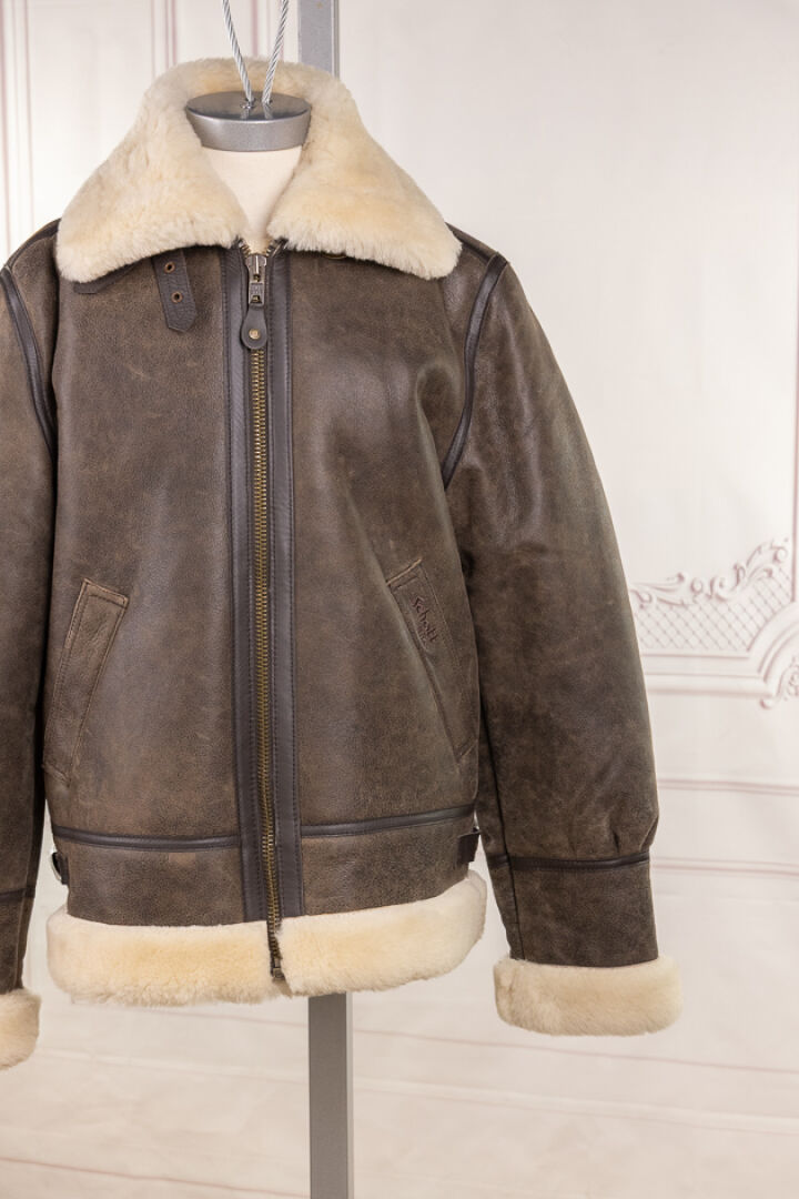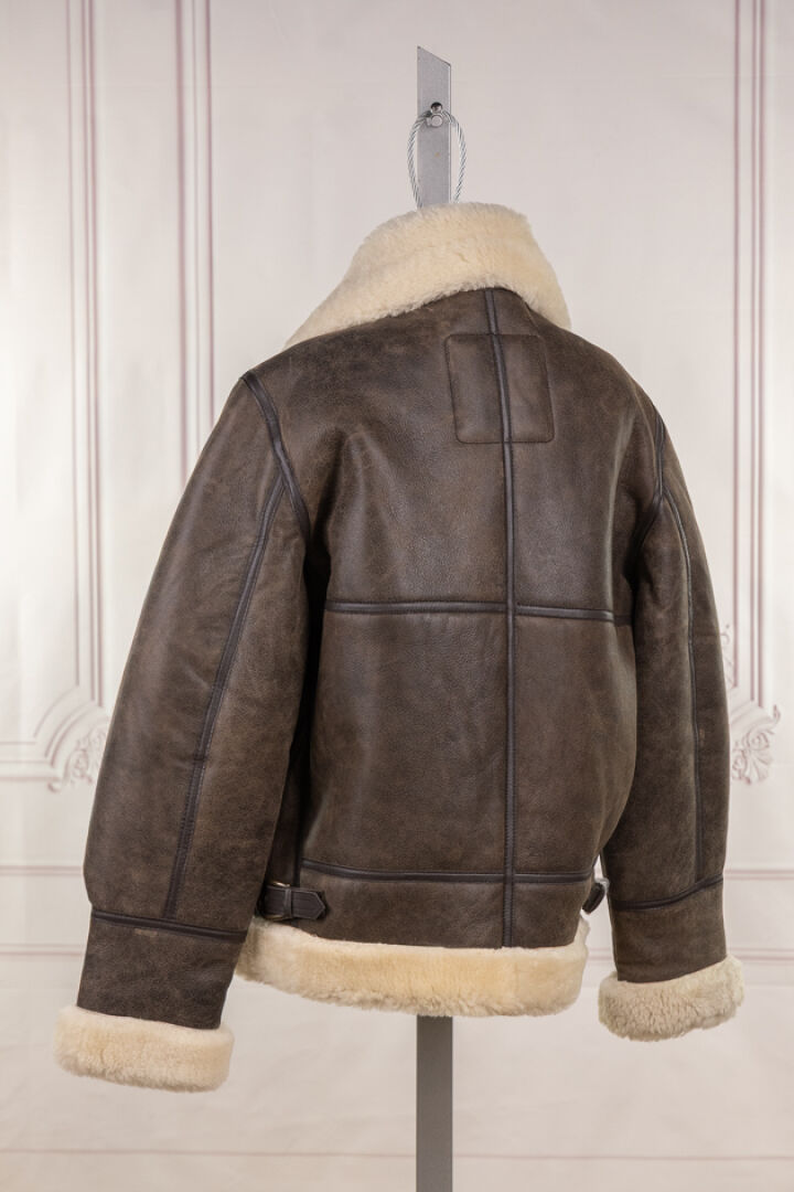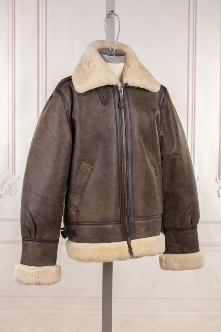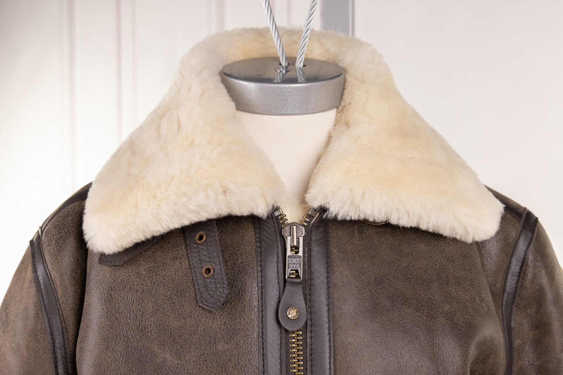 SCHOTT - Blouson en peau lainée marron, col à deux attaches ceinturées, fermeture à glissière, deux poches en biais, manches longues. Taille indiquée M Non portée
