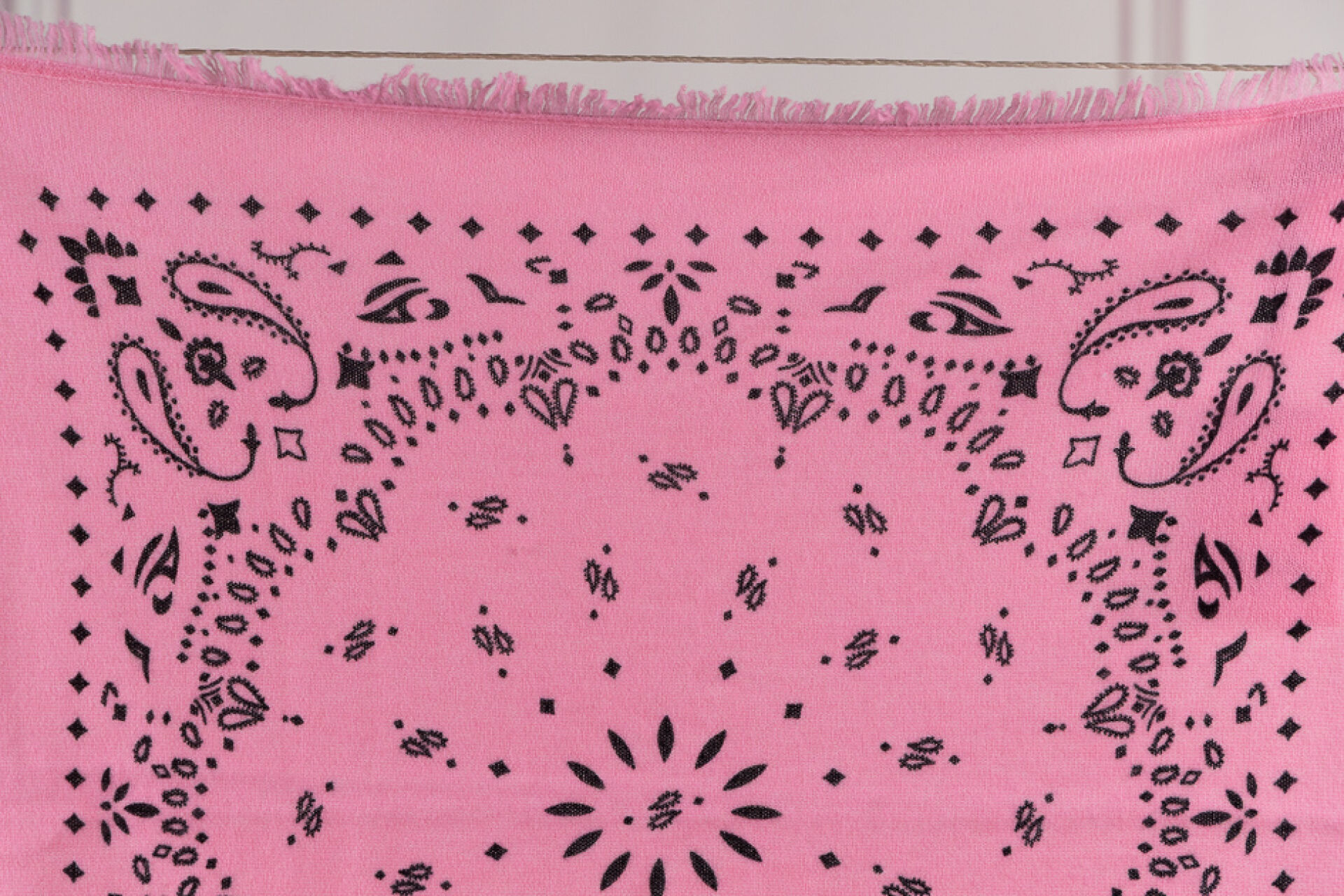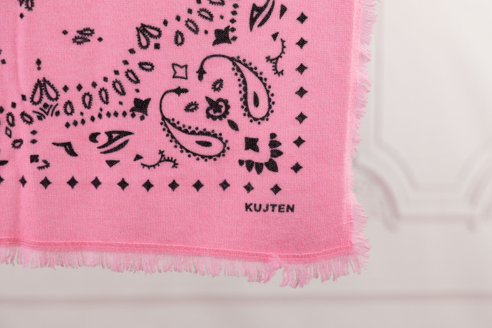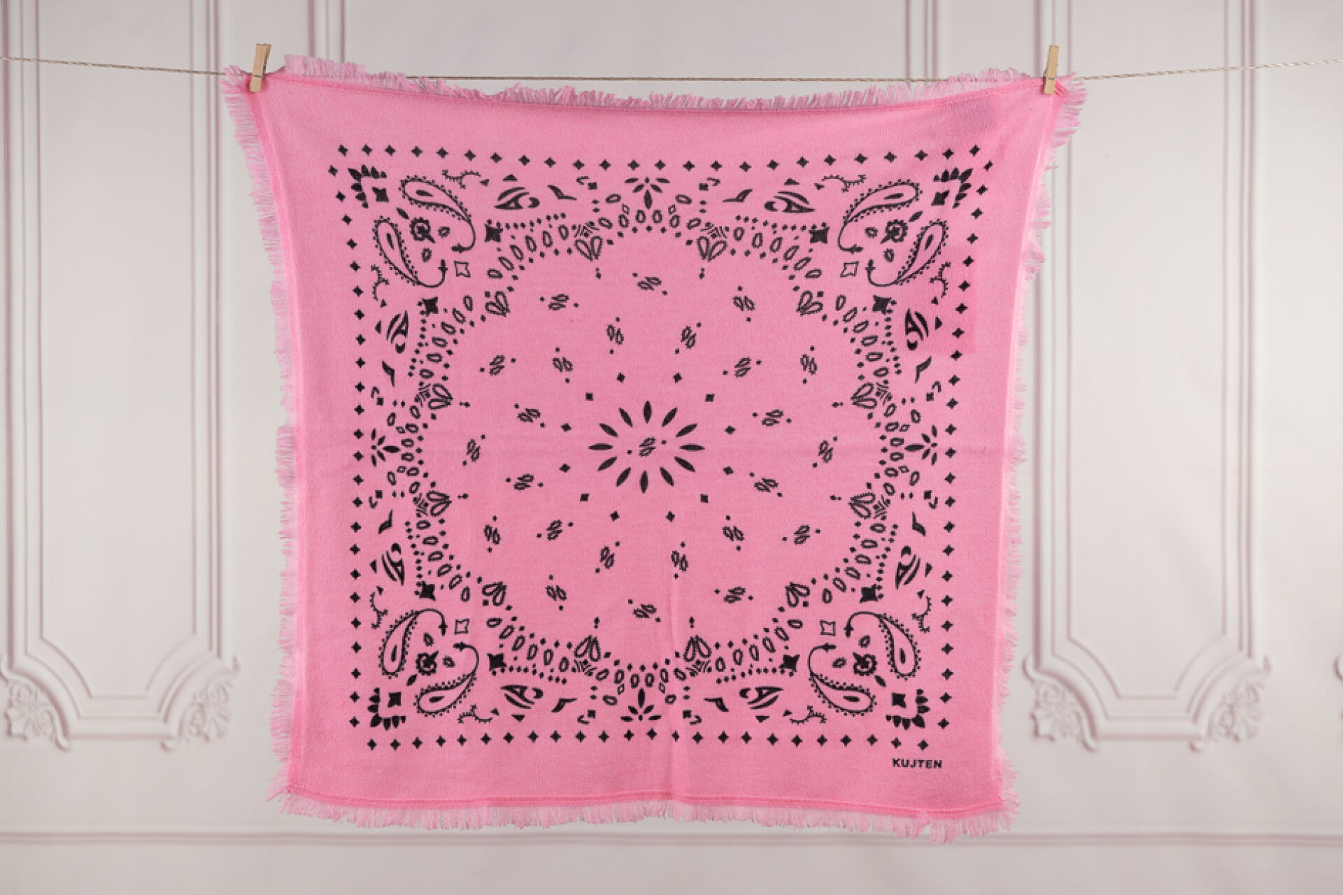 KUJTEN - Petit carré en cachemire rose à bords frangés imprimé bandana noir. Dustbag de la Maison. 56 x 56 cm environ