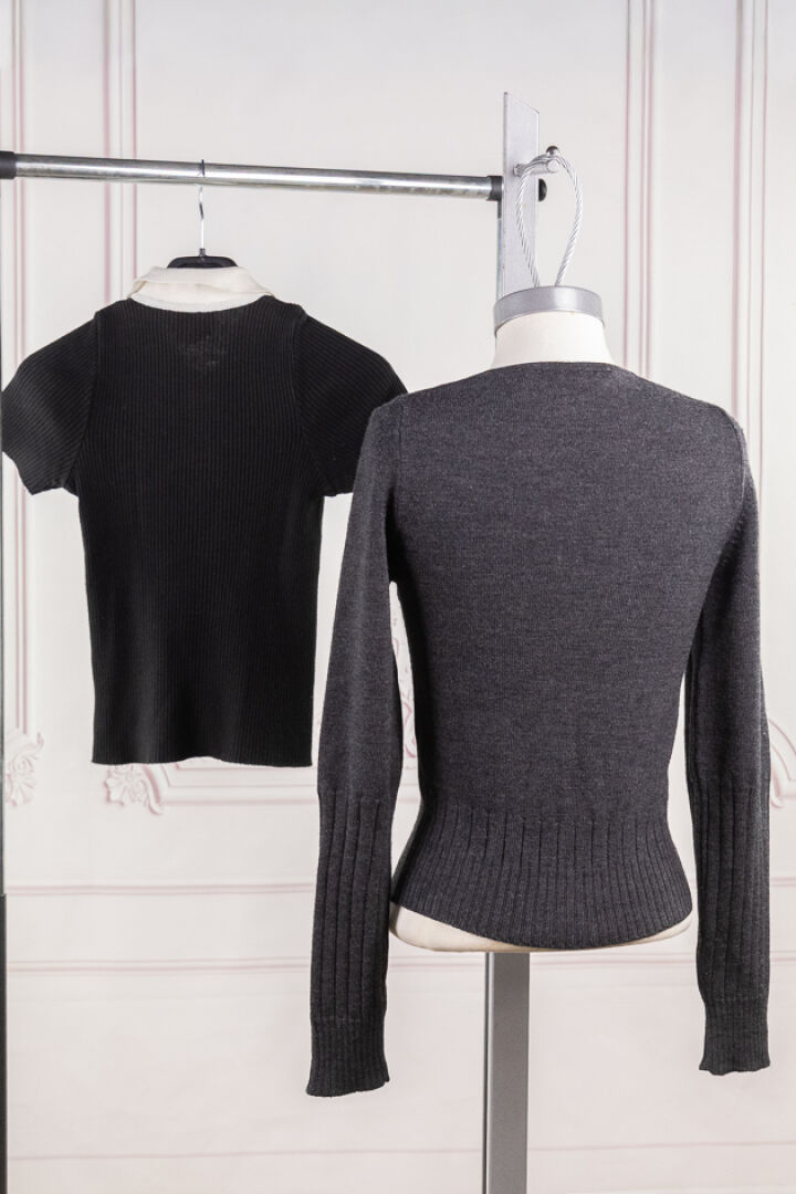 DIRK BIKKEMBERGS - Ensemble comprenant un gilet à un bouton, lainage gris, et un haut noir et blanc à manches courtes, petit col sur boutonnage. Taille supposée S et M (taille petit) Bon état général, petit trou de mite sur le gilet