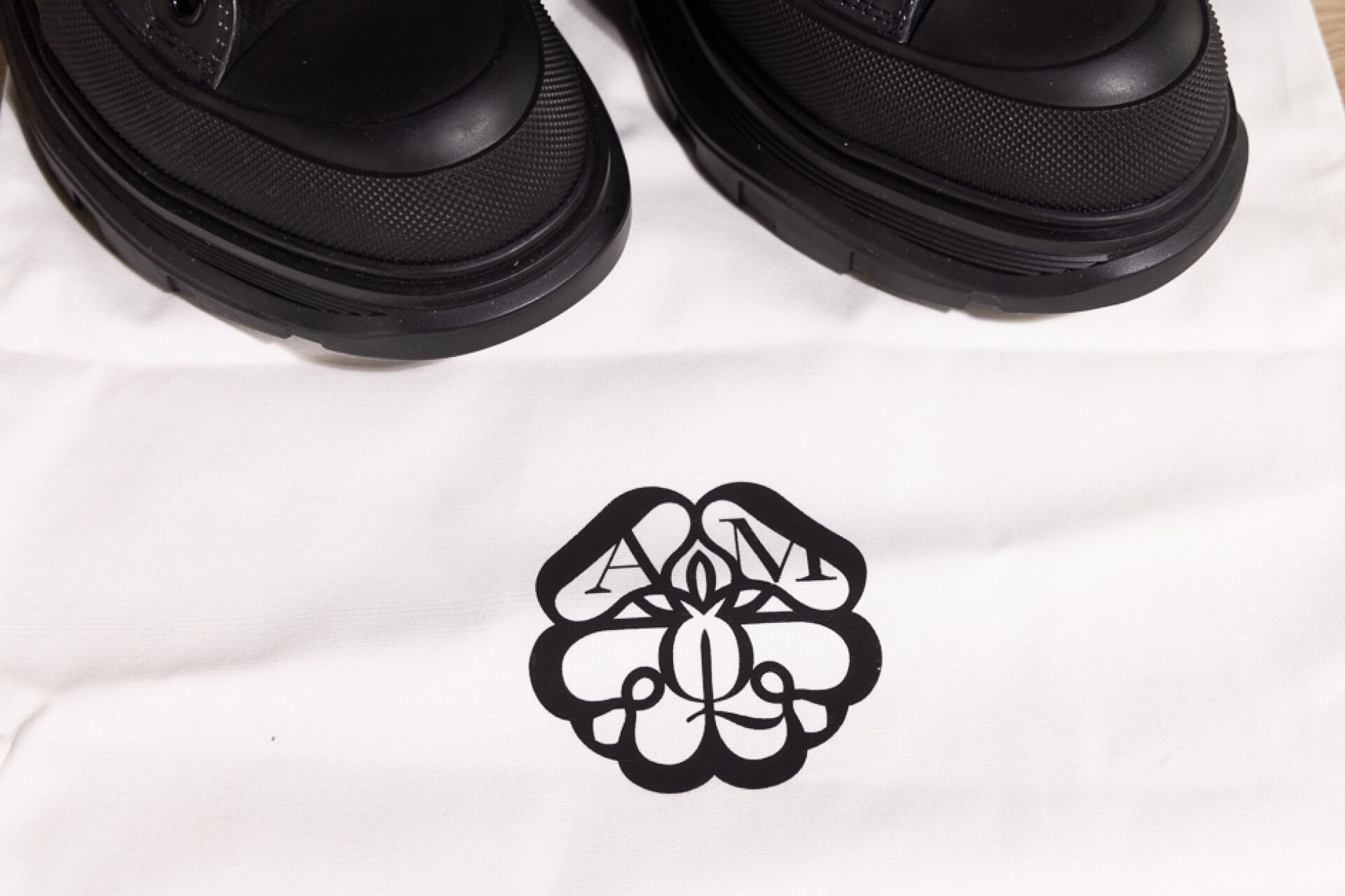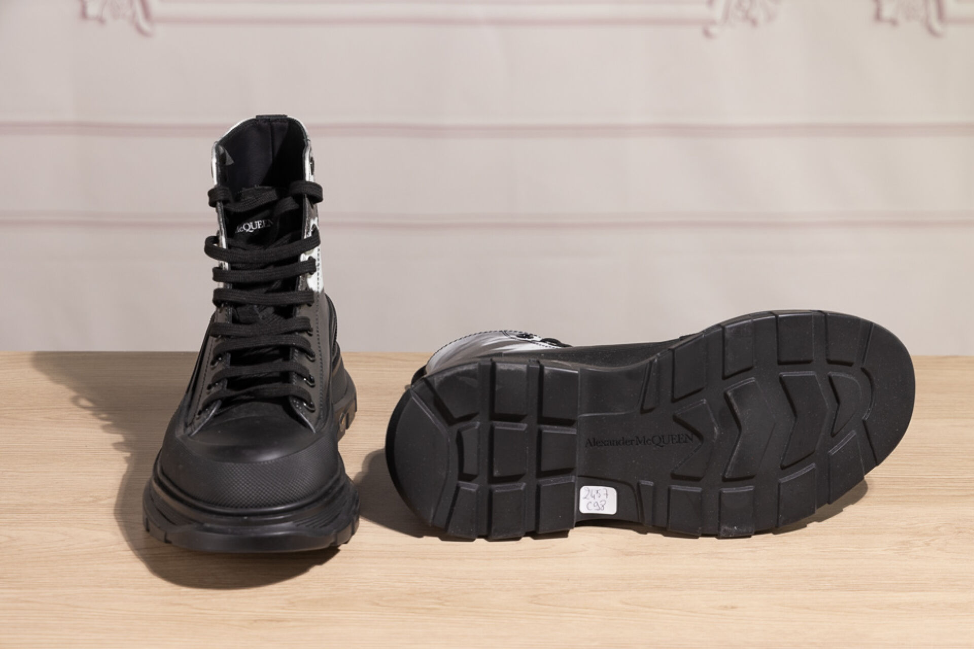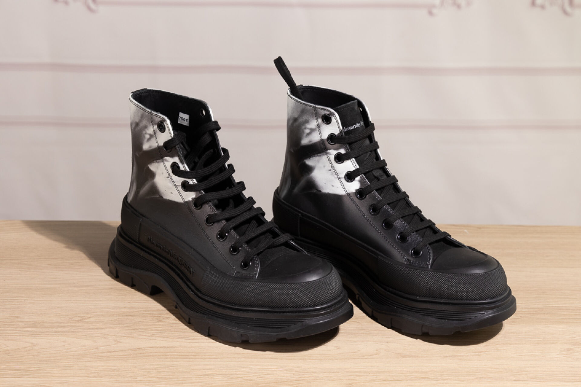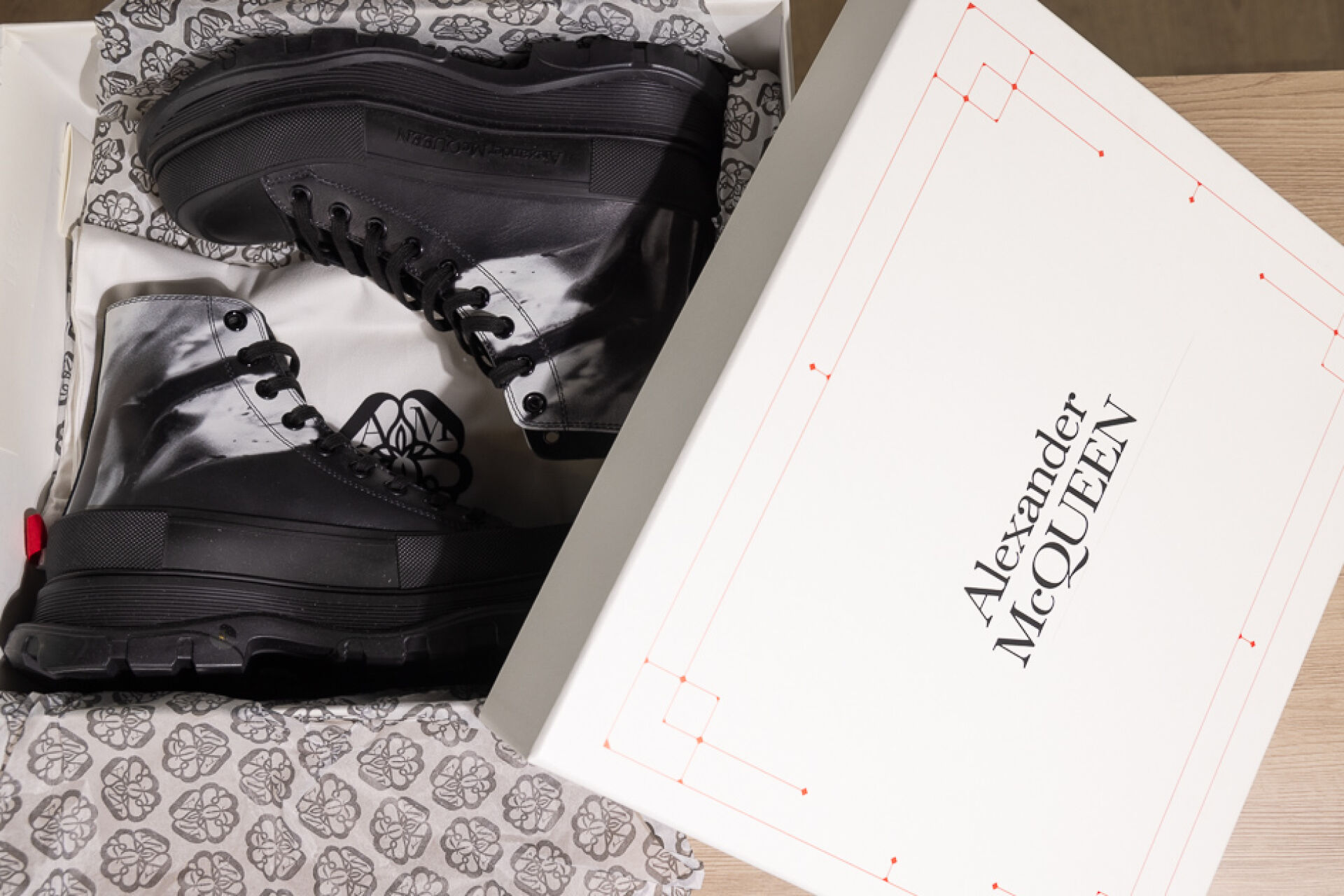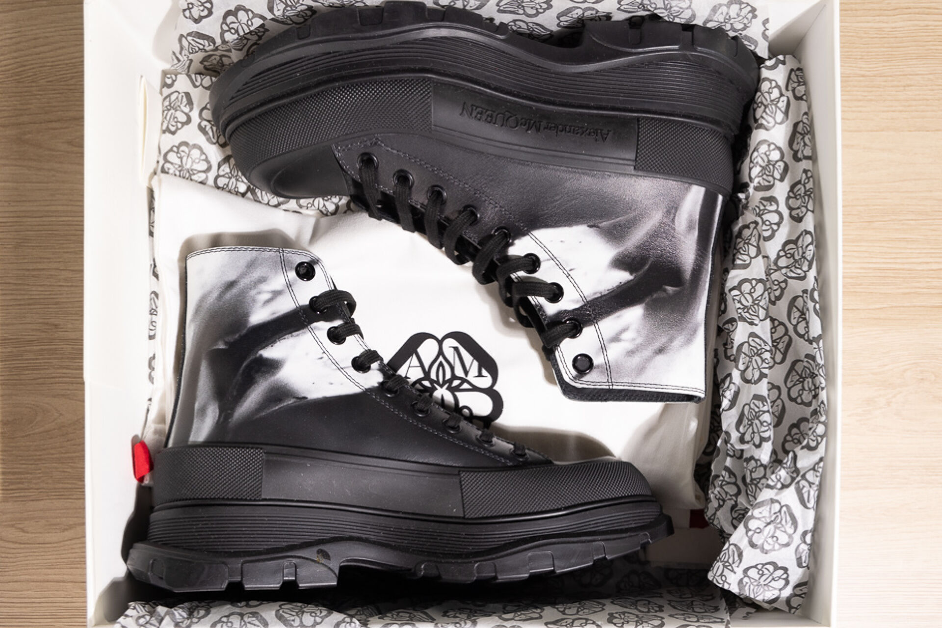 ALEXANDER McQUEEN - Paire de boots à lacets en cuir noir marbré blanc, lacets, importantes semelles à la couleur. Dans leur boite. Pointure Non portées