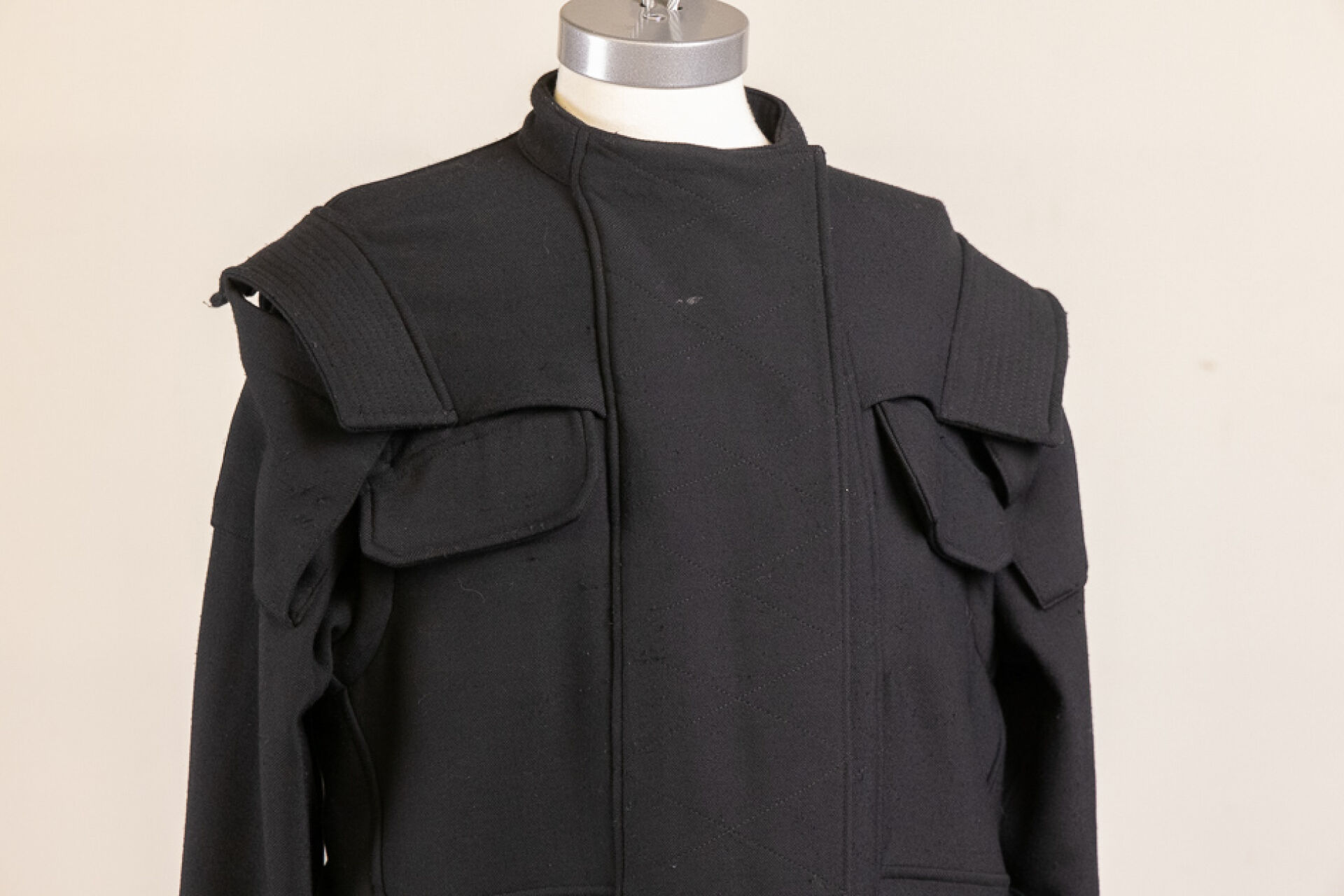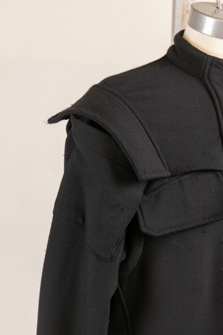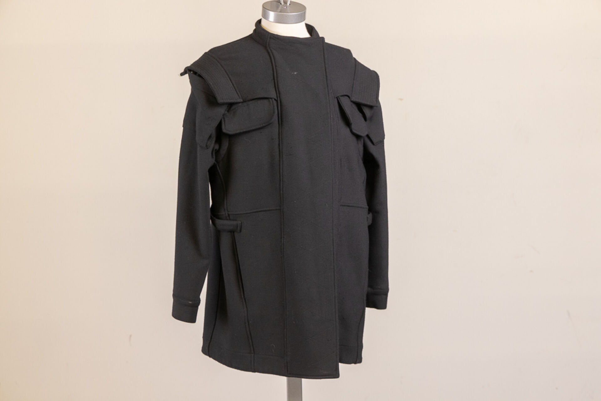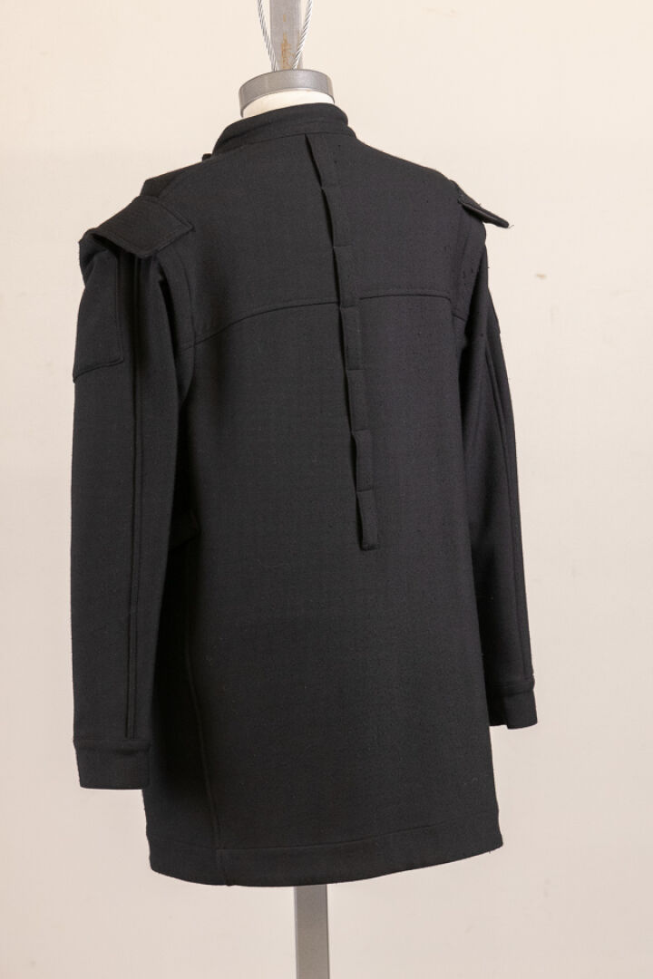 OPENING CEREMONY - Manteau 7/8ème en jersey noir surpiqué, col montant, fermeture à glissière sous patte pression, manches longues amovibles montées à poches aux épaules, deux fausses poches poitrine, deux poches verticales, lien de part et d'autre. Taille indiquée S Fils tirés et tâches