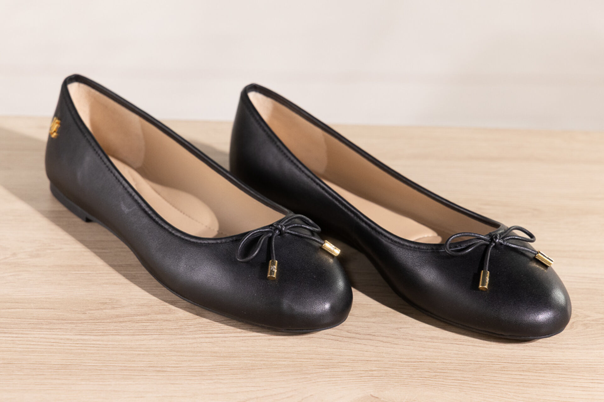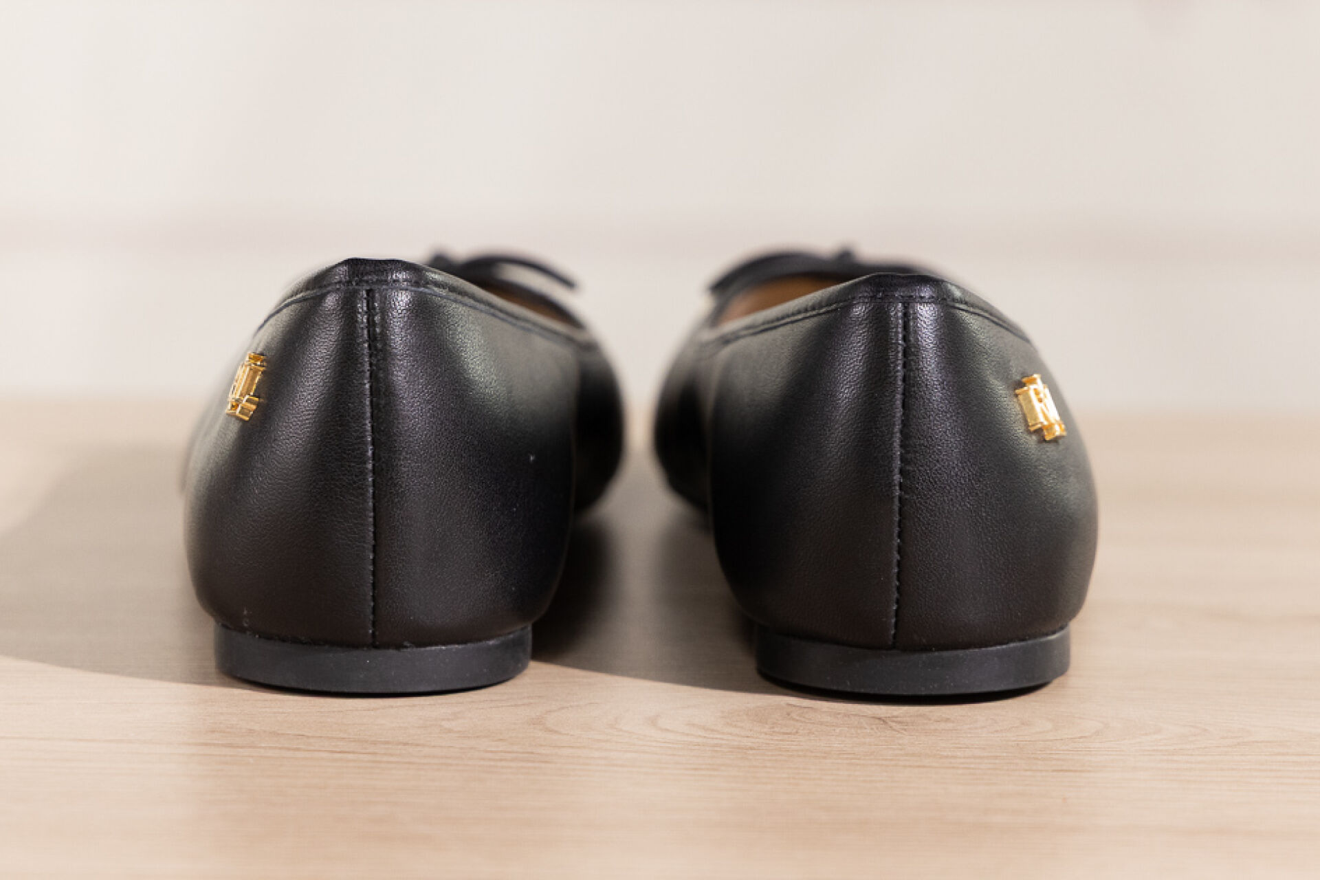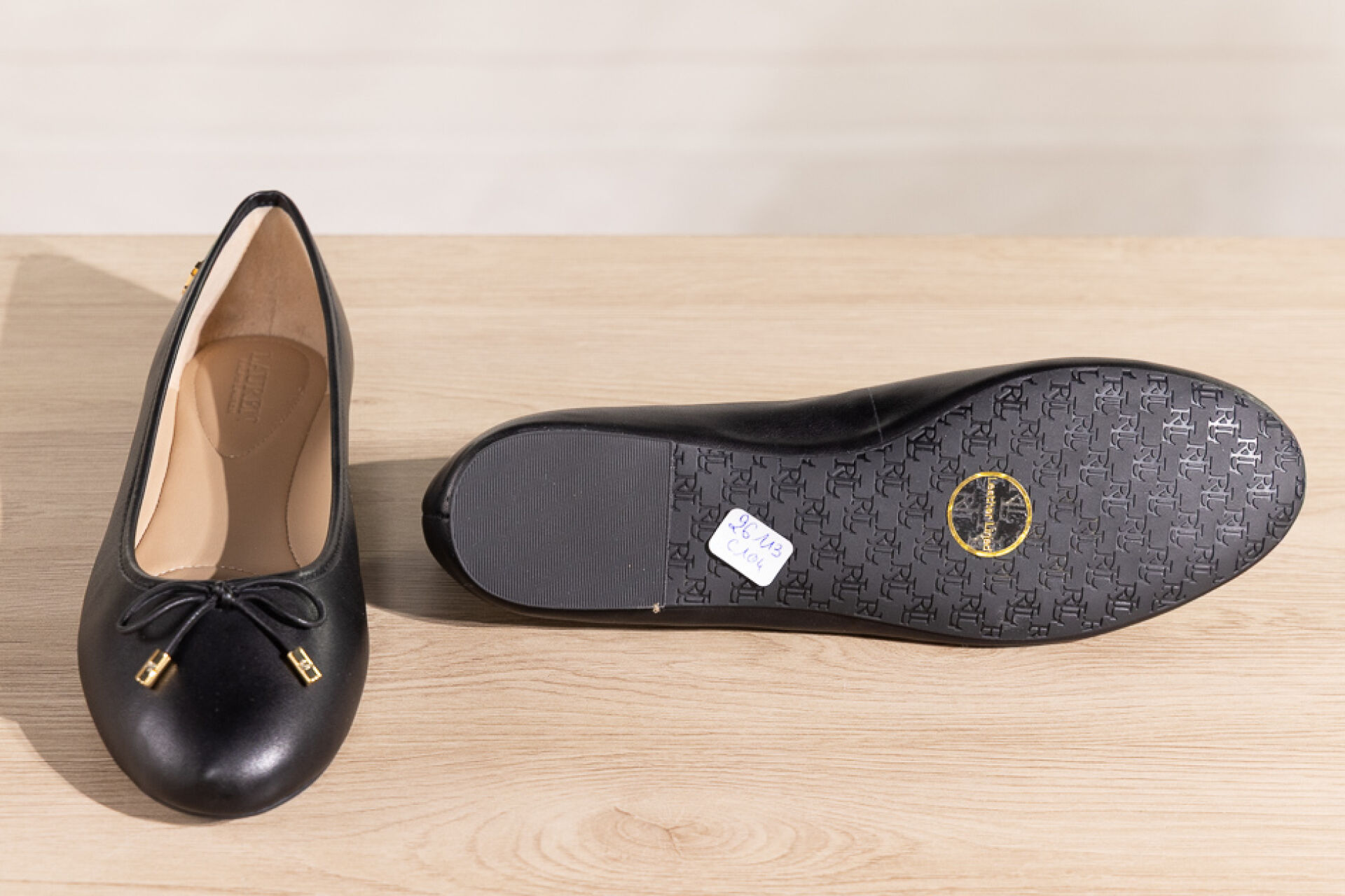 RALPH LAUREN - Paire de ballerines en cuir noir, empeigne rehaussée d'un nœud. Pointure 39 Non portées, étiquette d'origine